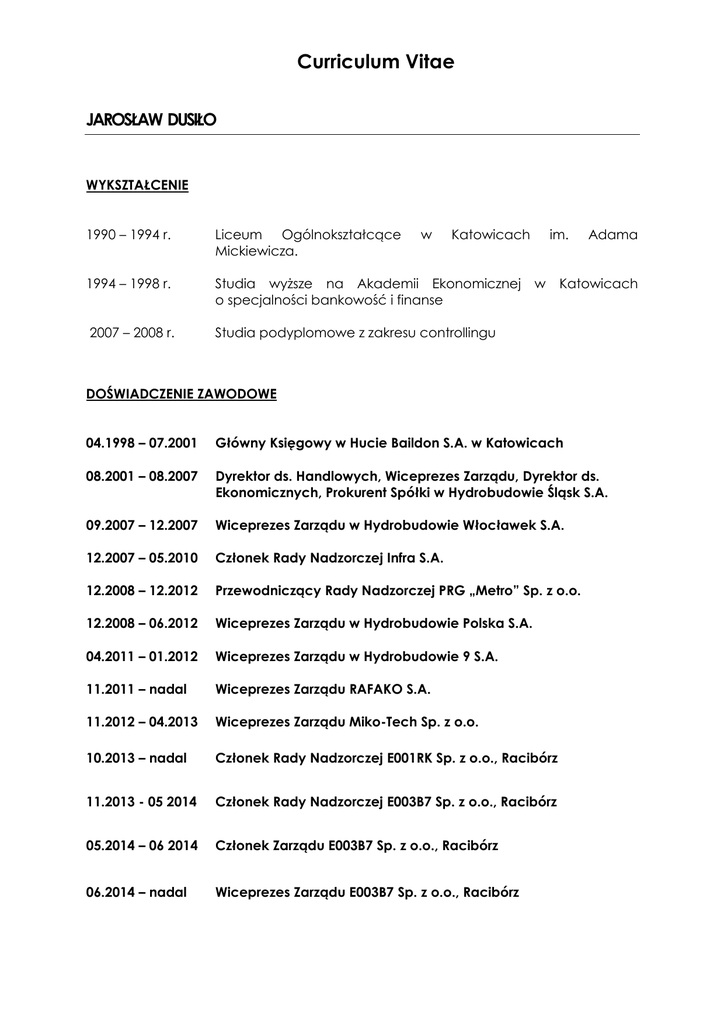Curriculum Vitae JAROSŁAW DUSIŁO WYKSZTAŁCENIE 1990 – 1994 r. Liceum Ogólnokształcące Mickiewicza. w Katowicach 1994 – 1998 r. Studia wyższe na Akademii Ekonomicznej o specjalności bankowość i finanse 2007 – 2008 r. Studia podyplomowe z zakresu controllingu im. w Adama Katowicach DOŚWIADCZENIE ZAWODOWE 04.1998 – 07.2001 Główny Księgowy w Hucie Baildon S.A. w Katowicach 08.2001 – 08.2007 Dyrektor ds. Handlowych, Wiceprezes Zarządu, Dyrektor ds. Ekonomicznych, Prokurent Spółki w Hydrobudowie Śląsk S.A. 09.2007 – 12.2007 Wiceprezes Zarządu w Hydrobudowie Włocławek S.A. 12.2007 – 05.2010 Członek Rady Nadzorczej Infra S.A. 12.2008 – 12.2012 Przewodniczący Rady Nadzorczej PRG „Metro” Sp. z o.o. 12.2008 – 06.2012 Wiceprezes Zarządu w Hydrobudowie Polska S.A. 04.2011 – 01.2012 Wiceprezes Zarządu w Hydrobudowie 9 S.A. 11.2011 – nadal Wiceprezes Zarządu RAFAKO S.A. 11.2012 – 04.2013 Wiceprezes Zarządu Miko-Tech Sp. z o.o. 10.2013 – nadal Członek Rady Nadzorczej E001RK Sp. z o.o., Racibórz 11.2013 - 05 2014 Członek Rady Nadzorczej E003B7 Sp. z o.o., Racibórz 05.2014 – 06 2014 Członek Zarządu E003B7 Sp. z o.o., Racibórz 06.2014 – nadal Wiceprezes Zarządu E003B7 Sp. z o.o., Racibórz KURSY, SZKOLENIA i CERTYFIKATY Szkolenia z zakresu finansów i księgowości, zarządzania projektem według metodologii Prince 2 oraz systemów informatycznych. Certyfikat wydany przez Ministerstwo Finansów uprawniający do samodzielnego prowadzenia ksiąg rachunkowych. JĘZYKI OBCE Język angielski w stopniu komunikatywnym w mowie i piśmie. ZAINTERESOWANIA Muzyka, literatura, sport (tenis, piłka nożna)