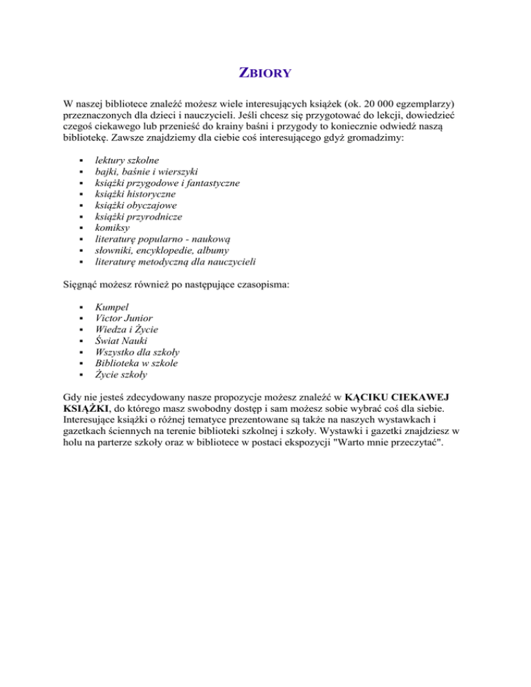 ZBIORY W naszej bibliotece znaleźć możesz wiele interesujących książek (ok. 20 000 egzemplarzy) przeznaczonych dla dzieci i nauczycieli. Jeśli chcesz się przygotować do lekcji, dowiedzieć czegoś ciekawego lub przenieść do krainy baśni i przygody to koniecznie odwiedź naszą bibliotekę. Zawsze znajdziemy dla ciebie coś interesującego gdyż gromadzimy: lektury szkolne bajki, baśnie i wierszyki książki przygodowe i fantastyczne książki historyczne książki obyczajowe książki przyrodnicze komiksy literaturę popularno - naukową słowniki, encyklopedie, albumy literaturę metodyczną dla nauczycieli Sięgnąć możesz również po następujące czasopisma: Kumpel Victor Junior Wiedza i Życie Świat Nauki Wszystko dla szkoły Biblioteka w szkole Życie szkoły Gdy nie jesteś zdecydowany nasze propozycje możesz znaleźć w KĄCIKU CIEKAWEJ KSIĄŻKI, do którego masz swobodny dostęp i sam możesz sobie wybrać coś dla siebie. Interesujące książki o różnej tematyce prezentowane są także na naszych wystawkach i gazetkach ściennych na terenie biblioteki szkolnej i szkoły. Wystawki i gazetki znajdziesz w holu na parterze szkoły oraz w bibliotece w postaci ekspozycji "Warto mnie przeczytać".