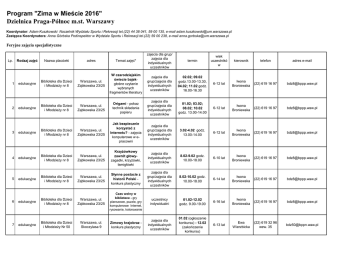 Program "Zima w Mieście 2016" Dzielnica Praga-Północ m.st. Warszawy Koordynator: Adam Kuszkowski Naczelnik Wydziału Sportu i Rekreacji tel.(22) 44 38 041, 59 00 135, e-mail [email protected] Zastępca Koordynatora: Anna Górbska Podinspektor w Wydziale Sportu i Rekreacji tel.(22) 59 00 238, e-mail [email protected] Feryjne zajęcia specjalistyczne Lp. adres Temat zajęć* zajecia dla grup/ zajęcia dla indywidualnych uczestników Warszawa, ul. Ząbkowska 23/25 W czarodziejskim świecie bajekgłośne czytanie wybranych fragmentów literatury zajęcia dla grup/zajęcia dla indywidualnych uczestników 02.02; 09.02 godz.13.00-13.30, 04.02; 11.02 godz. 16.00-16.30 6-12 lat Iwona Broniewska (22) 619 16 97 [email protected] Warszawa, ul. Ząbkowska 23/25 Origami - pokaz technik składania papieru zajęcia dla grup/zajęcia dla indywidualnych uczestników 01.02; 03.02; 08.02; 10.02 godz. 13.00-14.00 6-12 lat Iwona Broniewska (22) 619 16 97 [email protected] edukacyjne Biblioteka dla Dzieci i Młodzieży nr 8 Warszawa, ul. Ząbkowska 23/25 Jak bezpiecznie korzystać z Internetu? - zajęcia konputerowe w epracowni zajęcia dla grup/zajęcia dla indywidualnych uczestników 3.02-4.02 godz. 13.00-14.00 6-12 lat Iwona Broniewska (22) 619 16 97 [email protected] edukacyjne Biblioteka dla Dzieci i Młodzieży nr 8 Warszawa, ul. Ząbkowska 23/25 Krzyżówkowy zawrót głowyzagadki, krzyżówki, łamigłówki zajęcia dla indywidualnych uczestników 8.02-9.02 godz. 10.00-18.00 6-10 lat Iwona Broniewska (22) 619 16 97 [email protected] edukacyjne Biblioteka dla Dzieci i Młodzieży nr 8 Warszawa, ul. Ząbkowska 23/25 Słynne postacie z historii Polski konkurs plastyczny zajęcia dla grup/zajęcia dla indywidualnych uczestników 8.02-10.02 godz. 10.00-18.00 6-14 lat Iwona Broniewska (22) 619 16 97 [email protected] edukacyjne Biblioteka dla Dzieci i Młodzieży nr 8 Warszawa, ul. Ząbkowska 23/25 Czas wolny w bibliotece - gry planszowe, puzzle, gry komputerowe Internet, rysowanie, kolorowanie uczestnicy indywidualni 01.02-12.02 godz. 9.00-19.00 6-16 lat Iwona Broniewska (22) 619 16 97 [email protected] edukacyjne Biblioteka dla Dzieci i Młodzieży Nr 50 Warszawa, ul. Skoczylasa 9 Zimowy krajobraz konkurs plastyczny zajęcia dla indywidualnych uczestników 01.02 (ogłoszenie konkursu) - 12.02 (zakończenie konkursu) 6-13 lat Ewa Wierzbicka (22) 619 32 96 wew. 35 [email protected] Rodzaj zajęć Nazwa placówki 1 edukacyjne Biblioteka dla Dzieci i Młodzieży nr 8 2 edukacyjne Biblioteka dla Dzieci i Młodzieży nr 8 3 4 5 6 7 termin wiek uczestnikó w kierownik telefon adres e-mail 8 edukacyjne Biblioteka dla Dzieci i Młodzieży Nr 50 Warszawa, ul. Skoczylasa 9 Bawimy się z Koszmarnym Karolkiem krzyżówki, rebusy,quizy 9 edukacyjne Biblioteka dla Dzieci i Młodzieży Nr 50 Warszawa, ul. Skoczylasa 9 Stoliczek, rysowniczek "Zima" kolorowanki, rysowanie kredkami, pastelami zajęcia dla indywidualnych uczestników 01.02; 03.02; 05.02; 08.02; 10.02; 12.02 godz. 13.00-15.00 6-12 lat Ewa Wierzbicka (22) 619 32 96 wew. 35 [email protected] edukacyjne Biblioteka dla Dzieci i Młodzieży Nr 50 Warszawa, ul. Skoczylasa 9 W czarodziejskim świecie bajek słuchanie wybranych baśni (książka mówiona) zajęcia dla indywidualnych uczestników 01.02-12.02 godz. 11.00-11.30 6-12 lat Ewa Wierzbicka (22) 619 32 96 wew. 35 [email protected] edukacyjne Biblioteka dla Dzieci i Młodzieży Nr 50 Warszawa, ul. Skoczylasa 9 Czas wolny w bibliotece - gry planszowe, puzzle, gry komputerowe Internet, rysowanie, kolorowanie uczestnicy indywidualni 01.02-12.02 godz. 9.00-19.00 6-16 lat Ewa Wierzbicka (22) 619 32 96 wew. 35 [email protected] Warszawa, ul. Radzymińska 50 Podróż w krainę baśni - Zimowe opowieści- głośne czytanie wybranych fragmentów literatury pięknej zajęcia dla grup/zajęcia dla indywidualnych uczestników 01.02-12.02 godz. 14.00-14.30 6-16 lat Katarzyna Wasiak (22) 818 49 00 [email protected] uczestnicy indywidualni 01.02-12.02 godz. 10.00-18.00 6-15 lat Katarzyna Wasiak (22) 818 49 00 [email protected] 10 11 12 edukacyjne Biblioteka dla Dzieci i Młodzieży Nr 59 zajęcia dla indywidualnych uczestników 02.02; 04.02; 09.02; 11.02 godz. 14.00-15.00 7-9 lat Ewa Wierzbicka (22) 619 32 96 wew. 35 [email protected] 13 edukacyjne Biblioteka dla Dzieci i Młodzieży Nr 59 Warszawa, ul. Radzymińska 50 Czas wolny w bibliotece - gry planszowe, puzzle, gry komputerowe, Internet, rysowanie, kolorowanie 14 edukacyjne Biblioteka dla Dzieci i Młodzieży Nr 59 Warszawa, ul. Radzymińska 50 Zimowy bałwanek konkurs plastyczny zajęcia dla grup/zajęcia dla indywidualnych uczestników 01.02 (ogłoszenie konkursu) - 12.02 (zakończenie konkursu) 6-15 lat Katarzyna Wasiak (22) 818 49 00 [email protected] uczestnicy indywidualni 02.02; 04.02; 09.02; 11.02 w godz. 11.00-12.00 9-15 lat Katarzyna Wasiak (22) 818 49 00 [email protected] zajęcia dla grup zajęcia dla uczestników indywidualnych 01.02 12.02.2016r. godz. do uzgodnienia 12-19 lat Anna Czołpińska (22) 619 32 96 [email protected] 15 16 edukacyjne Biblioteka dla Dzieci i Młodzieży Nr 59 Warszawa, ul. Radzymińska 50 Zima - warsztaty komputerowe wyszukiwanie informacji, tworzenie prezentacji edukacyjne Czytelnia Naukowa Nr X Warszawa, ul. Skoczylasa 9 Savoir vivre w cyfrowym świeciezajęcia edukacyjne 17 edukacyjne Wypożyczalnia dla Dorosłych i Młodzieży nr 4 Warszawa, ul. Radzymińska 50 Zostań mistrzem kalawiatury warsztaty komputerowe indywidualne 01.02; 03.02; 05.02; 08.02; 10.02; 12.02 godz. do uzgodnienia 16-19 lat Adrianna Asztel (22) 818 75 65 [email protected] Warszawa, ul. Radzymińska 50 Jak i gdzie? - kurs efektywnego wyszukiwania informacji w Internecie, warszaty komputerowe indywidualne 02.02; 04.02; 09.02; 11.02; 12.02 godz. do uzgodnienia 16-19 lat Adrianna Asztel (22) 818 75 65 [email protected] Strzelecka 21/25 Sporty zimowe konkurs plastyczny . uczestnicy indywidualni 01.02 (ogłoszenie konkursu) - 12.02 (zakończenie konkursu) 6-12