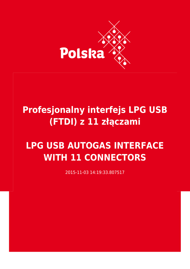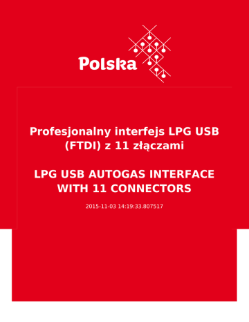 Profesjonalny interfejs LPG USB (FTDI) z 11 złączami LPG USB AUTOGAS INTERFACE WITH 11 CONNECTORS 2015-11-03 14:19:33.807517 2 3 Это предложение не является торговой информации Adres instytucji/firmy ogłaszającej ofertę CCY - Marek Kołakowski 80-463 Gdańsk . Skarżyńskiego 7 . Poland Контактное лицо Paweł Szymański [email protected] Тел: [email protected] www.ccy.pl Описание порядка We offer a new, professional diagnostic interface for LPG with all of 11 connectors. The device produced in Poland by CCY. By using interface you can change all settings of gas computer. Device is compatible with all types of LPG installations. (look at connectors table). Interface working at all of Windows versions, Linux and MAC. Nabywcy z zagranicy ● ● ● ● ● ● Belgia Białoruś Bośnia i Hercegowina Burundi Chile Chorwacja 4 ● ● ● ● ● ● ● ● ● ● ● ● ● ● ● ● ● ● ● ● ● ● ● ● ● ● Cypr Czarnogóra Francja Gibraltar Grecja Gwinea Bissau Hiszpania Indie Irlandia Płn. Litwa Łotwa Malezja Mołdawia Monako Polska Portugalia Rosja Serbia Słowacja Słowenia Turcja Ukraina USA Węgry Wielka Brytania Włochy код CPV ● Electrical equipment and apparatus Вложения 5 nawww.JPG Тип предложения продажа Срок для получения тендеров 01.05.2016 Действительно с 03.11.2015 Отрасли Handel Transport i logistyka Elektronika użytkowa Maszyny i urządzenia Возможный объем производства 1000 Минимальная стоимость контракта 300.00 Валюта 6 Покупатель за рубежом ДА 7