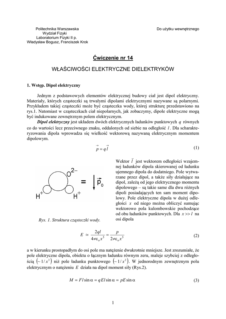 Politechnika Warszawska Wydział Fizyki Laboratorium Fizyki II p. Władysław Bogusz, Franciszek Krok Do użytku wewnętrznego Ćwiczenie nr 14 WŁAŚCIWOŚCI ELEKTRYCZNE DIELEKTRYKÓW 1. Wstęp. Dipol elektryczny Jednym z podstawowych elementów elektrycznej budowy ciał jest dipol elektryczny. Materiały, których cząsteczki są trwałymi dipolami elektrycznymi nazywane są polarnymi. Przykładem takiej cząsteczki może być cząsteczka wody, której strukturę przedstawiono na rys.1. Natomiast w cząsteczkach ciał niepolarnych, jak zobaczymy, dipole elektryczne mogą być indukowane zewnętrznym polem elektrycznym. Dipol elektryczny jest układem dwóch elektrycznych ładunków punktowych q równych co do wartości lecz przeciwnego znaku, oddalonych od siebie na odległość l . Dla scharakteryzowania dipola wprowadza się wielkość wektorową nazywaną elektrycznym momentem dipolowym. → → p = ql (1) r Wektor l jest wektorem odległości wzajemnej ładunków dipola skierowanej od ładunku ujemnego dipola do dodatniego. Pole wytwarzane przez dipol, a także siły działające na dipol, zależą od jego elektrycznego momentu dipolowego – są takie same dla dwu różnych dipoli posiadających ten sam moment dipolowy. Pole elektryczne dipola w dużej odległości x od niego można obliczyć sumując wektorowo pola kulombowskie pochodzące od obu ładunków punktowych. Dla x >> l na osi dipola Rys. 1. Struktura cząsteczki wody. E ≃ 2ql p = 3 4πε o x 2πε o x 3 (2) a w kierunku prostopadłym do osi pole ma natężenie dwukrotnie mniejsze. Jest zrozumiałe, że pole elektryczne dipola, obiektu o łącznym ładunku równym zeru, maleje szybciej z odległością ~ 1 / x 3 niż pole ładunku punktowego ~ 1 / x 2 . W jednorodnym zewnętrznym polu elektrycznym o natężeniu E działa na dipol moment siły (Rys.2). ( ) ( ) M = F l sin α = q E l sin α = pE sin α 1 (3) który możemy zapisać w postaci wektorowej → → → M = p×E (4) Jeśli dipol elektryczny jest swobodny to zewnętrzne pole ustawi go w kierunku zgodnym z r r polem (zwrot p zgodny z E ). Obrót dipola w zewnętrznym polu elektrycznym wymaga wykonania pracy ∆W = ∫ M dα = ∫ pE sin α dα = Rys. 2. Dipol w polu jednorodnym. → → (5) = − pE cos α = − p ⋅ E Można przyjąć, że to wyrażenie podaje wartość energii potencjalnej dipola w zewnętrznym polu elektrycznym. Wtedy dipol tworzy z polem kąt α = 0 i ma energię potencjalną najmniejszą: U min = − pE . Przy kącie α = π / 2 energia potencjalna będzie miała wartość zerową, a przy α = π energia potencjalna wyniesie: U max = pE . W polu zewnętrznym niejednorodnym swobodny dipol zostanie najpierw obrócony do pokrycia się zwrotów momentu dipolowego i pola i wtedy będzie wciągany do obszaru gdzie pole jest silniejsze (rys.3). Załóżmy, że w środku dipola natężenie pola równe jest E . Wtedy w miejscach gdzie znajdują się ładunki natężenie pola równe jest E1 = E + dE l dx 2 oraz E 2 = E − dE l dx 2 (6) Siła działająca na dipol będzie zatem równa F = F1 + F2 = dE l dE l = q E + − q E − = dx 2 dx 2 dE dE = (ql ) =p dx dx Rys. 3. Dipol w polu niejednorodnym. Pochodna dE / dx jest w tym wzorze miarą niejednorodności pola. 2 (7) 2. Polaryzacja elektronowa. Obojętne elektrycznie atomy mogą w zewnętrznym polu elektrycznym stać się dipolami wskutek zniekształcenia chmury elektronowej wywołanego polem zewnętrznym. Efektywnie można wtedy uważać, że nastąpiło rozsunięcie środków ciężkości ładunku jądra i ładunku elektronowego. Ze względu na małą masę elektronu proces ten następuje bardzo szybko po włączeniu pola – odgrywa zatem rolę także dla dużych częstości zmiennego pola elektrycznego aż do częstości odpowiadających promieniowaniu widzialnemu (światłu). Ponieważ stosowane pola są słabe w porównaniu z polem elektrycznym wewnąrz-atomowym wartość indukowanego atomowego momentu dipolowego jest proporcjonalna do natężenia pola zewnętrznego → → p =α E. (8) Współczynnik proporcjonalności α nazywamy polaryzowalnością. Omówiony proces indukowania momentów dipolowych nazywamy polaryzacją elektronową. Polaryzacja tego rodzaju zachodzi zarówno na atomach swobodnych w gazach jak i na atomach w materii skondensowanej (ciecz, ciało stałe). W tym ostatnim przypadku pole E polaryzujące atomy nie może być utożsamiane z polem zewnętrznym. Oprócz niego na atomy działają pola wytworzone przez sąsiednie atomy środka. Dzieje się tak dlatego, gdyż indukowane na cząsteczkach dipole elektryczne same wytwarzają pole elektryczne. Natężenie pola pochodzącego od dipola spada szybko z odległością (wzór 2) ale jeśli koncentracja dipoli jest tak wielka jak w ciele stałym to w sumie ich wkład w pole polaryzujące jest znaczący. Chodzi tutaj zatem o pole elektryczne lokalne, w którym bierzemy pod uwagę działanie także pola spowodowanego polaryzacją ośrodka. Indukowany moment dipolowy może być wywołany także przez inne rodzaje polaryzacji zarówno w cząsteczkach jak i w ciałach makroskopowych. Wczesne doświadczenia elektryczne polegały na obserwacji przyciągania przez potarty suknem bursztyn skrawków suchych traw, papieru itp. na których bursztyn indukował elektryczne momenty dipolowe. 3. Polaryzacja dielektryczna. W kondensatorze płaskim pole elektryczne jest jednorodne a jego natężenie EO równe jest stosunkowi napięcia pomiędzy elektrodami U O do odległości d EO = UO . d (9) Prawo Gaussa zastosowane do obszaru przylegającego do elektrody pokazuje, że natężenie pola wyrazić można także gęstością powierzchniową σ ładunku swobodnego na elektrodzie EO = σ , εO (10) gdzie ε O jest przenikalnością elektryczną próżni. Gęstość powierzchniowa ładunku wyznacza jednocześnie inną charakterystykę pola – wektor indukcji elektrycznej D i jego wartość wynosi: D = σ = ε O EO . 3 (11) Jeśli kondensator pró