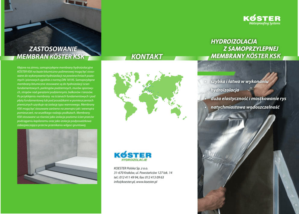 ZASTOSOWANIE MEMBRAN KÖSTER KSK KONTAKT Klejone na zimno, samoprzylepne membrany hydroizolacyjne KÖSTER KSK na bazie bitumiczno-polimerowej mogą być stosowane do wykonywania hydroizolacji na powierzchniach poziomych i pionowych zgodnie z normą DIN 18195. Samoprzylepne membrany bitumiczne stosowane są do hydroizolacji ścian fundamentowych, parkingów podziemnych, murów oporowych, stropów nad garażami podziemnymi, balkonów i tarasów. Po przyklejeniu membrany na ścianach fundamentowych i pod płytą fundamentową lub pod posadzkami w pomieszczeniach piwnicznych uzyskuje się izolację typu wannowego. Membrany KSK mogą być stosowane zarówno na zewnątrz jak i wewnątrz pomieszczeń, na wszelkiego rodzaju podłożach. Membrany KSK stosowane sa również jako izolacja pozioma ścian przeciw podciąganiu kapilanemu oraz jako izolacja podposadzkowa zabezpieczająca przeciw przenikaniu wilgoci gruntowej. HYDROIZOLACJA Z SAMOPRZYLEPNEJ MEMBRANY KÖSTER KSK • i łatwa w wykonaniu • szybka Horizontalsperren auch bei hohen Salzhydroizolacja und Feuchtigkeitsgehalten • elastyczność i mostkowanie • duża Patentiertes, druckloses System - rys • natychmiastowa wodoszczelność kein Materialverlust in Rissen oder Hohlräumen • System zur Mauerwerksinstandsetzung mit KÖSTER Sanierputzen KOESTER Polska Sp. z o.o. 31-670 Kraków, ul. Powstańców 127 lok. 14 tel.: 012 411 49 94, fax: 012 413 09 63 [email protected], www.koester.pl HYDROIZOLACJA SAMOPRZYLEPNYMI MEMBRANAMI BITUMICZNYMI KÖSTER KSK Łatwe i... Przygotowanie podłoża Gruntowanie podłoża Szybkie wykonanie Zalety: KÖSTER KSK AW 15 KÖSTER KSK SY 15 KÖSTER KSK ALU Strong Klejenie membrany KSK KÖSTER KSK ALU 15 Gotowa hydroizolacja MEMBRANY KÖSTER KSK • • • • • • • • • • • • • • • samoprzylepne, klejone na zimno bez konieczności stosowania palników gazowych natychmiastowa wodoszczelność równomierna grubość na całej powierzchni wysoka elastyczność materiał bezrozpuszczalnikowy mostkuje rysy szybkie wykonanie dzięki rolkom o szerokości 1,05 m odporność na starzenie laminowane z góry odporną na rozdzieranie folią KÖSTER KSK SY 15 szczelne i przebadane na przenikanie radonu KÖSTER KSK AW 15 może być nakładany w temperaturach do -10 °C długość: 20 m; szerokość: 1,05 m; grubość: 1,5 mm współczynnik oporu dyfuzyjnego µ: < 130 000 możliwość stosowania na wszelkich podłożach mineralnych jak również metalowych oraz z tworzyw sztucznych