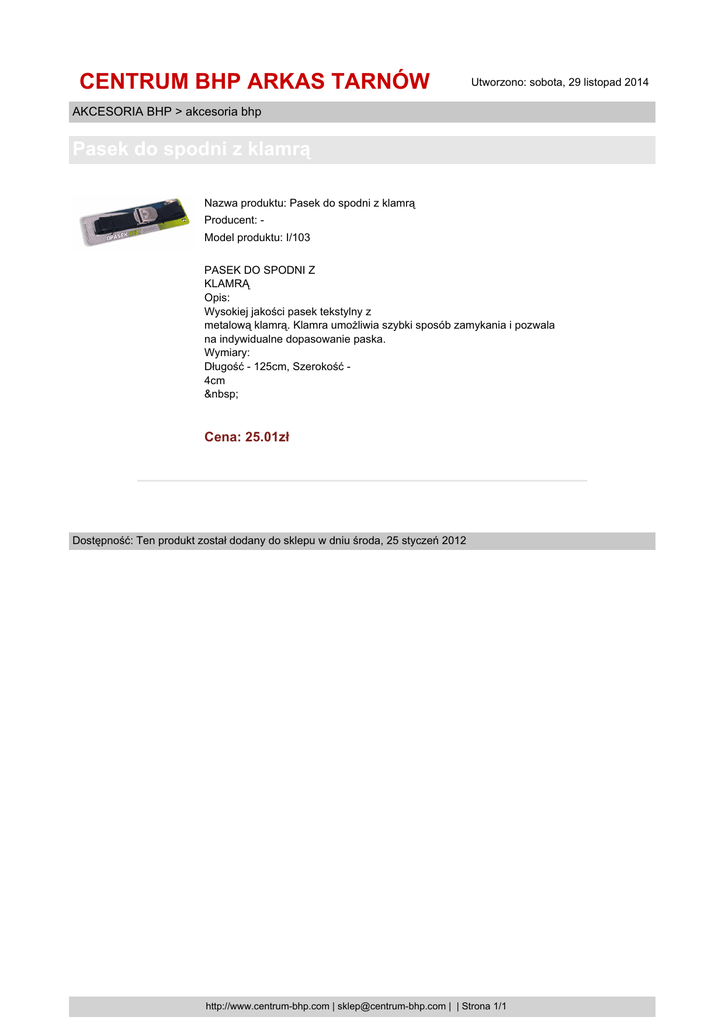 CENTRUM BHP ARKAS TARNÓW Utworzono: sobota, 29 listopad 2014 AKCESORIA BHP > akcesoria bhp Pasek do spodni z klamrą Nazwa produktu: Pasek do spodni z klamrą Producent: Model produktu: I/103 PASEK DO SPODNI Z KLAMRĄ Opis: Wysokiej jakości pasek tekstylny z metalową klamrą. Klamra umożliwia szybki sposób zamykania i pozwala na indywidualne dopasowanie paska. Wymiary: Długość - 125cm, Szerokość 4cm Cena: 25.01zł Dostępność: Ten produkt został dodany do sklepu w dniu środa, 25 styczeń 2012 http://www.centrum-bhp.com | [email protected] | | Strona 1/1