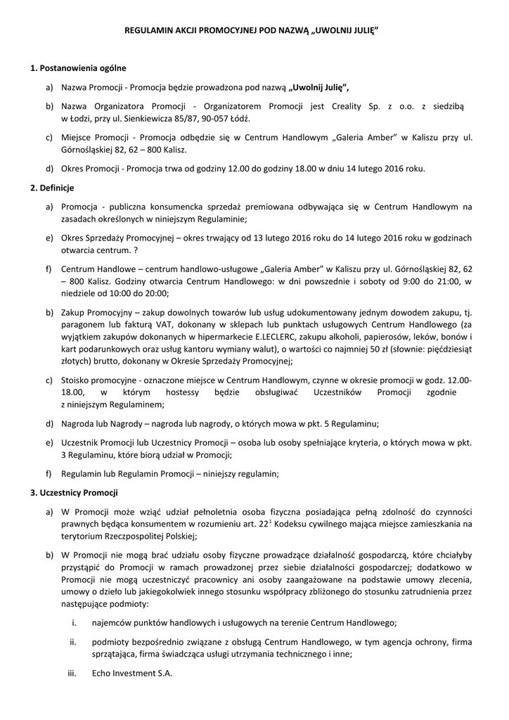 REGULAMIN AKCJI PROMOCYJNEJ POD NAZWĄ „UWOLNIJ JULIĘ” 1. Postanowienia ogólne a) Nazwa Promocji - Promocja będzie prowadzona pod nazwą „Uwolnij Julię”, b) Nazwa Organizatora Promocji - Organizatorem Promocji jest Creality Sp. z o.o. z siedzibą w Łodzi, przy ul. Sienkiewicza 85/87, 90-057 Łódź. c) Miejsce Promocji - Promocja odbędzie się w Centrum Handlowym „Galeria Amber” w Kaliszu przy ul. Górnośląskiej 82, 62 – 800 Kalisz. d) Okres Promocji - Promocja trwa od godziny 12.00 do godziny 18.00 w dniu 14 lutego 2016 roku. 2. Definicje a) Promocja - publiczna konsumencka sprzedaż premiowana odbywająca się w Centrum Handlowym na zasadach określonych w niniejszym Regulaminie; e) Okres Sprzedaży Promocyjnej – okres trwający od 13 lutego 2016 roku do 14 lutego 2016 roku w godzinach otwarcia centrum. ? f) Centrum Handlowe – centrum handlowo-usługowe „Galeria Amber” w Kaliszu przy ul. Górnośląskiej 82, 62 – 800 Kalisz. Godziny otwarcia Centrum Handlowego: w dni powszednie i soboty od 9:00 do 21:00, w niedziele od 10:00 do 20:00; b) Zakup Promocyjny – zakup dowolnych towarów lub usług udokumentowany jednym dowodem zakupu, tj. paragonem lub fakturą VAT, dokonany w sklepach lub punktach usługowych Centrum Handlowego (za wyjątkiem zakupów dokonanych w hipermarkecie E.LECLERC, zakupu alkoholi, papierosów, leków, bonów i kart podarunkowych oraz usług kantoru wymiany walut), o wartości co najmniej 50 zł (słownie: pięćdziesiąt złotych) brutto, dokonany w Okresie Sprzedaży Promocyjnej; c) Stoisko promocyjne - oznaczone miejsce w Centrum Handlowym, czynne w okresie promocji w godz. 12.0018.00, w którym hostessy będzie obsługiwać Uczestników Promocji zgodnie z niniejszym Regulaminem; d) Nagroda lub Nagrody – nagroda lub nagrody, o których mowa w pkt. 5 Regulaminu; e) Uczestnik Promocji lub Uczestnicy Promocji – osoba lub osoby spełniające kryteria, o których mowa w pkt. 3 Regulaminu, które biorą udział w Promocji; f) Regulamin lub Regulamin Promocji – niniejszy regulamin; 3. Uczestnicy Promocji a) W Promocji może wziąć udział pełnoletnia osoba fizyczna posiadająca pełną zdolność do czynności prawnych będąca konsumentem w rozumieniu art. 22 1 Kodeksu cywilnego mająca miejsce zamieszkania na terytorium Rzeczpospolitej Polskiej; b) W Promocji nie mogą brać udziału osoby fizyczne prowadzące działalność gospodarczą, które chciałyby przystąpić do Promocji w ramach prowadzonej przez siebie działalności gospodarczej; dodatkowo w Promocji nie mogą uczestniczyć pracownicy ani osoby zaangażowane na podstawie umowy zlecenia, umowy o dzieło lub jakiegokolwiek innego stosunku współpracy zbliżonego do stosunku zatrudnienia przez następujące podmioty: i. najemców punktów handlowych i usługowych na terenie Centrum Handlowego; ii. podmioty bezpośrednio związane z obsługą Centrum Handlowego, w tym agencja ochrony, firma sprzątająca, firma świadcząca usługi utrzymania technicznego i inne; iii. Echo Investment S.A. iv. Organizatora Promocji; v. inne podmioty biorące bezpośredni udział w przygotowaniu i prowadzeniu Promocji; c) W Promocji nie mogą brać udziału członkowie rodziny oraz osoby pozostające w stałym pożyciu z pracownikami lub osobami zaangażowanymi na podstawie umowy zlecenia , umowy o dzieło lub jakiegokolwiek innego stosunku współpracy zbliżonego do stosunku zatrudnienia przez podmioty wymienione w punkcie 3 b i)- v) powyżej. Przez członków rodziny, o których mowa zdaniu poprzedzającym, rozumie się: wstępnych, zstępnych, rodzeństwo, małżonków, rodziców małżonków i osoby pozostające w stosunku przysposobienia. 4. Zasady Promocji a) W celu wzięcia udziału w Promocji każdy Uczestnik Promocji powinien: i. zapoznać się z niniejszym Regulaminem; ii. w Okresie Sprzedaży Promocyjnej dokonać co najmniej jednego Zakupu Promocyjnego; iii. zachować oryginał dowodu Zakupu Promocyjnego (paragon lub fakturę VAT) i przedstawić go hostessie na Stoisku Promocyjnym w czasie, gdy jest ono czynne, w Okresie Sprzedaży Promocyjnej; b) Każdy Uczestnik Promocji, który spełni założenia niniejszego regulaminu uprawniony jest do otrzymania nagrody, o której mowa w pkt. 5 do wyczerpania nagród . 5. Nagrody a) Nagrodami w Promocji są: b) Wycieczka do Werony i Wenecji - weekend dla dwóch osób – nagroda główna; c) Kupon o wartości 50 zł do jednej z restauracji w Galerii Amber – 10 nagród pocieszenia; d) Czekoladka nadziewana – 500 nagród gwarantowanych; e) Nagroda główna obejmuje: wycieczkę objazdową w terminie 27-31 sierpnia 2016 roku, zakwaterowanie w pokojach 2, 3 osobowych, 2 noclegi w hotelach **/***, 2 śniadania, 2 obiadokolacje, zwiedzanie Padwy, Sirmione, Werony oraz Wenecji wg programu, transport autokarem klasy LUX (barek, klimatyzacja, DVD, toaleta), opiekę pilota, ubezpieczenie KL, NW, bilety wstępu do zwiedzanych obiektów, opłaty lokalne, wjazdy do miast oraz miejscowych przewodników lub inna wycieczka objazdowa do Werony i Wenecji o podobnej wartości; f) Nagroda główna nie obejmuje transportu na miejsce zbiórki. g) Nagroda pocieszenia obejmuje: jeden kupon dla dwóch osób o wartości 50 zł do wskazanej na kuponie restauracji w Galerii Amber w Kaliszu. h) Uprawniony Uczestnik Promocji jest zobowiązany odebrać Nagrodę niezwłocznie po okazaniu i zatwierdzeniu dowodu zakupu przez hostessę obsługującą stoisko promocyjne; i) Uczestnikowi Promocji nie przysługuje prawo do zastrzeżenia szczególnych właściwości Nagrody, do otrzymania ekwiwalentu pieniężnego zamiast Nagrody ani do przeniesienia uprawnienia do odebrania Nagrody na osoby trzecie; j) Nagrody w Promocji nie podlegają wymianie na gotówkę ani na jakiekolwiek inne Nagrody rzeczowe; k) Nie ma możliwości zakupu Nagród; l) Jeden Uczestnik może w ramach niniejszej Promocji otrzymać wiele Nagród przy spełnieniu wszystkich warunków Regulaminu; m) Pu