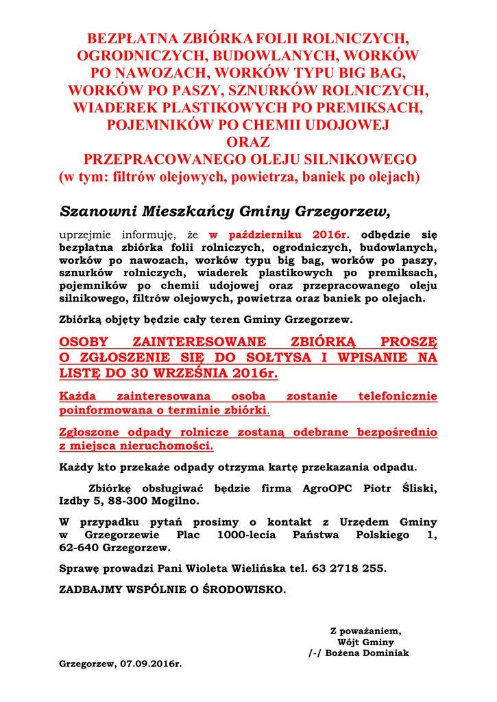 BEZPŁATNA ZBIÓRKA FOLII ROLNICZYCH, OGRODNICZYCH, BUDOWLANYCH, WORKÓW PO NAWOZACH, WORKÓW TYPU BIG BAG, WORKÓW PO PASZY, SZNURKÓW ROLNICZYCH, WIADEREK PLASTIKOWYCH PO PREMIKSACH, POJEMNIKÓW PO CHEMII UDOJOWEJ ORAZ PRZEPRACOWANEGO OLEJU SILNIKOWEGO (w tym: filtrów olejowych, powietrza, baniek po olejach) Szanowni Mieszkańcy Gminy Grzegorzew, uprzejmie informuję, że w październiku 2016r. odbędzie się bezpłatna zbiórka folii rolniczych, ogrodniczych, budowlanych, worków po nawozach, worków typu big bag, worków po paszy, sznurków rolniczych, wiaderek plastikowych po premiksach, pojemników po chemii udojowej oraz przepracowanego oleju silnikowego, filtrów olejowych, powietrza oraz baniek po olejach. Zbiórką objęty będzie cały teren Gminy Grzegorzew. OSOBY ZAINTERESOWANE ZBIÓRKĄ PROSZĘ O ZGŁOSZENIE SIĘ DO SOŁTYSA I WPISANIE NA LISTĘ DO 30 WRZEŚNIA 2016r. Każda zainteresowana osoba poinformowana o terminie zbiórki. zostanie telefonicznie Zgłoszone odpady rolnicze zostaną odebrane bezpośrednio z miejsca nieruchomości. Każdy kto przekaże odpady otrzyma kartę przekazania odpadu. Zbiórkę obsługiwać Izdby 5, 88-300 Mogilno. będzie firma AgroOPC Piotr Śliski, W przypadku pytań prosimy o kontakt z Urzędem Gminy w Grzegorzewie Plac 1000-lecia Państwa Polskiego 1, 62-640 Grzegorzew. Sprawę prowadzi Pani Wioleta Wielińska tel. 63 2718 255. ZADBAJMY WSPÓLNIE O ŚRODOWISKO. Grzegorzew, 07.09.2016r. Z poważaniem, Wójt Gminy /-/ Bożena Dominiak