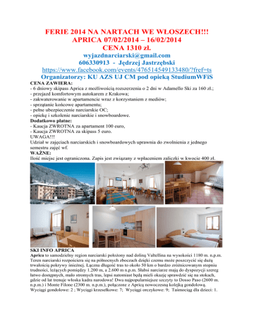 FERIE 2014 NA NARTACH WE WŁOSZECH!!! APRICA 07/02/2014 – 16/02/2014 CENA 1310 zł. [email protected] 606330913 - Jędrzej Jastrzębski https://www.facebook.com/events/476514549133480/?fref=ts Organizatorzy: KU AZS UJ CM pod opieką StudiumWFiS CENA ZAWIERA: - 6 dniowy skipass Aprica z możliwością rozszerzenia o 2 dni w Adamello Ski za 160 zł.; - przejazd komfortowym autokarem z Krakowa; - zakwaterowanie w apartamencie wraz z korzystaniem z mediów; - sprzątanie końcowe apartamentu; - pełne ubezpieczenie narciarskie OC; - opiekę i szkolenie narciarskie i snowboardowe. Dodatkowo płatne: - Kaucja ZWROTNA za apartament 100 euro, - Kaucja ZWROTNA za skipass 5 euro. UWAGA!!! Udział w zajęciach narciarskich i snowboardowych uprawnia do zwolnienia z jednego semestru zajęć wf. WAŻNE: Ilość miejsc jest ograniczona. Zapis jest związany z wpłaceniem zaliczki w kwocie 400 zł. SKI INFO APRICA Aprica to samodzielny region narciarski położony nad doliną Valtellina na wysokości 1180 m. n.p.m. Teren narciarski rozpościera się na północnych zboczach dzięki czemu może poszczycić się dużą trwałością pokrywy śnieżnej. Łączna długość tras to około 50 km o bardzo zróżnicowanym stopniu trudności, leżących pomiędzy 1.200 m, a 2.600 m n.p.m. Słabsi narciarze mają do dyspozycji szereg łatwo dostępnych, mało stromych tras, lepsi natomiast będą mieli okazję sprawdzić się na stokach, gdzie od lat trenuje włoska kadra narodowa! Dwa najpopularniejsze szczyty to Dosso Paso (2600 m. n.p.m.) i Monte Filone (2300 m. n.p.m.), połączone z Apricą nowoczesną kolejką gondolową. Wyciągi gondolowe: 2 ; Wyciągi krzesełkowe: 7; Wyciągi orczykowe: 9; Taśmociąg dla dzieci: 1. Mapka tras APRICA: SKI INFO ADAMELLO SKI : - wysokości 1.121 m - 3.016 m n.p.m. - najtrudniejsza trasa w Passo Tonale - Paradiso - 2,5 km - ciekawe zjazdy na północnym stoku ze szczytu Bleis i przełęczy Contrabbandieri. - oświetlony stok Presanella - 700 m, oświetlany od 21.00 do 23.00 - najdłuższy i najtrudniejszy zjazd Corno d`Aola - Ponte di Legno -7,5 km, różnica poziomów 650m - dobrze przygotowane i sztucznie naśnieżane trasy - na Lodowcu Presena są doskonałe trasy do uprawiania funcarvingu Tras narciarskich: w sumie 100 km: trasy niebieskie - 21 km; trasy czerwone - 57 km; trasy czarne - 22 km; Wyciągi orczykowe – 13; Wyciągi krzesełkowe – 15; Wyciągi gondolowe – 3 Przepustowość: 44 000 os./h Mapa tras narciarskich ADAMELLO SKI