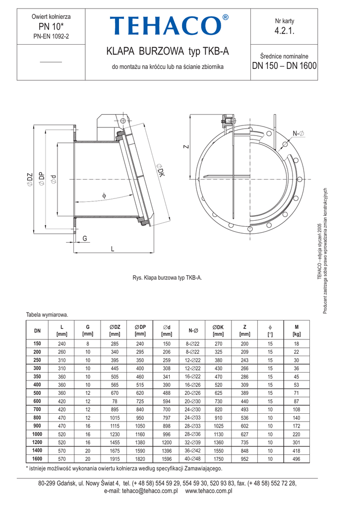 Owiert ko³nierza Nr karty PN 10* 4.2.1. PN-EN 1092-2 KLAPA BURZOWA typ TKB-A Œrednice nominalne do monta¿u na króæcu lub na œcianie zbiornika DN 150 DN 1600 TEHACO - edycja styczeñ 2005 Producent zastrzega sobie prawo wprowadzania zmian konstrukcyjnych d DP DK DZ Z N- f G L Rys. Klapa burzowa typ TKB-A. Tabela wymiarowa. G [mm] DZ [mm] DP [mm] Æd [mm] N- DK [mm] Z [mm] f [°] M [kg] 240 8 285 240 150 8-Æ22 270 200 15 18 260 10 340 295 206 8-Æ22 325 209 15 22 250 310 10 395 350 259 12-Æ22 380 243 15 30 300 310 10 445 400 308 12-Æ22 430 266 15 36 350 360 10 505 460 341 16-Æ22 470 286 15 45 400 360 10 565 515 390 16-Æ26 520 309 15 53 500 360 12 670 620 488 20-Æ26 625 389 15 71 600 420 12 78 725 594 20-Æ30 730 440 15 87 700 420 12 895 840 700 24-Æ30 820 493 10 108 800 470 12 1015 950 797 24-Æ33 910 536 10 140 900 470 16 1115 1050 898 28-Æ33 1025 602 10 172 1000 520 16 1230 1160 996 28-Æ36 1130 627 10 220 1200 520 16 1455 1380 1200 32-Æ39 1360 735 10 301 1400 570 20 1675 1590 1396 36-Æ42 1550 848 10 418 1600 570 20 1915 1820 1596 40-Æ48 1750 952 10 496 DN L [mm] 150 200 * istnieje mo¿liwoœæ wykonania owiertu ko³nierza wed³ug specyfikacji Zamawiaj¹cego. 80-299 Gdañsk, ul. Nowy Œwiat 4, tel. (+ 48 58) 554 59 29, 554 59 30, 520 93 83, fax. (+ 48 58) 552 72 28, e-mail: [email protected] www.tehaco.com.pl