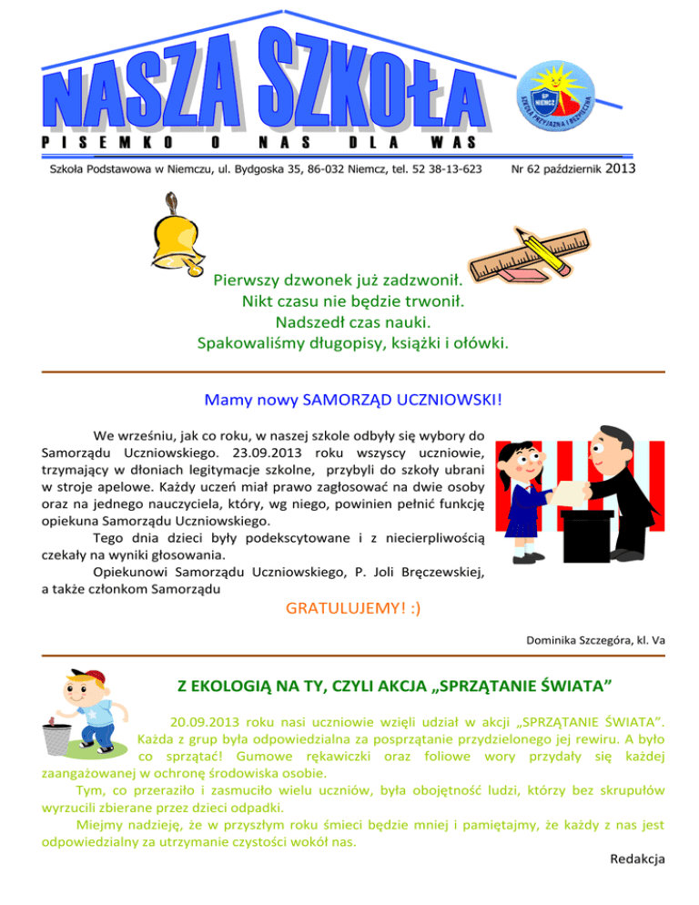 P I S E M K O O N A S D L A W AS Szkoła Podstawowa w Niemczu, ul. Bydgoska 35, 86-032 Niemcz, tel. 52 38-13-623 Nr 62 październik 2013 Pierwszy dzwonek już zadzwonił. Nikt czasu nie będzie trwonił. Nadszedł czas nauki. Spakowaliśmy długopisy, książki i ołówki. Mamy nowy SAMORZĄD UCZNIOWSKI! We wrześniu, jak co roku, w naszej szkole odbyły się wybory do Samorządu Uczniowskiego. 23.09.2013 roku wszyscy uczniowie, trzymający w dłoniach legitymacje szkolne, przybyli do szkoły ubrani w stroje apelowe. Każdy uczeń miał prawo zagłosować na dwie osoby oraz na jednego nauczyciela, który, wg niego, powinien pełnić funkcję opiekuna Samorządu Uczniowskiego. Tego dnia dzieci były podekscytowane i z niecierpliwością czekały na wyniki głosowania. Opiekunowi Samorządu Uczniowskiego, P. Joli Bręczewskiej, a także członkom Samorządu GRATULUJEMY! :) Dominika Szczegóra, kl. Va Z EKOLOGIĄ NA TY, CZYLI AKCJA „SPRZĄTANIE ŚWIATA” 20.09.2013 roku nasi uczniowie wzięli udział w akcji „SPRZĄTANIE ŚWIATA”. Każda z grup była odpowiedzialna za posprzątanie przydzielonego jej rewiru. A było co sprzątać! Gumowe rękawiczki oraz foliowe wory przydały się każdej zaangażowanej w ochronę środowiska osobie. Tym, co przeraziło i zasmuciło wielu uczniów, była obojętność ludzi, którzy bez skrupułów wyrzucili zbierane przez dzieci odpadki. Miejmy nadzieję, że w przyszłym roku śmieci będzie mniej i pamiętajmy, że każdy z nas jest odpowiedzialny za utrzymanie czystości wokół nas. Redakcja SZKOLNE RECENZJE POLECAM! „Heartland” Lubisz konie? Uwielbiasz czytać? Jeśli tak, przeczytaj „HEARTLAND”. Książka ta opowiada o schronisku dla koni, w którym wspomniane zwierzęta są leczone z nałogów i na nowo uczą się kochać ludzi. Amy, główna bohaterka, musi przejść trudne chwile, ale pewien pracownik stadniny pomaga jej odciąć się od wspomnień. Czytam już czwarty tom tej serii. Polecam tę książkę miłośnikom koni, którzy chcą się dowiedzieć, czym jest terapia T-touch lub do czego służą olejki z kokosów. Agata Witkowska, kl. Vb „JAKE RANSON I WYJĄCY SFINKS” oraz „JAKE RANSON I WŁADCA CZASZEK” „JAKE RANSOM I WYJĄCY SFINKS” oraz „JAKE RANSOM I WŁADCA CZASZEK” to znakomite książki kryminalne James’a Rollins’a – Jana Czajkowskiego, które cechuje występowanie wartkiej akcji. Rodzice Jake’a zaginęli w Ameryce Południowej. Zostali porwani przez Władcę Czaszek. Jeśli interesuje Cię to, jakie przygody przeżyli bohaterowie tych książek, ZAPRASZAM DO LEKTURY! Agata Frąc, kl. Va KĄCIK MAŁEGO HISTORYKA Pewnej nocy listopadowej… Powstanie Listopadowe (1830 – 1831) to wystąpienie zbrojne przeciwko Rosji, polskie powstanie narodowe. Za jego początek przyjmuje się noc z dnia 29 na 30 listopada 1830 roku – to tzw. noc listopadowa. Powstanie Listopadowe doszło do skutku z powodu łamania przez Rosjan konstytucji Królestwa Polskiego z 1815 roku oraz represji, jakimi zostały dotknięte tajne związki i organizacje. Głównym celem był zamach na wielkiego księcia Konstantego. Miały zostać też zajęte koszary rosyjskie. Sygnałem do rozpoczęcia działań był pożar na Solcu. Na trasie spiskowców znalazły się takie miejsca jak: Belweder i Arsenał. Istotna była także wojna polsko-rosyjska oraz działania zbrojne na Litwie, Żmudzi i Białorusi. Kalendarium: 18/ 19.11. 1830 r. – rozkaz Mikołaja I o mobilizacji wojska 29. 11. 1830 r. – wybuch powstania listopadowego 4.12. 1830 r. – powstanie Rządu Tymczasowego na czele z księciem Adamem Jerzym Czartoryskim 18.12.1930 r. – na swym pierwszym posiedzeniu sejm uznał powstanie za narodowe 25.01. 1831 r. – ogłoszenie przez sejm detronizacji Mikołaja I 14.02. 1831 r. – bitwa pod Stoczkiem; pierwsze zwycięstwo Polaków 25.02. 1831 r. – nierozstrzygnięta bitwa pod Grochowem; Polakom udało się zahamować ofensywę rosyjską 26.05. 1831 r. – klęska wojsk polskich pod Ostrołęką 21.10. 1831 r. – kapitulacja Zamościa, ostatniego punktu oporu w powstaniu listopadowym * Po upadku powstania listopadowego porywano polskie dzieci i karnie wcielano do wojska rosyjskiego. Przywódcy powstania listopadowego: Józef Chłopicki , Michał Gedeon Radziwiłł, Jan Zygmunt Skrzynecki, Henryk Dembiński, Ignacy Prądzyński , Kazimierz Małachowski, Maciej Rybiński , Jan Nepomucen Umiński , Maciej Rybiński Kochani Uczniowie! Życzymy Wam, aby ten nowy rok szkolny 2013/ 2014 był pomyślny i radosny. Skład redakcji : p. Beata Deptuła – nauczyciel języka angielskiego, p. Łukasz Borzych – nauczyciel języka angielskiego, p. Aleksandra Zasadowska – nauczyciel języka polskiego