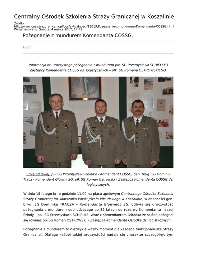 Centralny Ośrodek Szkolenia Straży Granicznej w Koszalinie Źródło: http://www.cos.strazgraniczna.pl/cos/aktualnosci/13013,Pozegnanie-z-mundurem-Komendanta-COSSG.html Wygenerowano: Sobota, 4 marca 2017, 14:49 Pożegnanie z mundurem Komendanta COSSG. Autor: Informacja nt. uroczystego pożegnania z mundurem płk. SG Przemysława SCHIELKE i Zastępcy Komendanta COSSG ds. logistycznych – płk. SG Romana OSTROWSKIEGO. Stoją od lewej: płk SG Przemysław Schielke - Komendant COSSG, gen. bryg. SG Dominik Tracz - Komendant Główny SG, płk SG Roman Ostrowski - Zastępca Komendanta COSSG ds. logistycznych. W dniu 15 lutego br. o godzinie 11.00 na placu apelowym Centralnego Ośrodka Szkolenia Straży Granicznej im. Marszałka Polski Józefa Piłsudskiego w Koszalinie, w obecności gen. bryg. SG Dominika TRACZA – Komendanta Głównego SG, odbyła się uroczystość pożegnania z mundurem odchodzącego po 32 latach do rezerwy Komendanta naszej Szkoły – płk. SG Przemysława SCHIELKE. Wraz z Komendantem Ośrodka ze służbą pożegnał się również płk SG Roman OSTROWSKI – Zastępca Komendanta Ośrodka ds. logistycznych. Pożegnanie z mundurem to niezwykle ważny moment dla każdego funkcjonariusza Straży Granicznej. Dlatego każdej takiej uroczystości nadaje się charakter szczególny, tym większy gdy ze służby odchodzą jednocześnie Komendant Szkoły i jego Zastępca. Dlatego też w uroczystym apelu i symbolicznym pożegnaniu ze Sztandarem Ośrodka, oprócz Komendanta Głównego naszej formacji, wzięło udział wielu znamienitych gości tworzących elitę społeczno – kulturalną naszego Miasta i Regionu: od wielu lat przyjaciół naszej szkoły. Uroczysty apel rozpoczęło wprowadzenie Pododdziałów Szkolnych COSSG i Orkiestry Morskiego Oddziału Straży Granicznej w Gdańsku pod batutą jej wieloletniego kapelmistrza, kpt. SG Jarosława RYWALSKIEGO. Po przyjęciu meldunku od mjr. SG Tomasza SIEKA – dowódcy uroczystości przez gen. bryg. SG Dominika TRACZA, na maszt podniesiono flagę państwową i odegrano hymn państwowy. Następnie płk SG Przemysław SCHIELKE przywitał wszystkich zaproszonych gości. Po ceremonii pożegnania ze sztandarem Ośrodka Komendant wraz z Zastępcą ds. logistycznych otrzymali z rąk Komendanta Głównego pamiątkowe szable oficerskie. Wybranym osobom wręczono również Odznaki Pamiątkowe naszej Szkoły, które przekazał żegnający się z mundurem Komendant COSSG. Podczas apelu gen. bryg. SG Dominik TRACZ przedstawił także płk. SG Grzegorza SKORUPSKIEGO – nowego Komendanta COSSG. Przez ostatnie lata płk SKORUPSKI pełnił służbę na stanowisku Naczelnika Wydziału Organizacji i Koordynacji Szkolenia Biura Kadr i Szkolenia Komendy Głównej Straży Granicznej w Warszawie, z ramienia którego nadzorował pracę ośrodków szkolenia naszej formacji. Płk SG Grzegorz SKORUPSKI przejmie obowiązki Komendanta Centralnego Ośrodka Szkolenia Straży Granicznej im. Marszałka Polski Józefa Piłsudskiego w Koszalinie 22 lutego br. Stoją od lewej: płk SG Grzegorz Skorupski, gen. bryg. SG Dominik Tracz, płk SG Przemysław Schielke, płk SG Roman Ostrowski. W przemówieniu okolicznościowym płk. SG Przemysław SCHIELKE powiedział m.in.: „Dziś, po 32 latach służby żegnam się z mundurem. Jednocześnie, z dniem 21 lutego przestaję kierować Centralnym Ośrodkiem Szkolenia Straży Granicznej im. Marszałka Polski Józefa Piłsudskiego w Koszalinie. To bardzo ważny moment mojego życia, który jest zarazem okazją do refleksji i chwili zadumy nad latami spędzonymi w szeregach naszej formacji i wspomnieniem wszystkich ludzi, z którymi los zetknął mnie przez wszystkie te lata. (…) Zarządzanie koszalińską Szkołą Straży Granicznej było dla mnie nie tylko zaszczytem, ale również trudnym, angażującym i odpowiedzialnym zadaniem. Mogłem je realizować z powodzeniem wyłącznie dzięki pracy wielu oddanych mi współpracowników, oraz wsparciu wszystkich przychylnych osób i przyjaciół naszej Szkoły, bez których funkcjonowanie Ośrodka byłoby znacznie trudniejsze: ludzi, z którymi miałem zaszczyt współpracować, i na których zawsze mogłem polegać. (…) Dzień, w którym kończę swą służbę w Straży Granicznej jest doskonałą okazją, by podziękować również Wam wszystkim za współpracę. Zawsze bardzo wysoko ją sobie ceniłem. Dzięki wsparciu, serdeczności w codziennych kontaktach i pomocy z Waszej strony, udało mi się zrealizować wiele zadań, a okazywane zawsze wsparcie dużo dla mnie znaczyło. (…) Pragnę podkreślić, że na zawsze w swojej pamięci zachowam tych, z którymi miałem okazję spotkać się w różnych okresach mojej zawodowej drogi. Dlatego też niniejszym chciałbym podziękować wszystkim Wam za dotychczasową współpracę, ciepłą atmosferę podczas naszych służbowych i prywatnych kontaktów, a także za codziennie okazywaną życzliwość, serdeczność, wsparcie i pomoc.” Komendant SCHIELKE podziękował także za długoletnią służbę płk. SG Romanowi OSTROWSKIEMU. Powiedział m.in. „Profesjonalizm, solidność, rzetelność i koleżeńskość: Panie Pułkowniku – takiego Pana zapamiętamy. Przez wiele lat pokazywał nam Pan swoją codzienną służbą, z jaką odpowiedzialnością i zaangażowaniem należy ją wykonywać, mając na względzie przede wszystkim dobro naszej formacji oraz Szkoły.” Życzył również swojemu Zastępcy ds. logistycznych realizacji zamierzonych planów, osiągnięcia wytyczonych celów i przede wszystkim pomyślności w przyszłym życiu zawodowym i rodzinnym. W czasie trwania apelu głos zabrał również płk SG Roman OSTROWSKI, który podziękował wszystkim funkcjonariuszom i pracownikom naszej Szkoły, z którymi zetknął się w trakcie swojej 34-letniej służby w mundurze. Zastępca Komendanta COSSG ds. logistycznych powiedział m.in.: „Dzisiejszy dzień, w którym kończę swą służbę w Straży Granicznej