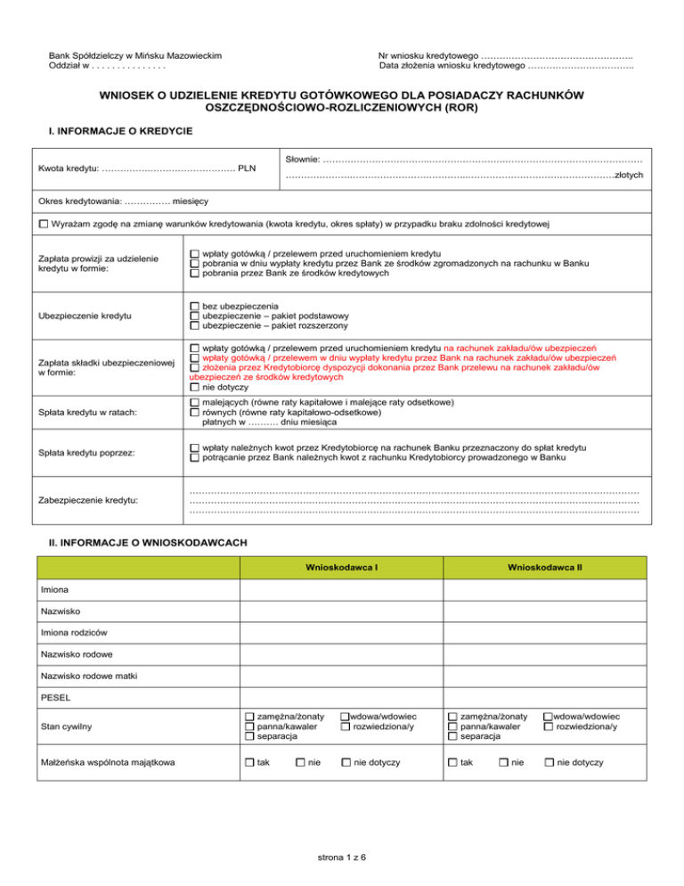 Bank Spółdzielczy w Mińsku Mazowieckim Oddział w . . . . . . . . . . . . . . . Nr wniosku kredytowego ………………………………………….. Data złożenia wniosku kredytowego …………………………….. WNIOSEK O UDZIELENIE KREDYTU GOTÓWKOWEGO DLA POSIADACZY RACHUNKÓW OSZCZĘDNOŚCIOWO-ROZLICZENIOWYCH (ROR) I. INFORMACJE O KREDYCIE Słownie: ……………………………..…………………….……………………………………… Kwota kredytu: …………….………………………. PLN ………………….………………………………..…………………………………………złotych Okres kredytowania: …………… miesięcy Wyrażam zgodę na zmianę warunków kredytowania (kwota kredytu, okres spłaty) w przypadku braku zdolności kredytowej Zapłata prowizji za udzielenie kredytu w formie: wpłaty gotówką / przelewem przed uruchomieniem kredytu pobrania w dniu wypłaty kredytu przez Bank ze środków zgromadzonych na rachunku w Banku pobrania przez Bank ze środków kredytowych Ubezpieczenie kredytu bez ubezpieczenia ubezpieczenie – pakiet podstawowy ubezpieczenie – pakiet rozszerzony Zapłata składki ubezpieczeniowej w formie: wpłaty gotówką / przelewem przed uruchomieniem kredytu na rachunek zakładu/ów ubezpieczeń wpłaty gotówką / przelewem w dniu wypłaty kredytu przez Bank na rachunek zakładu/ów ubezpieczeń złożenia przez Kredytobiorcę dyspozycji dokonania przez Bank przelewu na rachunek zakładu/ów ubezpieczeń ze środków kredytowych nie dotyczy Spłata kredytu w ratach: malejących (równe raty kapitałowe i malejące raty odsetkowe) równych (równe raty kapitałowo-odsetkowe) płatnych w ………. dniu miesiąca Spłata kredytu poprzez: wpłaty należnych kwot przez Kredytobiorcę na rachunek Banku przeznaczony do spłat kredytu potrącanie przez Bank należnych kwot z rachunku Kredytobiorcy prowadzonego w Banku Zabezpieczenie kredytu: ………………………………………………………………………………………………………………………………… ………………………………………………………………………………………………………………………………… ………………………………………………………………………………………………………………………………… II. INFORMACJE O WNIOSKODAWCACH Wnioskodawca I Wnioskodawca II Imiona Nazwisko Imiona rodziców Nazwisko rodowe Nazwisko rodowe matki PESEL Stan cywilny zamężna/żonaty panna/kawaler separacja Małżeńska wspólnota majątkowa tak nie wdowa/wdowiec rozwiedziona/y nie dotyczy strona 1 z 6 zamężna/żonaty panna/kawaler separacja tak nie wdowa/wdowiec rozwiedziona/y nie dotyczy Wnioskodawca I Cechy dokumentu tożsamości Adres zamieszkania Adres do korespondencji Nr telefonu (do wyboru) Wnioskodawca II Nazwa: …………………………………………. Nazwa: ………………………….………………. Seria…………………………………………….. Seria…………………………….……………….. Nr dokumentu: ……………….………………… Nr dokumentu: …………….…….……………… Wydany przez: ................................................ Wydany przez: ................................................. Ulica: ………………………….…………………. Ulica: ……………………………………………... Nr domu: ………………….…………………….. Nr domu: …………………………………………. Nr lokalu………………….……………………… Nr lokalu: …………………….…………………… Kod: ……………………………………………... Kod: …………………………….………………… Miejscowość: …………………….……………… Miejscowość………………….………………….. Kraj: ……………………………………………... Kraj: ………………………….…………………… Ulica……...………………………….…………… Ulica……...…………………….….……………… Nr domu: ……...………………………………… Nr domu: ……...…………………….…………… Nr lokalu: ……...……………...………………… Nr lokalu: ……...…………….…………………… Kod……...………….……….…………………… Kod……...………..…………….………………… Miejscowość: ……...…………………………… Miejscowość: …………....……………………… Kraj: ……...……………………………………… Kraj: ……...…………….………………………… stacjonarny…………………………….………… stacjonarny: ……………………………………… komórkowy: ………………………….………….. komórkowy: ……………………….……………… E-mail: Wykształcenie wyższe magisterskie licencjat/inżynier średnie zasadnicze zawodowe podstawowe/gimnazjalne wyższe magisterskie licencjat/inżynier średnie zasadnicze zawodowe podstawowe/gimnazjalne nie posiadam posiadam ................. nie posiadam posiadam ................. Wykonywany zawód Rachunek III. INFORMACJE O DOCHODACH I WYDATKACH Wnioskodawca I Wnioskodawca II Całkowity staż pracy (w latach) Okres zatrudnienia u obecnego pracodawcy/czas prowadzenia obecnej dział. gospodarczej (w latach) Informacje o pracodawcy (nazwa, adres) Stanowisko Miesięczny dochód netto: właściciel firmy wyższa kadra zarządzająca średnia kadra zarządzająca urzędnik specjalista pracownik inne ..................................... PLN, w tym: strona 2 z 6 właściciel firmy wyższa kadra zarządzająca średnia kadra zarządzająca urzędnik specjalista pracownik inne ..............................