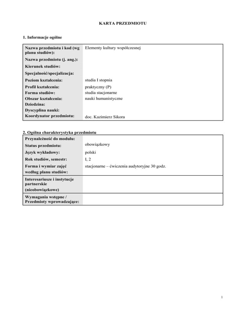 KARTA PRZEDMIOTU 1. Informacje ogólne Nazwa przedmiotu i kod