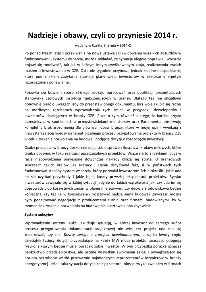 Nadzieje i obawy, czyli co przyniesie 2014 r. wydany w Czysta Energia – 2014-2 Po ponad trzech latach oczekiwania na nową ustawę i zlikwidowaniu wszelkich absurdów w funkcjonowaniu systemu wsparcia, można zakładać, że sytuacja ulegnie poprawie i wreszcie pojawi się możliwość, tak jak w każdym innym cywilizowanym kraju, realizowania swoich marzeń o inwestowaniu w OZE. Ostatnie tygodnie przynoszą jednak kolejne niespodzianki, które pod znakiem zapytania stawiają plany wielu inwestorów w sektorze energetyki rozproszonej i odnawialnej. Pojawiło się bowiem sporo różnego rodzaju opracowań oraz publikacji prezentujących stanowiska czołowych instytucji funkcjonujących w branży. Dlatego też nie chciałbym ponownie pisać o uwagach Izby do przedstawionego dokumentu, lecz wolę skupić się raczej na możliwych rezultatach wprowadzenia tych zmian w przypadku deweloperów i inwestorów działających w branży OZE. Piszę o tym również dlatego, iż bardzo często uczestnicząc w spotkaniach z przedstawicielami ministerstw oraz Parlamentu, obserwuję kompletny brak zrozumienia dla głównych obaw branży, które w mojej opinii wynikają z niewystarczającej wiedzy na temat przebiegu procesu przygotowania projektu w branży OZE w celu uzyskania pozwolenia na budowę i podjęcia decyzji o rozpoczęciu inwestycji. Osoby pracujące w branży doskonale zdają sobie sprawę z ilości tzw. kroków milowych, które trzeba poczynić w toku realizacji poszczególnych projektów. Wiąże się to z ryzykiem, gdyż w razie niepowodzenia poniesione dotychczas nakłady okażą się stratą. O branżowych sukcesach takich krajów jak Niemcy i Dania decydował fakt, iż w państwach tych funkcjonował stabilny system wsparcia, który pozwalał inwestorom ściśle określić, jakie uda im się uzyskać przychody i jakie będą koszty przyszłej eksploatacji projektów. Ryzyko inwestorów zawężało się w takiej sytuacji jedynie do takich wątpliwości jak: czy uda im się doprowadzić do korzystnych zmian w planie miejscowym, czy decyzja środowiskowa będzie konieczna, czy też ile w konsekwencji kosztować będzie sama budowa? Zawczasu można było podejmować negocjacje z producentami turbin oraz firmami budowlanymi, by w momencie uzyskania pozwolenia na budowę nie kosztowała ona zbyt wiele. System aukcyjny Wprowadzenie systemu aukcji skutkuje sytuacją, w której inwestor do samego końca procesu przygotowania dokumentacji projektowej nie wie, czy projekt uda mu się zrealizować, czy nie. Koszty związane z project developmentem, a są to kwoty rzędu dziesiątek tysięcy złotych przypadające na każdy MW mocy projektu, znacząco potęgują ryzyko, z którym będzie musiał poradzić sobie inwestor. W tym przypadku porażka oznacza bankructwo przedsiębiorstwa, ale przede wszystkim zwolnienia załogi i powiększający się poziom bezrobocia wśród przeważnie najmłodszych reprezentantów inżynierów w branży energetycznej. Jeżeli taka sytuacja dotyka całego sektora, niosąc ryzyko zwolnień w firmach działających na terenie kraju, to trudno sobie odmówić dosadnego komentarza i można łatwo zrozumieć młodych inżynierów szukających pracy u naszych zachodnich sąsiadów czy w Wielkiej Brytanii, w której rocznie przybywa ok. 1,25 GW nowych mocy w energetyce rozproszonej oraz odnawialnej. W mojej i Polskiej Rady Koordynacyjnej Odnawialnych Źródeł Energii opinii, wprowadzenie obecnie nowego systemu wsparcia, polegającego na systemie aukcji, doprowadzi do ogromnego zastoju w branży, który może skutkować niespełnieniem celów wskaźnikowych, mówiących o 15-procentowym udziale źródeł odnawialnych w bilansie energetycznym kraju w 2020 r. Dlatego też wejście w życie tego systemu powinno zostać przesunięte w czasie, przynajmniej do 2020 r. Drobni inwestorzy w tej branży, zwłaszcza reprezentujący takie technologie jak biogaz czy fotowoltaika, z trudnościami przygotują dokumentacje projektowe oraz nie podejmą się budowy instalacji, do ostatniej chwili nie mając pewności, czy w przedmiotowej aukcji uda mu się osiągnąć sukces. Na podjęcie tego typu ryzyka stać tylko największe przedsiębiorstwa, które ewentualne niepowodzenia będą mogły „wrzucić sobie w koszty” i rozdystrybuować na miliony klientów kupujących u nich energię elektryczną. Nowy pomysł opozycji Jak nie stracić zaufania do instytucji państwa, będąc polskim przedsiębiorcą w branży wiatrowej albo jak na poważnie rozważać wielomilionowe inwestycje w naszym kraju, jeśli do dalszych prac w komisjach parlamentarnych (za sprawą głosów głównej partii opozycyjnej oraz głównej partii rządzącej) kierowany jest niezgodny z Konstytucją i populistyczny projekt nowelizacji Prawa budowlanego, w praktyce zakładający usunięcie z Polski wszelkich turbin wiatrowych o mocy przekraczającej 500 kW? Chodzi o projekt nowelizacji Prawa budowlanego, nakazujący oddalenie turbin wiatrowych o mocy większej niż 500 kW przynajmniej 3 km od zabudowy mieszkaniowej. Czy ta nowelizacja ujrzy światło dzienne? Szczerze wątpię, zwłaszcza ze względu na jej niekonstytucyjność i populistyczny charakter. Mam nadzieję, że samorządy, które już dziś są jednymi z największych beneficjentów rozwoju OZE w Polsce, zaprotestują przeciwko tej próbie pozbawienia ich przychodów z tytułu podatku od nieruchomości. Jednak sygnał wysyłany przez Parlament i rząd jest jednoznaczny: nie chcemy u siebie żadnych instalacji wiatrowych! Kto wie, czy kolejnym wrogiem numer jeden nie staną się biogazownie rolnicze? Autorom projektu zasugeruję kwestię, której zapewne nie wzięli pod uwagę. Otóż ograniczenie budowy turbin większych niż przewidziane w projekcie ustawy spowoduje wzrost ilości inwestycji w turbiny mniejsze, często pozyskane z odzysku. Tak więc propagandowy cel twórców projektu nie zostanie osiągnięty. Podsumowując, pozostaje mieć nadzieję, iż w 