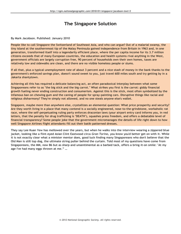 http://ngm.nationalgeographic.com/2010/01/singapore/jacobson-text/2 The Singapore Solution By Mark Jacobson. Published: January 2010 People like to call Singapore the Switzerland of Southeast Asia, and who can argue? Out of a malarial swamp, the tiny island at the southernmost tip of the Malay Peninsula gained independence from Britain in 1963 and, in one generation, transformed itself into a legendarily efficient place, where the per capita income for its 3.7 million citizens exceeds that of many European countries, the education and health systems rival anything in the West, government officials are largely corruption free, 90 percent of households own their own homes, taxes are relatively low and sidewalks are clean, and there are no visible homeless people or slums. If all that, plus a typical unemployment rate of about 3 percent and a nice stash of money in the bank thanks to the government's enforced savings plan, doesn't sound sweet to you, just travel 600 miles south and try getting by in a Jakarta shantytown. Achieving all this has required a delicate balancing act, an often paradoxical interplay between what some Singaporeans refer to as "the big stick and the big carrot." What strikes you first is the carrot: giddy financial growth fueling never ending construction and consumerism. Against this is the stick, most often symbolized by the infamous ban on chewing gum and the caning of people for spray-painting cars. Disruptive things like racial and religious disharmony? They're simply not allowed, and no one steals anyone else's wallet. Singapore, maybe more than anywhere else, crystallizes an elemental question: What price prosperity and security? Are they worth living in a place that many contend is a socially engineered, nose-to-the-grindstone, workaholic rat race, where the self-perpetuating ruling party enforces draconian laws (your airport entry card informs you, in red letters, that the penalty for drug trafficking is "DEATH"), squashes press freedom, and offers a debatable level of financial transparency? Some people joke that the government micromanages the details of life right down to how well Singapore Airlines flight attendants fill out their batik-patterned dresses. They say Lee Kuan Yew has mellowed over the years, but when he walks into the interview wearing a zippered blue jacket, looking like a flint-eyed Asian Clint Eastwood circa Gran Torino, you know you'd better get on with it. While it is not exactly clear what a minister mentor does, good luck finding many Singaporeans who don't believe that the Old Man is still top dog, the ultimate string puller behind the curtain. Told most of my questions have come from Singaporeans, the MM, now 86 but as sharp and unsentimental as a barbed tack, offers a bring-it-on smile: "At my age I've had many eggs thrown at me.” … © 2012 National Geographic Society. All rights reserved. Weronika Piotrowska 07.05.2010 Wzór na Singapur Mark Jacobson Singapur to państwo z lubością nazywane Szwajcarią południowo-wschodniej Azji. I czemu nie? Ta mała wysepka południowej części Półwyspu Malajskiego to niegdyś skażone malarią mokradła, dziś – uwolnione w 1963 roku od wpływów brytyjskich niezależne i w pełni sprawne państwo. Dochód na głowę każdego z 3,7 miliona obywateli przewyższa niejeden europejski. System oświaty oraz służba zdrowia śmiało dorównują Zachodowi. Rzadko kiedy można tu spotkać skorumpowanego urzędnika rządowego. 90% mieszkańców posiada swój własny dom. Podatki są względnie niskie a chodniki czyste. Dzielnice biedoty oraz problem bezdomności tu nie istnieją. Co ciekawe, wszystko to osiągnięto w zasadzie za życia tylko jednego pokolenia. Dodaj do tego stopę bezrobocia nie wyższą niż 3% oraz całkiem przyzwoitą kwotę na koncie, którą zyskujesz dzięki wprowadzonemu przez rząd planu oszczędnościowego. Jeśli wszystko to jeszcze Cię nie przekonało, jedź 950 km na południe i, dla kontrastu, zasmakuj slumsów Dżakarty. Singapur stał się potęgą dzięki subtelnej, często paradoksalnej, współgrze dwóch silnych bodźców: przysłowiowego „kija” i „marchewki”. Przysłowiowa „marchewka” to nagroda w postaci spektakularnego wzrostu na polu finansowym, który z kolei napędza budownictwo oraz wspiera konsumeryczny model życia. „Kij” z kolei to kary typu owiany złą sławą zakaz żucia gumy lub „wsadzanie” ludzi do więzienia za umieszczenie graffiti na jakimkolwiek samochodzie. W Singapurze nie ma też mowy o utarczkach na tle rasowym czy też religijnym. Ukraść komuś portfel? O tym również zapomnij. W tym kraju, bardziej niż gdziekolwiek indziej na świecie, zachodzi podstawowe pytanie: jaką cenę trzeba zapłacić za cały ten dobrobyt i bezpieczeństwo gwarantowane przez władze kraju? Czy rekompensują one życie pełne trudów, ciężkiej fizycznej pracy, wszechobecnego „wyścigu szczurów”? Czy warto żyć w kraju, w którym jedyna, bo bezalternatywna, rządząca partia wprowadza w życie drakońskie przepisy prawne (wjeżdżając do kraju zostajesz szybko poinformowany, że za przemyt narkotyków grozi Ci śmierć)? W kraju, który nie uznaje ani wolności słowa ani wolności prasy oraz który nie zamierza tłumaczyć się obywatelom ze sposobu wykorzystania finansów publicznych? Niektórzy nawet żartują sobie z tego, że singapurski rząd „wchodzi z butami” nawet na pokład linii lotniczych. Sprawdza się tam m.in. czy batikowe kostiumy noszone przez stewardessy odpowiednio podkreślają ich kształty.
