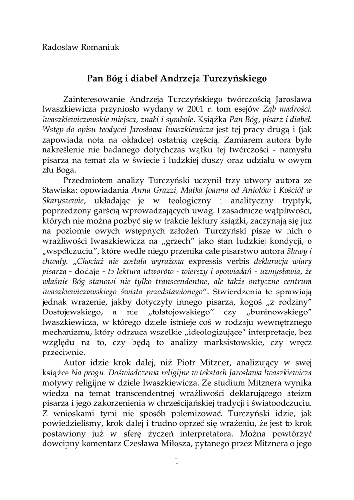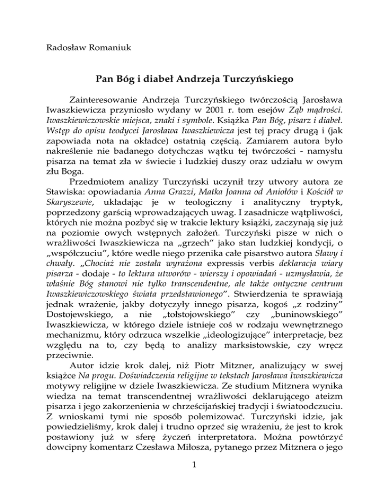 Radosław Romaniuk Pan Bóg i diabeł Andrzeja Turczyńskiego Zainteresowanie Andrzeja Turczyńskiego twórczością Jarosława Iwaszkiewicza przyniosło wydany w 2001 r. tom esejów Ząb mądrości. Iwaszkiewiczowskie miejsca, znaki i symbole. Książka Pan Bóg, pisarz i diabeł. Wstęp do opisu teodycei Jarosława Iwaszkiewicza jest tej pracy drugą i (jak zapowiada nota na okładce) ostatnią częścią. Zamiarem autora było nakreślenie nie badanego dotychczas wątku tej twórczości - namysłu pisarza na temat zła w świecie i ludzkiej duszy oraz udziału w owym złu Boga. Przedmiotem analizy Turczyński uczynił trzy utwory autora ze Stawiska: opowiadania Anna Grazzi, Matka Joanna od Aniołów i Kościół w Skaryszewie, układając je w teologiczny i analityczny tryptyk, poprzedzony garścią wprowadzających uwag. I zasadnicze wątpliwości, których nie można pozbyć się w trakcie lektury książki, zaczynają się już na poziomie owych wstępnych założeń. Turczyński pisze w nich o wrażliwości Iwaszkiewicza na „grzech” jako stan ludzkiej kondycji, o „współczuciu”, które wedle niego przenika całe pisarstwo autora Sławy i chwały. „Chociaż nie została wyrażona expressis verbis deklaracja wiary pisarza - dodaje - to lektura utworów - wierszy i opowiadań - uzmysławia, że właśnie Bóg stanowi nie tylko transcendentne, ale także ontyczne centrum Iwaszkiewiczowskiego świata przedstawionego”. Stwierdzenia te sprawiają jednak wrażenie, jakby dotyczyły innego pisarza, kogoś „z rodziny” Dostojewskiego, a nie „tołstojowskiego” czy „buninowskiego” Iwaszkiewicza, w którego dziele istnieje coś w rodzaju wewnętrznego mechanizmu, który odrzuca wszelkie „ideologizujące” interpretacje, bez względu na to, czy będą to analizy marksistowskie, czy wręcz przeciwnie. Autor idzie krok dalej, niż Piotr Mitzner, analizujący w swej książce Na progu. Doświadczenia religijne w tekstach Jarosława Iwaszkiewicza motywy religijne w dziele Iwaszkiewicza. Ze studium Mitznera wynika wiedza na temat transcendentnej wrażliwości deklarującego ateizm pisarza i jego zakorzenienia w chrześcijańskiej tradycji i światoodczuciu. Z wnioskami tymi nie sposób polemizować. Turczyński idzie, jak powiedzieliśmy, krok dalej i trudno oprzeć się wrażeniu, że jest to krok postawiony już w sferę życzeń interpretatora. Można powtórzyć dowcipny komentarz Czesława Miłosza, pytanego przez Mitznera o jego 1 ocenę zasadności „teologicznej” interpretacji dzieła pisarza ze Stawiska. Autor Pieska przydrożnego ostrzegał: „Wydaje mi się, że robienie z Iwaszkiewicza katolika, może natrafić na przeszkody w postaci jego tekstów”. Andrzej Turczyński znalazł lekarstwo na tę bolączkę, bo gdy odejść od wierności tekstom w imię poszerzania ich znaczenia, obserwowania ich życia w naszej lekturze i naszym świecie duchowym, gdy włączymy je w krąg teologicznych lektur, nowy kontekst i koincydencje między utworami mogą dać interesujący i pożądany efekt. Turczyński jest interpretatorem, który „poszerza warstwy znaczeniowe dzieła”, bez względu na to, czy tekst dostarcza mu do tego legitymacji, czy nie. Wyjaśnia ten zabieg, pisząc o istnieniu w każdym utworze literackim „białego pola nieswojości, czy raczej pozaswojości, o którym pisarz [...] ani wie, ani je podejrzewa”. Ta metodologiczna dygresja pada w ostatnim tekście analitycznego tryptyku i gdyby umieścić ją zamiast ogólnikowych uwag o wrażliwości pisarza na grzech i jego religijnej duszy, książka wymagałaby innego rodzaju lektury, dając czytelnikowi pełną satysfakcję, jak dzieje się to w przypadku eseistycznych prac Andrzeja Turczyńskiego z dziedziny teologii. Gdyby autor stwierdził, że uprawia coś w rodzaju dekonstrukcjonistycznej odmiany komparatystyki, zestawia teksty nie mające ze sobą wiele wspólnego i niepodobne, opowiadania Iwaszkiewicza z tekstami teologów i Ojców Kościoła, bo interesuje go, co z tego wynika, jak oświetlają się one wzajemnie - książka byłaby pasjonującą przygodą poznawczą. Czytelnik miałby okazję śledzić zestawienia zasadne i niezasadne, świadom, że w samo założenie dzieła wpisany jest moment autentycznej iluminacji, na równi z chwilami zupełnych nieporozumień i sromotnych porażek, które nie zniechęcają, a wręcz inspirują, by iść dalej. Efekt takiego przedsięwzięcia byłby w stanie zainspirować literaturoznawcę, teologa i czytelnika ceniącego „lirykę dialektyczną”, bo ta formuła Kierkegaarda najlepiej określa istotę eseistycznego stylu autora. Gdy jednak praca Turczyńskiego zostaje ubrana w kostium rozprawy z pogranicza literaturoznawstwa i teologii, daje efekt umieszczony w całkowitej izolacji od czegokolwiek, co napisano na temat twórczości Iwaszkiewicza, mało wiarygodny, bo w każdym akapicie odczuwa się przytłaczającą bohatera obecność autora, co w tym przypadku jest wadą. Podobnie jak bogactwo traktowanej autonomicznie literatury dodatkowej, która spycha na dalszy plan dzieło „bohatera” książki - ten najczęściej taktownie milczy między św. Tomaszem i św. Augustynem, 2 ewangelistami i Immanuelem Kantem, i sam zdaje się być niekiedy autorem dodanym z konieczności. Spróbujmy więc potraktować książkę Andrzeja Turczyńskiego tak, aby dała ona czytelniczą i poznawczą satysfakcję - potraktować jak kolejną książkę tego autora na temat „przeklętych problemów”, w drugiej kolejności i niemal przypadkiem zahaczającą o twórczość Iwaszkiewicza, która jest tu katalizatorem i pretekstem, ale broń pisarza panie Boże, nie jej zasadniczym przedmiotem. Ogarnąć rozumem sens świata przebywającego w stanie Upadku, cel oraz istotę owego Upadku - to zasadniczy problem, jaki formułują bohaterowie analizowanych przez Turczyńskiego opowiadań: dręczony metafizycznymi tęsknotami biolog Edmund, stający przed wyzwanie