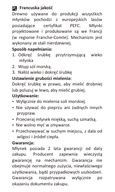 Francuska jakość Drewno używane do produkcji wszystkich młynków pochodzi z europejskich lasów posiadające certyfikat PEFC. Młynki projektowane i produkowane są we Francji (w regionie Franche-Comte). Mechanizm jest wykonany ze stali nierdzewnej. Sposób napełniania: 1. Odkręć śrubkę przytrzymującą wieko młynka 2. Wsyp sól morską. 3. Nałóż wieko i dokręć śrubkę Ustawienie grubości mielenia: Dokręć śrubkę w prawo, aby mielić drobniej lub poluzuj w lewo, aby mielić grubiej. Użytkowanie: Wyłącznie do mielenia soli morskiej. Nie używać do pieprzu ani żadnych innych przypraw. Przecieraj młynek miękką, suchą szmatką. Nie wolno myć w zmywarce. Przechowywać w suchym miejscu, z dala od wilgoci i źródeł ciepła. Gwarancja: Młynek posiada 2 lata gwarancji od daty zakupu. Producent zapewnia wieczystą gwarancję na mechanizm. Gwarancja nie obejmuje normalnego zużycia, niewłaściwego użytkowania, bądź przypadkowych uszkodzeń. Gwarancja rozpatrywana wyłącznie po okazaniu dokumentu zakupu.