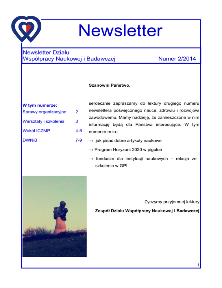 Newsletter Newsletter Działu Współpracy Naukowej i Badawczej Numer 2/2014 Szanowni Państwo, serdecznie zapraszamy do lektury drugiego numeru W tym numerze: newslettera poświęconego nauce, zdrowiu i rozwojowi Sprawy organizacyjne 2 Warsztaty i szkolenia 3 Wokół ICZMP 4-6 numerze m.in.: DWNiB 7-9 → jak pisać dobre artykuły naukowe zawodowemu. Mamy nadzieję, że zamieszczone w nim informację będą dla Państwa interesujące. W tym → Program Horyzont 2020 w pigułce → fundusze dla instytucji naukowych – relacja ze szkolenia w GPI Życzymy przyjemnej lektury Zespół Działu Współpracy Naukowej i Badawczej 1 Sprawy organizacyjne Dział Współpracy Naukowej i Badawczej rozpoczął wysyłkę newslettera, w którym będziemy informować Państwa o bieżących wydarzeniach związanych z nauką oraz zdrowiem (szkoleniach, konferencjach itp.), ciekawostkach ze świata nauki, możliwościach rozwoju zawodowego i personalnego, wydarzeniach w Łódzkim. Newsletter będzie do Państwa przesyłany co 2 tygodnie, a w wyjątkowych sytuacjach – częściej. Propozycje tematów związanych z działalnością ICZMP, ważnymi dla pracowników sprawami lub zapytaniami, które powinny Państwa zdaniem być poruszane na łamach Newslettera, prosimy przesyłać na adres mailowy: [email protected]. Zapewniamy anonimowość autorów tematów, w razie braku ich zgody na podanie danych osobowych. Zachęcamy również Państwa do przesyłania artykułów o dowolnej lub służbowej tematyce, które będziemy publikować w Newsletterze. Redakcja Newslettera: Dział Współpracy Naukowej i Badawczej Agnieszka Nebelska (Redaktor Naczelna) Tel. 1611 E-mail: [email protected] Agnieszka Klepacka Tel. 1605 E-mail: [email protected] Danuta Nieborak Tel. 1604 E-mail: [email protected] 2 Warsztaty i szkolenia Regionalny Punkt Kontaktowy Programów Badawczych UE zaprasza na: Konferencję „Horyzont 2020 – wyzwania i szanse dla polskiej nauki” Data: 9 grudnia (wtorek) Godzina: 9:30 – 16:00 Miejsce: Centralne Muzeum Włókiennictwa, ul. Piotrkowska 282, Łódź Prelegenci: m.in. Rafał ROWIŃSKI (Przedstawicielstwo KE w Polsce – Program H2020), Zygmunt KRASIŃSKI (Dyrektor KPK PB UE) Rejestracja: aby zarejestrować się na wydarzenie należy utworzyć konto w serwisie informacyjnym KPK Więcej informacji: http://www.kpk.gov.pl/?event=konferencjahoryzont-2020-wyzwania-i-szanse-dla-polskiej-nauki-w-lodzi 3 Wokół ICZMP Narodowe Centrum Nauki opublikowało na swojej stronie internetowej listę projektów, które uzyskały finansowanie w ramach konkursów Opus 7, Sonata 7 oraz Preludium 7. Nabór wniosków we wspomnianych konkursach trwał do 17 marca do 17 czerwca 2014 r. Dofinansowanie otrzymały łącznie 3 wnioski, w których ICZMP występował jako podmiot realizujący bądź partner projektu. Poniżej przedstawiamy listę zaakceptowanych projektów wraz z ich Kierownikami oraz wysokością przyznanych środków. 1. Dr Agnieszka w typowaniu i w przypadkach Gach, "Zastosowanie dalszej analizie zaburzeń rozwoju nowoczesnych nowych lub markerów funkcji technologii genetycznych układu płciowego, z utworzeniem ich ogólnopolskiego rejestru", 1 418 000 PLN 2. Lek. Magdalena Kajdos, "Mikropęcherzyki uwalniane z ognisk ektopowego endometrium jako potencjalny biomarker endometriozy", 137 825 PLN 3. KONSORCJUM Dr Izabela Nowak, Instytut Immunologii i Terapii Doświadczalnej im. Ludwika Hirszfelda Polskiej Akademii Nauk, "Związek polimorfizmu genów KIR, LILRB oraz ich ligandów - HLA-C i HLA-G z nawracającymi niepowodzeniami implantacji zarodka po zapłodnieniu in vitro", 1 002 600 PLN Gratulujemy sukcesu, życzymy powodzenia w realizacji grantu oraz dalszej pasji naukowej! 4 Wokół ICZMP W dniu 5 listopada br. Główny Punkt Informacyjny Funduszy Europejskich w Łodzi zorganizował spotkanie informacyjne poświęcone możliwościom dofinansowania nauki w nowej perspektywie finansowej. Jedną z nich będzie RPO WŁ, nad którym trwają obecnie prace. Spotkanie informacyjne poprowadziła Adrianna Kabacińska z GPI Departamentu Polityki Regionalnej UMWŁ, która przedstawiła uczestnikom projekty programów operacyjnych pod kątem finansowania badań oraz niezbędnej infrastruktury. Zaznaczyła, że krajowe i regionalne programy operacyjne nie zostały jeszcze oficjalne zatwierdzone, ale z uwagi na zaawansowany poziom prac możliwe jest zdobycie poglądowej wiedzy na temat wsparcia jednostek naukowych. Województwo Łódzkie znalazło się w pierwszej siódemce województw, które rozpoczęły w dniu 3 listopada br. w Brukseli negocjacje nowych Regionalnych Programów Operacyjnych, czyli dokumentów określających obszary wsparcia i działania w reprezentował nowej perspektywie Dyrektor finansowej Departamentu 2014-2020. Polityki Województwo Regionalnej Urzędu Marszałkowskiego – Artur Stelmach, a w decydującej fazie rozmów wspierał go Marszałek WŁ, Witold Stępień. W odróżnieniu od poprzedniego okresu programowania, nowy RPO będzie programem dwufunduszowym (korzystającym ze środków Europejskiego Funduszu Rozwoju Regionalnego oraz Europejskiego Funduszu Społecznego), w ramach którego realizowane będą działania o charakterze inwestycyjnym i społecznym. Nacisk zostanie położony na wspieranie innowacyjności, przedsiębiorczości, gospodarki niskoemisyjnej, ochrony środowiska, transportu, technologii informacyjno-komunikacyjnych, zatrudnienia, włączenia społecznego oraz edukacji. Zwiększenie nakładów na infrastrukturę naukowo-badawczą oraz powszechniejsze wykorzystanie wyników prac B+R w przedsiębiorstwach to cele, które znajdą się w Osi priorytetowej I: Badania, rozwój i komercjalizacja wiedzy. W ramach RPO Województwo Łódzkie ma otrzymać 2,25 mld euro unijnego wsparcia, czyli ok. 9,5 mld zł., 5 z których większość będzie dystrybuowana w konkursach. Prowadząca zwróciła również uwagę na nowy model współpracy rządu z samorządami, tzn. Kontrakt 