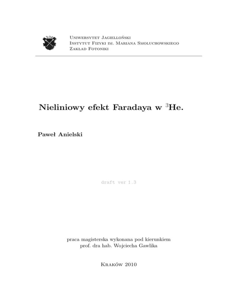 Uniwersytet Jagielloński Instytut Fizyki im. Mariana Smoluchowskiego Zakład Fotoniki Nieliniowy efekt Faradaya w 3He. Paweł Anielski draft ver 1.3 praca magisterska wykonana pod kierunkiem prof. dra hab. Wojciecha Gawlika Kraków 2010 Podziękowania Pragnę złożyć serdeczne wyrazy podziękowania mojemu promotorowi Panu prof. Wojciechowi Gawlikowi. Dziękuję również Panu dr hab. Jerzemu Zachorowskiemu za nieocenioną pomoc w sprawach formalnych i nie tylko. Praca niniejsza nie powstałaby, gdyby nie uprzejmość mgr. Krystiana Sycza, który pozwolił mi skorzystać ze swojej aparatury badawczej i z którym miałem przyjemność współpracować pisząc tę pracę. Winien też jestem szczególne podziękowania dr Szymonowi Pustelnemu za pomoc w prowadzeniu badań, zarówno tych udanych, jak i tych które kończyły się niepowodzeniem. Abstract W pracy niniejszej opisano zjawisko skręcenia polaryzacji światła przy przejściu przez pary atomowe 3 He zamknięte w komórce szklanej pod ciśnieniem 1.5 mBa. Komórka umieszczona była w polu magnetycznym rzędu 1 – 10 Gs skierowanym równolegle do kierunku propagacji światła. Wykorzystywano wiązkę laserową dostrojoną do przejścia 23 S → 23 P (1083 nm) o natężeniach od 0.5 do 250 µW/cm2 . Dodatkowo, aby wytworzyć populację w normalnie nie obsadzonym stanie 23 S, w komórce wytwarzano wyładowaie plazmowe przy pomocy pola RF wysokiej częstości. Przy tak dobranych warunkach przeprowadzania eksperymentu wartość kąta skręcenia polaryzacji jest zależna od natężenia światła – jest to tzw. nieliniowy efekt Faradaya. W części doświadczalnej tej pracy badanio zależność sygnałów kąta skręcenia w funkcji pola magnetycznego od natężenia wiązki światła. Szczególny nacisk położono na zbadanie wzrostu szerokości obserwowanych rezonansów ze wzrostem natężenia światła. W części teoretycznej opisano mechanizm powstawania efektu Faradaya. Liniowy efekt Faradaya opisano posługując się prostym modelem atomu dwupoziomowego i lorentzowskimi profilami współczynnika załamania uzyskiwanymi na bazie modelu oscylatorowego. Efekt nieliniowy przeanalizowano posługując się macierzą gęstości układu i wyliczając jej ewolucję w polu elektrycznym fali świetlnej oraz zewnętrznym polu magnetycznym. Nieliniowy efekt Faradya został do tej pory dokładnie zbadany w wielu ośrodkach atomowych (Na, Cs, Rb i in.), jednak jak dotąd nie był on obserwowany w helu. Niniejsza praca stanowi pierwszą taką próbę, obejmującą zmierzenie szerokości rezonansów skręcenia polaryzacji związanych ze strukturą Benettowską : ∼5 Gs, oraz koherencyjną : ∼0.4 Gs. Ponadto wykonane pomiary rozszerzenia rezonansów mocą wykazały dość niespodziewane zależności, odrębne od prezentowanych w literaturze: tj. zależności liniowej lub pierwiastkowej. Sugeruje to, że teoria na ten temat nie jest kompletna i wymaga odpowiedniego rozbudowania. ii Spis treści Wprowadzenie 1 1 Analiza teoretyczna nieliniowego efektu Faradaya 5 1.1 1.2 1.3 1.4 Ogólny opis zjawiska Faradaya i jego klasyfikacja jako efektu dwójłomnego . . . . . . . . . . . . . . . . . . . . . . . . . . . . . . . . . . . . 5 . Dwójłomność liniowa . . . . . . . . . . . . . . . . . . . . . . . . . 5 . Dwójłomność kołowa . . . . . . . . . . . . . . . . . . . . . . . . . . 6 . Efekt Faradaya jako zjawisko dwójłomne . . . . . . . . . . . . . . . 7 . Uwaga na temat dichroizmu . . . . . . . . . . . . . . . . . . . . . . 8 Mechanizm skręcenia polaryzacji w efekcie Faradaya . . . . . . . . . . 9 . Struktura poziomów typu V . . . . . . . . . . . . . . . . . . . . . . 9 . Lorentzowskie współczynniki załamania . . . . . . . . . . . . . . . 10 . Propagacja fali o polaryzacji liniowej . . . . . . . . . . . . . . . . . 12 . Własności kąta skręcenia polaryzacji . . . . . . . . . . . . . . . . . 13 Zależność kąta skręcenia polaryzacji od pola magnetycznego w liniowym efekcie Faradaya . . . . . . . . . . . . . . . . . . . . . . . . . . . 14 . Efekt Faradaya w warunkach dostrojenia do rezonansu . . . . . . . 16 . Uogólnienie dla dowolnej postaci współczynnika załamania . . . . . 16 Współczynnik załamania w elektrodynamice klasycznej . . . . . . . . 18 . Polaryzowalność atomowa . . . . . . . . . . . . . . . . . . . . . . . 18 . Tensorowy charakter polaryzowalności . . . . . . . . . . . . . . . . 19 . Zespolona postać polaryzowalności . . . . . . . . . . . . . . . . . . 20 . Nieliniowa odpowiedź ośrodka . . . . . . . . . . . . . . . . . . . . . 21 iii iv Spis treści . Polaryzowalność a podatność elektryczna . . . . . . . . . . . . . . 21 . Równania Maxwella w materii . . . . . . . . . . . . . . . . . . . . 22 1.5 Kwantowe obliczenie współczynnika załamania . . . . . . . . . . . . . 24 1.6 Wyznaczanie ewolucji macierzy gęstości . . . . . . . . . . . . . . . . . 24 . Ewolucja własna . . . . . . . . . . . . . . . . . . . . . . . . . . . . 25 . Relaksacja do stanu równowagowego . . . . . . . . . . . . . . . . . 26 . Ewolucja w obecności zaburzenia . . . . . . . . . . . . . . . . . . . 27 . Pełna ewolucja w obecności zaburzenia z relaksacją . . . . . . . . . 29 Metoda perturbacyjna . . . . . . . . . . . . . . . . . . . . . . . . . . 29 1.7 2 Doświadczalne badanie nieliniowego efektu Faradaya w 3 He 31 . Metody pomiaru kąta skręcenia . . . . . . . . . . . . . . . . . . . . 31 2.1 Opis układu doświadczalnego . . . . . . . . . . . . . . . . . . . . . . 33 2.2 Metoda prowadzenia pomiarów . . . . . . . . . . . . . . . . . . . . . 33 2.3 Uzyskane wyniki . . . . . . . . . . . . . . . . . . . . . . . . . . . . . 34 2.4 Analiza wyników . . . . . . . . . . . . . . . . . . . . . . . . . . . . . 34 3 Wnioski i podsumowanie 39 Bibliografia 42 Wprowadzenie Efekt Faradaya Praca niniejsza poświęcona jest badaniu nielinieowego efektu Faradaya. Jest to zjawisko, polegające na skręceniu liniowej polaryzacji światła o pew