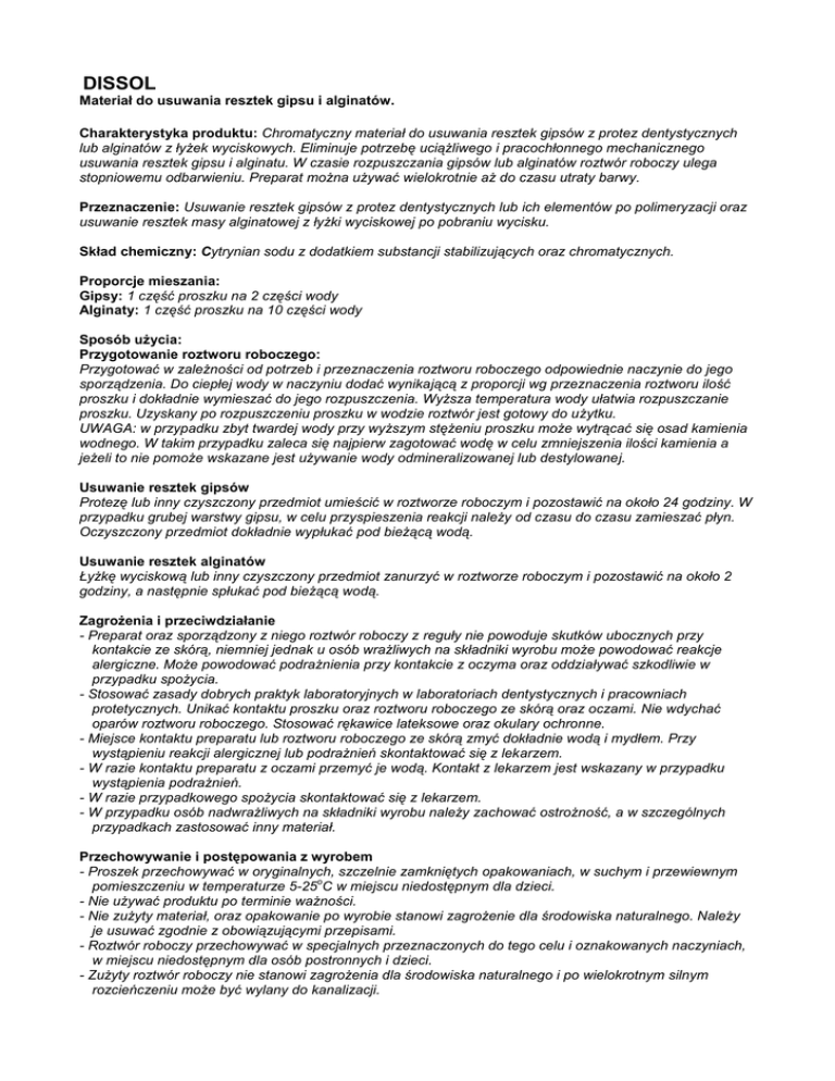 DISSOL Materiał do usuwania resztek gipsu i alginatów. Charakterystyka produktu: Chromatyczny materiał do usuwania resztek gipsów z protez dentystycznych lub alginatów z łyżek wyciskowych. Eliminuje potrzebę uciążliwego i pracochłonnego mechanicznego usuwania resztek gipsu i alginatu. W czasie rozpuszczania gipsów lub alginatów roztwór roboczy ulega stopniowemu odbarwieniu. Preparat można używać wielokrotnie aż do czasu utraty barwy. Przeznaczenie: Usuwanie resztek gipsów z protez dentystycznych lub ich elementów po polimeryzacji oraz usuwanie resztek masy alginatowej z łyżki wyciskowej po pobraniu wycisku. Skład chemiczny: Cytrynian sodu z dodatkiem substancji stabilizujących oraz chromatycznych. Proporcje mieszania: Gipsy: 1 część proszku na 2 części wody Alginaty: 1 część proszku na 10 części wody Sposób użycia: Przygotowanie roztworu roboczego: Przygotować w zależności od potrzeb i przeznaczenia roztworu roboczego odpowiednie naczynie do jego sporządzenia. Do ciepłej wody w naczyniu dodać wynikającą z proporcji wg przeznaczenia roztworu ilość proszku i dokładnie wymieszać do jego rozpuszczenia. Wyższa temperatura wody ułatwia rozpuszczanie proszku. Uzyskany po rozpuszczeniu proszku w wodzie roztwór jest gotowy do użytku. UWAGA: w przypadku zbyt twardej wody przy wyższym stężeniu proszku może wytrącać się osad kamienia wodnego. W takim przypadku zaleca się najpierw zagotować wodę w celu zmniejszenia ilości kamienia a jeżeli to nie pomoże wskazane jest używanie wody odmineralizowanej lub destylowanej. Usuwanie resztek gipsów Protezę lub inny czyszczony przedmiot umieścić w roztworze roboczym i pozostawić na około 24 godziny. W przypadku grubej warstwy gipsu, w celu przyspieszenia reakcji należy od czasu do czasu zamieszać płyn. Oczyszczony przedmiot dokładnie wypłukać pod bieżącą wodą. Usuwanie resztek alginatów Łyżkę wyciskową lub inny czyszczony przedmiot zanurzyć w roztworze roboczym i pozostawić na około 2 godziny, a następnie spłukać pod bieżącą wodą. Zagrożenia i przeciwdziałanie - Preparat oraz sporządzony z niego roztwór roboczy z reguły nie powoduje skutków ubocznych przy kontakcie ze skórą, niemniej jednak u osób wrażliwych na składniki wyrobu może powodować reakcje alergiczne. Może powodować podrażnienia przy kontakcie z oczyma oraz oddziaływać szkodliwie w przypadku spożycia. - Stosować zasady dobrych praktyk laboratoryjnych w laboratoriach dentystycznych i pracowniach protetycznych. Unikać kontaktu proszku oraz roztworu roboczego ze skórą oraz oczami. Nie wdychać oparów roztworu roboczego. Stosować rękawice lateksowe oraz okulary ochronne. - Miejsce kontaktu preparatu lub roztworu roboczego ze skórą zmyć dokładnie wodą i mydłem. Przy wystąpieniu reakcji alergicznej lub podrażnień skontaktować się z lekarzem. - W razie kontaktu preparatu z oczami przemyć je wodą. Kontakt z lekarzem jest wskazany w przypadku wystąpienia podrażnień. - W razie przypadkowego spożycia skontaktować się z lekarzem. - W przypadku osób nadwrażliwych na składniki wyrobu należy zachować ostrożność, a w szczególnych przypadkach zastosować inny materiał. Przechowywanie i postępowania z wyrobem - Proszek przechowywać w oryginalnych, szczelnie zamkniętych opakowaniach, w suchym i przewiewnym o pomieszczeniu w temperaturze 5-25 C w miejscu niedostępnym dla dzieci. - Nie używać produktu po terminie ważności. - Nie zużyty materiał, oraz opakowanie po wyrobie stanowi zagrożenie dla środowiska naturalnego. Należy je usuwać zgodnie z obowiązującymi przepisami. - Roztwór roboczy przechowywać w specjalnych przeznaczonych do tego celu i oznakowanych naczyniach, w miejscu niedostępnym dla osób postronnych i dzieci. - Zużyty roztwór roboczy nie stanowi zagrożenia dla środowiska naturalnego i po wielokrotnym silnym rozcieńczeniu może być wylany do kanalizacji. Opakowanie: 1000 g proszku, instrukcja użycia. Uwaga! Materiał do stosowania wyłącznie w pracach pomocniczych w gabinetach dentystycznych i laboratoriach protetycznych. Instrukcje pisemne, słowne oraz informacje przekazywane w czasie prezentacji przez Producenta wynikają z aktualnego poziomu techniki dentystycznej i technologii. Należy traktować je jako informacje obowiązujące. Informacje uzyskane od osób trzecich (ze względu na różny poziom ich uprawnień) nie zwalniają użytkownika od osobistego sprawdzenia czy preparat nadaje się do określonego przeznaczenia. Ponieważ jego stosowanie odbywa się bez możliwości kontroli ze strony producenta ogranicza to odpowiedzialność wytwórcy do wartości dostarczonego materiału. Szczegółowe informacje na temat wszystkich materiałów firmy Zhermapol można uzyskać pod numerem tel.: 0 602 701 001. Wszelkie uwagi dotyczące naszych wyrobów prosimy kierować na nasz adres. Zhermapol Sp. z o.o posiada System Zarządzania Jakością zgodny z wymaganiami ISO 9001/ISO 13485 certyfikowany przez jednostkę notyfikowaną 0120, SGS United Kingdom Ltd, Systems and Services Certification.