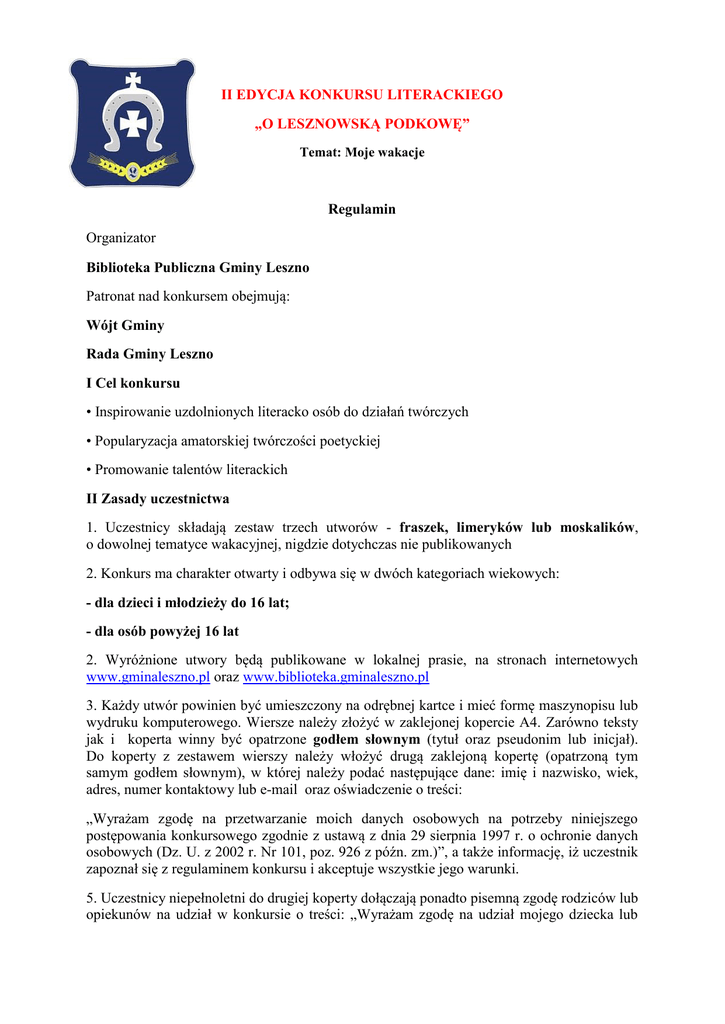 II EDYCJA KONKURSU LITERACKIEGO „O LESZNOWSKĄ PODKOWĘ” Temat: Moje wakacje Regulamin Organizator Biblioteka Publiczna Gminy Leszno Patronat nad konkursem obejmują: Wójt Gminy Rada Gminy Leszno I Cel konkursu • Inspirowanie uzdolnionych literacko osób do działań twórczych • Popularyzacja amatorskiej twórczości poetyckiej • Promowanie talentów literackich II Zasady uczestnictwa 1. Uczestnicy składają zestaw trzech utworów - fraszek, limeryków lub moskalików, o dowolnej tematyce wakacyjnej, nigdzie dotychczas nie publikowanych 2. Konkurs ma charakter otwarty i odbywa się w dwóch kategoriach wiekowych: - dla dzieci i młodzieży do 16 lat; - dla osób powyżej 16 lat 2. Wyróżnione utwory będą publikowane w lokalnej prasie, na stronach internetowych www.gminaleszno.pl oraz www.biblioteka.gminaleszno.pl 3. Każdy utwór powinien być umieszczony na odrębnej kartce i mieć formę maszynopisu lub wydruku komputerowego. Wiersze należy złożyć w zaklejonej kopercie A4. Zarówno teksty jak i koperta winny być opatrzone godłem słownym (tytuł oraz pseudonim lub inicjał). Do koperty z zestawem wierszy należy włożyć drugą zaklejoną kopertę (opatrzoną tym samym godłem słownym), w której należy podać następujące dane: imię i nazwisko, wiek, adres, numer kontaktowy lub e-mail oraz oświadczenie o treści: „Wyrażam zgodę na przetwarzanie moich danych osobowych na potrzeby niniejszego postępowania konkursowego zgodnie z ustawą z dnia 29 sierpnia 1997 r. o ochronie danych osobowych (Dz. U. z 2002 r. Nr 101, poz. 926 z późn. zm.)”, a także informację, iż uczestnik zapoznał się z regulaminem konkursu i akceptuje wszystkie jego warunki. 5. Uczestnicy niepełnoletni do drugiej koperty dołączają ponadto pisemną zgodę rodziców lub opiekunów na udział w konkursie o treści: „Wyrażam zgodę na udział mojego dziecka lub podopiecznego (imię i nazwisko) w II edycji konkursu literackiego „O Lesznowską Podkowę” oraz oświadczam, że zapoznałem się z regulaminem konkursu” – data, miejsce, podpis rodzica lub opiekuna. Autorzy na kopercie głównej powinni dopisać: - „Konkurs literacki – kategoria wiekowa do 16 lat” lub - „Konkurs literacki – kategoria wiekowa powyżej 16 lat”. 6. Prace konkursowe należy nadsyłać na adres: Urząd Gminy w Lesznie, 05-084 Leszno, Aleja Wojska Polskiego 21 albo składać osobiście w sekretariacie Urzędu Gminy lub w Bibliotece Publicznej Gminy Leszno. 7. Organizatorzy nie zwracają nadesłanych utworów. III Nagrody 1. Prace konkursowe oceni jury powołane przez organizatorów. Zdobywcy pierwszych miejsc zostaną uhonorowani statuetką „lesznowskiej podkowy”. Ponadto w każdej kategorii przyznane będą 3 nagrody rzeczowe. 2. W skład jury wchodzą: Liliana de Vacqueret – nauczyciel polonista Barbara Zagończyk – nauczyciel polonista Barbara Pszczółkowska – radna Rady Gminy Leszno Mirosława Dymek – kustosz biblioteki 3. Jury wyłoni spośród siebie przewodniczącego, który podejmie ostateczną decyzję w sprawach spornych związanych z konkursem. IV Terminy 1. Okres nadsyłania prac konkursowych trwa od 1 lipca do 31 sierpnia 2014 r. (decyduje data stempla pocztowego). 2. Ogłoszenie wyników i wręczenie nagród nastąpi 7 września 2014 r. podczas festynu gminnego. 3. O wynikach konkursu organizator powiadamia tylko laureatów. V Postanowienia ogólne 1. Nadesłane utwory mogą być wykorzystane przez organizatorów konkursu poprzez ich publikację w lokalnej prasie i na stronach internetowych. Autorzy utworów, przekazując ich egzemplarze na potrzeby niniejszego konkursu, przenoszą nieodpłatnie na organizatorów autorskie prawa majątkowe na wskazanym polu eksploatacji. Ponadto organizatorzy zastrzegają sobie możliwość nieodpłatnej publikacji nagrodzonych wierszy, w postaci wydania ich zbioru (tomiku). UWAGA: Prace nie spełniające powyższych wymogów nie będą rozpatrywane!