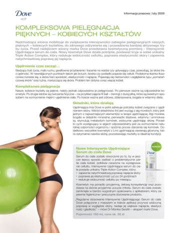 Informacja prasowa | luty 2009 KOMPLEKSOWA PIELĘGNACJA PIĘKNYCH – KOBIECYCH KSZTAŁTÓW Nadchodząca wiosna mobilizuje do zwiększenia intensywności zabiegów pielęgnacyjnych naszych, pięknych – kobiecych kształtów, do zdrowego odżywiania się i prowadzenia bardziej aktywnego trybu życia. Przed nadejściem wiosny marka Dove przedstawia kosmetyczną premierę – Intensywnie Ujędrniające serum do ciała. Nowy kosmetyk Dove działa potrójnie, ponieważ kryje w sobie unikalny Triple Action Complex, który redukuje widoczność cellulitu, poprawia elastyczność skóry i zapewnia natychmiastową poprawę jej napięcia. Ujędrnianie czas zacząć… Siedzący tryb życia, mało ruchu, gwałtowne przybieranie i tracenie na wadze czy upływający czas, powodują, że skóra traci jędrność. W newralgicznych punktach takich jak brzuch, biodra czy pośladki pojawia się cellulit. Podskórna tkanka tłuszczowa rozrasta się, a skóra traci spoistość, elastyczność i napięcie. Pojawiają się nierówności i zagłębienia typu „pomarańczowej skórki” oraz luźna, marszcząca się skóra. Problem ten dotyka coraz więcej kobiet. Kompleksowa pielęgnacja Nasze, kobiece kształty są piękne, należy jednak odpowiednio je pielęgnować. Po pierwsze ważne są odpowiednie kosmetyki. Po drugie istotne są ćwiczenia fizyczne – na przykład zajęcia fit ball – treningi z dużą piłką, które są świetnym sposobem na wzmocnienie mięśni i ujędrnienie ciała. Po trzecie ważna jest zdrowa, zbilansowana, bogata w witaminy dieta. Składniki, które działają Ujędrniająca linia Dove w pełni adresuje potrzeby kobiet związane z ujędrnianiem skóry. Wśród składników linii jest wyciąg z alg morskich, który jest jednym z najważniejszych elementów w terapii ujędrniającej. Algi morskie, bogate w składniki mineralne, pierwiastki śladowe, witaminy i aminokwasy, stymulują metabolizm komórek, widocznie ujędrniając skórę. Ponadto cynk występujący w algach odpowiedzialny jest za wzmocnienie naturalnej odporności organizmu i opóźnia proces starzenia się komórek. Dodatkowo wszystkie kosmetyki z Linii ujędrniającej zawierają glicerynę, która optymalnie nawilża skórę, pozostawiając kształty w idealnej kondycji. Nowe Intensywnie Ujędrniające Serum do ciała Dove NOWOŚĆ Serum do ciała zostało stworzone po to, by w jesz-cze lepszy sposób zadbać o problematyczne par-tie ciała kobiet, dotkliwie narażone na występowa-nie cellulitu. Intensywnie Ujędrniające serum do cia-ła posiada unikalny Triple Action Complex, który: • zapewnia natychmiastową poprawę napięcia skóry • poprawia jej elastyczność już po 24 godzinach • redukuje widoczność cellulitu po miesiącu. Kosmetyk ma ponadto przyjemną, żelową konsystencję oraz encję ora raz pozostawia na skórze przyjemne uczucie chłodu. Serum m do ciała zostało zamknięte w bardzo wygodnym opakowaniu z aplikatorem, katorem, który zapewnia higieniczne i precyzyjne dozowanie produktu. „Regularne stosowanie Intensywnie Ujędrniającego Serum do ciała Dove połączone z masażem w trakcie aplikacji przynosi widoczną poprawę w wyglądzie skóry, nadaje jej większe napięcie, elastyczność i gładkość.” – mówi Dr Monika Serafin – ekspert marki Dove. Pojemność 150 ml, cena ok. 26 zł Pozostałe kosmetyki z linii Ujędrniającej Dove: Ujędrniający żel pod prysznic Dove to pierwszy krok w pielęgnacji skóry dotkniętej cellulitem. Zawiera ekstrakt z alg morskich, od lat znanych ze swoich właściwości ujędrniających. Drugim ważnym składnikiem żelu są ceramidy z ziaren słonecznika, czyli jedne z najważniejszych lipidów występujących w naskórku. Skóra po kąpieli jest wygładzona i nawilżona, a jej równowaga hydrolipidowa jest utrzymana. Pojemność 250 ml, cena ok. 9 zł Ujędrniający balsam do ciała Dove łączy w sobie dobroczynne działanie ekstraktu z alg, ceramidów obecnych w ekstrakcie z olejku z ziaren słonecznika i kremu nawilżającego Dove. Codzienne stosowanie na skórę całego ciała nie tylko ujędrnia, ale również uelastycznia i wygładza naskórek, zarazem pomagając się zrelaksować i odprężyć. Pojemność 250 ml, cena ok. 17 zł Intensywnie Ujędrniający żel-krem Dove przeznaczony jest do intensywnej pielęgnacji brzucha, bioder, pośladków, czyli dokładnie tych miejsc, które są szczególnie narażone na pojawienie się cellulitu. Zawartość ekstraktu z alg wspomaga metabolizm komórkowy. Intensywnie Ujędrniający żel-krem silnie nawilża skórę, a wielonienasycone kwasy tłuszczowe przywracają jej elastyczność i sprężystość. Kosmetyk łatwo i szybko wchłania się w skórę, nie pozostawiając tłustej, lepiącej się warstwy. Delikatna konsystencja jest rezultatem doskonałej kombinacji, która powstała w wyniku wykorzystania najlepszych właściwości zarówno żelu, jak i kremu. Pojemność 200 ml, Cena ok. 26 zł Ujędrniające serum do dekoltu Dove zostało stworzone do pielęgnacji delikatnej skóry biustu i dekoltu. Produkt zawiera ekstrakt z alg morskich, stosowany w Thalasso Terapii, który znany jest ze swoich właściwości ujędrniających. Zapobiega on również utracie elastyczności skóry. Natomiast zawarty w serum kolagen wraz z innymi składnikami widocznie wygładza i napina skórę. Stosowanie ujędrniającego serum do dekoltu zapobiega utracie elastyczności, sprawia, że skóra staje się gładsza i bardziej sprężysta. Pojemność 100 ml, cena ok. 26 zł Kosmetyki marki Dove są produkowane i dystrybuowane przez międzynarodową firmę Unilever. Dove to kosmetyki do pielęgnacji ciała i włosów, stosowane przez kobiety na całym świecie. Pierwszym, historycznym kosmetykiem Dove jest kostka myjąca, która ma już ponad pięćdziesiąt lat. W Stanach Zjednoczonych kostka myjąca Dove obecna jest na rynku od 1956 r. Dove jest marką zbudowaną na prostej i ponadczasowej zasadzie: tw