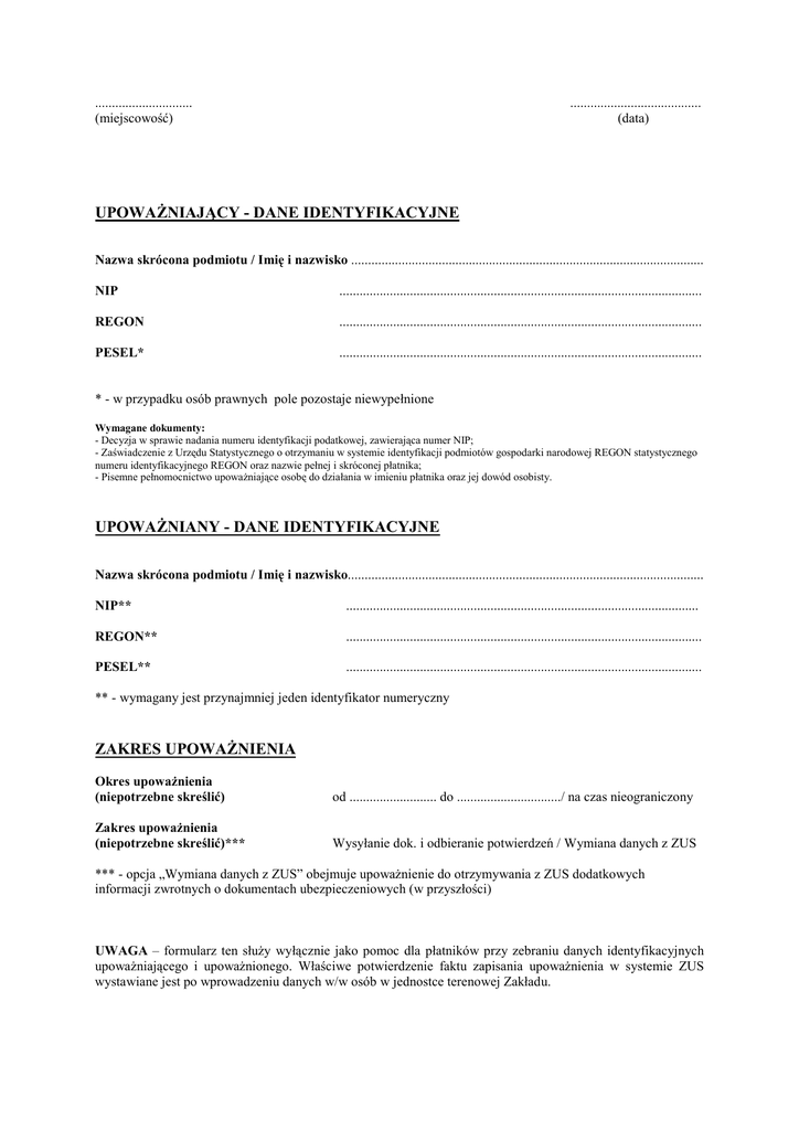 ............................. (miejscowość) ....................................... (data) UPOWAŻNIAJĄCY - DANE IDENTYFIKACYJNE Nazwa skrócona podmiotu / Imię i nazwisko ......................................................................................................... NIP ............................................................................................................ REGON ............................................................................................................ PESEL* ............................................................................................................ * - w przypadku osób prawnych pole pozostaje niewypełnione Wymagane dokumenty: - Decyzja w sprawie nadania numeru identyfikacji podatkowej, zawierająca numer NIP; - Zaświadczenie z Urzędu Statystycznego o otrzymaniu w systemie identyfikacji podmiotów gospodarki narodowej REGON statystycznego numeru identyfikacyjnego REGON oraz nazwie pełnej i skróconej płatnika; - Pisemne pełnomocnictwo upoważniające osobę do działania w imieniu płatnika oraz jej dowód osobisty. UPOWAŻNIANY - DANE IDENTYFIKACYJNE Nazwa skrócona podmiotu / Imię i nazwisko.......................................................................................................... NIP** ......................................................................................................... REGON** .......................................................................................................... PESEL** .......................................................................................................... ** - wymagany jest przynajmniej jeden identyfikator numeryczny ZAKRES UPOWAŻNIENIA Okres upoważnienia (niepotrzebne skreślić) od .......................... do .............................../ na czas nieograniczony Zakres upoważnienia (niepotrzebne skreślić)*** Wysyłanie dok. i odbieranie potwierdzeń / Wymiana danych z ZUS *** - opcja „Wymiana danych z ZUS” obejmuje upoważnienie do otrzymywania z ZUS dodatkowych informacji zwrotnych o dokumentach ubezpieczeniowych (w przyszłości) UWAGA – formularz ten służy wyłącznie jako pomoc dla płatników przy zebraniu danych identyfikacyjnych upoważniającego i upoważnionego. Właściwe potwierdzenie faktu zapisania upoważnienia w systemie ZUS wystawiane jest po wprowadzeniu danych w/w osób w jednostce terenowej Zakładu.
