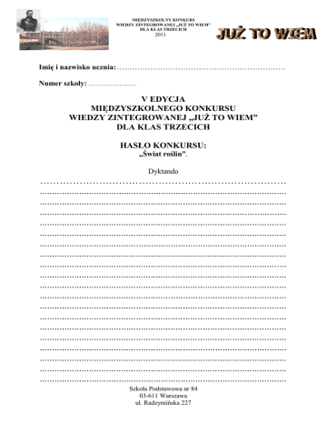 MIĘDZYSZKOLNY KONKURS WIEDZY ZINTEGROWANEJ „JUŻ TO WIEM” DLA KLAS TRZECICH 2011 Imię i nazwisko ucznia: ………………………………………………………… Numer szkoły: …………………. V EDYCJA MIĘDZYSZKOLNEGO KONKURSU WIEDZY ZINTEGROWANEJ „JUŻ TO WIEM” DLA KLAS TRZECICH HASŁO KONKURSU: „Świat roślin”. Dyktando ………………………………………………………………… .................................................................................................... .................................................................................................... .................................................................................................... .................................................................................................... .................................................................................................... .................................................................................................... .................................................................................................... .................................................................................................... .................................................................................................... .................................................................................................... .................................................................................................... .................................................................................................... .................................................................................................... .................................................................................................... .................................................................................................... .................................................................................................... .................................................................................................... .................................................................................................... .................................................................................................... Szkoła Podstawowa nr 84 03-611 Warszawa ul. Radzymińska 227 MIĘDZYSZKOLNY KONKURS WIEDZY ZINTEGROWANEJ „JUŻ TO WIEM” DLA KLAS TRZECICH 2011 Imię i nazwisko ucznia: …………………………………………………………. Numer szkoły: …………………. V EDYCJA MIĘDZYSZKOLNEGO KONKURSU WIEDZY ZINTEGROWANEJ „JUŻ TO WIEM” DLA KLAS TRZECICH HASŁO KONKURSU: „Świat roślin”. Przed Tobą zestaw ciekawych zadań. Uważnie czytaj wszystkie polecenia. Zadania możesz rozwiązywać w dowolnej kolejności. Nie martw się, jeśli nie potrafisz od razu rozwiązać któregoś z nich. Przejdź do następnego. Do problemowego polecenia wrócisz później. Życzymy powodzenia 1. Przeczytaj tekst a następnie wykonaj polecenia: Sałatka Hipolita Czas przygotowania: 35 minut Ilość porcji: 3 Składniki: 2 ziemniaki 1 marchew 1 cebula 1/2 puszki zielonego groszku 2 rzodkiewki kawałek świeżego ogórka (długości około 6-8 cm) 1 nieduży por (zielona część) 2 jajka 1 łyżka musztardy 2 łyżki majonezu sól i pieprz do smaku Szkoła Podstawowa nr 84 03-611 Warszawa ul. Radzymińska 227 MIĘDZYSZKOLNY KONKURS WIEDZY ZINTEGROWANEJ „JUŻ TO WIEM” DLA KLAS TRZECICH 2011 Etapy przygotowania: Ziemniaki umyć i ugotować w mundurkach. Obrać i pokroić w kostkę. Marchew obrać i ugotować, a potem również pokroić w kostkę. Cebulę obrać i pokroić w talarki. Pora pokroić w cienkie krążki. Rzodkiewki i ogórka pokroić w kostkę. Groszek odsączyć z zalewy. Jaja ugotować na twardo, ostudzić, obrać i drobno pokroić w kostkę. Wszystkie warzywa i jajka dokładnie wymieszać. Doprawić solą i pieprzem Dodać musztardę oraz majonez i wszystko jeszcze raz dokładnie wymieszać. Sałatka gotowa. 2. Odpowiedz na pytania dotyczące tekstu z zadania 1: Jakie warzywa wchodzą w skład sałatki? ………………………………………………………………………… ………………………………………………………………………… W jaki sposób należy pokroić pora? ………………………………………………………………………… Jak należy przygotować marchew? ………………………………………………………………………… Ile potrzeba czasu na przygotowanie sałatki? ………………………………………………………………………… Co znaczy określenie „ziemniak w mundurku”? ………………………………………………………………………… 3. Z tekstu zadania pierwszego wypisz po 3 rzeczowniki i czasowniki. Rzeczowniki 4. Czasowniki Od podanych przymiotników utwórz przysłówki: nieduży-………………………….. świeży-…………………………… zielonego-………………………… Szkoła Podstawowa nr 84 03-611 Warszawa ul. Radzymińska 227 MIĘDZYSZKOLNY KONKURS WIEDZY ZINTEGROWANEJ „JUŻ TO WIEM” DLA KLAS TRZECICH 2011 5. Przymiotniki zapisz w stopniu równym, wyższym i najwyższym Stopień równy Stopień wyższy ……………….. ............................ drobne ………………. 6. ……..………….. cieńsza Stopień najwyższy największy ………………..….............. ……………….…………... Opisz w pięciu zdaniach jedno z warzyw wchodzących w skład sałatki. Pamiętaj o jego wyglądzie, właściwościach i zastosowaniu. Koniecznie napisz o jadalnej części tego warzywa. ………………………………………………………………………… ………………………………………………………………………… ………………………
