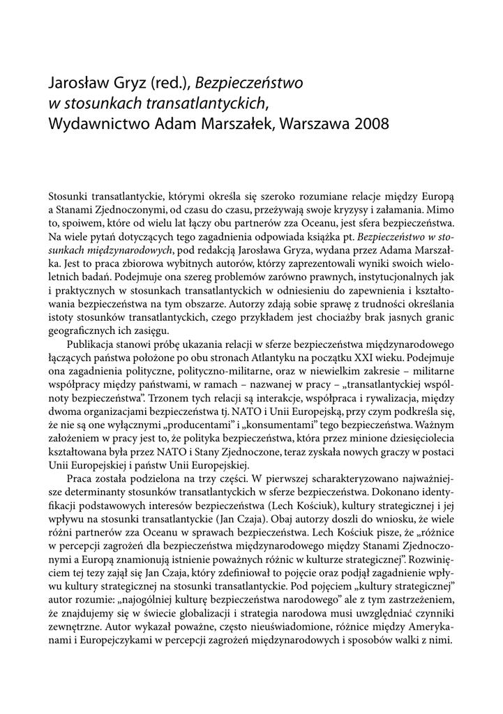 Jarosław Gryz (red.), Bezpieczeństwo w stosunkach transatlantyckich, Wydawnictwo Adam Marszałek, Warszawa 2008 Stosunki transatlantyckie, którymi określa się szeroko rozumiane relacje między Europą a Stanami Zjednoczonymi, od czasu do czasu, przeżywają swoje kryzysy i załamania. Mimo to, spoiwem, które od wielu lat łączy obu partnerów zza Oceanu, jest sfera bezpieczeństwa. Na wiele pytań dotyczących tego zagadnienia odpowiada książka pt. Bezpieczeństwo w stosunkach międzynarodowych, pod redakcją Jarosława Gryza, wydana przez Adama Marszałka. Jest to praca zbiorowa wybitnych autorów, którzy zaprezentowali wyniki swoich wieloletnich badań. Podejmuje ona szereg problemów zarówno prawnych, instytucjonalnych jak i praktycznych w stosunkach transatlantyckich w odniesieniu do zapewnienia i kształtowania bezpieczeństwa na tym obszarze. Autorzy zdają sobie sprawę z trudności określania istoty stosunków transatlantyckich, czego przykładem jest chociażby brak jasnych granic geograficznych ich zasięgu. Publikacja stanowi próbę ukazania relacji w sferze bezpieczeństwa międzynarodowego łączących państwa położone po obu stronach Atlantyku na początku XXI wieku. Podejmuje ona zagadnienia polityczne, polityczno-militarne, oraz w niewielkim zakresie – militarne współpracy między państwami, w ramach – nazwanej w pracy – „transatlantyckiej wspólnoty bezpieczeństwa”. Trzonem tych relacji są interakcje, współpraca i rywalizacja, między dwoma organizacjami bezpieczeństwa tj. NATO i Unii Europejską, przy czym podkreśla się, że nie są one wyłącznymi „producentami” i „konsumentami” tego bezpieczeństwa. Ważnym założeniem w pracy jest to, że polityka bezpieczeństwa, która przez minione dziesięciolecia kształtowana była przez NATO i Stany Zjednoczone, teraz zyskała nowych graczy w postaci Unii Europejskiej i państw Unii Europejskiej. Praca została podzielona na trzy części. W pierwszej scharakteryzowano najważniejsze determinanty stosunków transatlantyckich w sferze bezpieczeństwa. Dokonano identyfikacji podstawowych interesów bezpieczeństwa (Lech Kościuk), kultury strategicznej i jej wpływu na stosunki transatlantyckie (Jan Czaja). Obaj autorzy doszli do wniosku, że wiele różni partnerów zza Oceanu w sprawach bezpieczeństwa. Lech Kościuk pisze, że „różnice w percepcji zagrożeń dla bezpieczeństwa międzynarodowego między Stanami Zjednoczonymi a Europą znamionują istnienie poważnych różnic w kulturze strategicznej”. Rozwinięciem tej tezy zajął się Jan Czaja, który zdefiniował to pojęcie oraz podjął zagadnienie wpływu kultury strategicznej na stosunki transatlantyckie. Pod pojęciem „kultury strategicznej” autor rozumie: „najogólniej kulturę bezpieczeństwa narodowego” ale z tym zastrzeżeniem, że znajdujemy się w świecie globalizacji i strategia narodowa musi uwzględniać czynniki zewnętrzne. Autor wykazał poważne, często nieuświadomione, różnice między Amerykanami i Europejczykami w percepcji zagrożeń międzynarodowych i sposobów walki z nimi. RECENZJE I OMÓWIENIA 245 Kwestię instytucjonalnych podstaw bezpieczeństwa w stosunkach transatlantyckich podjął Ryszard Niedźwiecki, zaś ciekawy problem korelacji siły gospodarczej i militarnej w państwach Sojuszu zrealizowali Paweł Górski i Janusz Płaczek. Zdaniem autorów geopolityka traci na znaczeniu kosztem geoekonomiki bowiem rywalizacja między państwami we współczesnym świecie dotyczy przede wszystkim kwestii gospodarczych. W artykule przeanalizowano siłę ekonomiczną i militarną państw Sojuszu Północnoatlantyckiego i zaprezentowano wyniki badań, z których wyszło, że państwa europejskie odchodzą od prymatu siły na rzecz siły ekonomicznej. Z kolei, dwa następne artykuły, pierwszy autorstwa Stanisława Kozieja pt. Unia Europejska – Sojusz Północnoatlantycki. Wzajemne relacje w dziedzinie bezpieczeństwa i obronności, drugi Andrzeja Ciupińskiego pt. Rozwój europejskiej autonomii strategicznej jako wyzwanie dla spójności transatlantyckiej wspólnoty bezpieczeństwa, poświęcone są stosunkom Unii Europejskiej i NATO w sferze bezpieczeństwa w kontekście budowy przez Unię Europejską autonomii strategicznej, termin użyty przez Andrzeja Ciupińskiego. Obaj autorzy różnią się co do oceny aktywności UE w sferze bezpieczeństwa. Stanisław Koziej pisze, że „Aktualnie wydaje się, że są bardzo małe szanse zrealizowania ambitnego celu ustanowienia skutecznej struktury militarnej w Unii Europejskiej” (133). Jest on sceptyczny także wobec „skuteczności obrony europejskiej” (135). Z kolei, Andrzej Ciupiński dochodzi do wniosku, że „możliwa jest „własna europejska droga” w polityce bezpieczeństwa i obrony” (162), a „rozwój tzw. europejskich zdolności obronnych obiektywnie leży w interesie USA oraz bezsprzecznie sprzyja bezpieczeństwu światowemu” (180). Następny dział tematyczny poświęcono współczesnej roli Sojuszu Północnoatlantyckiego w budowaniu transatlantyckiej wspólnoty bezpieczeństwa. Marian Kozub w artykule pt. Sojusz Północnoatlantycki w początkach XXI wieku zidentyfikował zaangażowanie NATO na rzecz bezpieczeństwa i doszedł do konstatacji, że „Jeżeli NATO ma być skutecznym „menedżerem bezpieczeństwa”, wyposażonym w siły szybkiego reagowania i działającym na skalę globalną, konieczne staje się sprostanie wyraźnym brakom w dziedzinie jego operatywności” (195). Tego typu braki pojawiły się podczas operacji w Afganistanie. Autor podjął także ambitny cel – próbę projekcji, jak będzie wyglądał Sojusz Północnoatlantycki w perspektywie roku 2020–2025. Kontynuacją tematyki przyszłości NATO zajął się, w kolejnym artykule, Stanisław Koziej, który przedstawił nowe wyzwania dla Sojuszu Północnoatlantyckiego w XXI wieku i wyróżnił główne zadania strategiczne w zakresie re