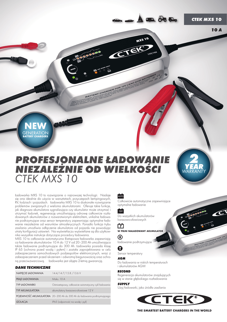 CTEK MXS 10 10 A 2 YEAR WARRANTY PROFESJONALNE ŁADOWANIE NIEZALEŻNIE OD WIELKOŚCI CTEK MXS 10 Ładowarka MXS 10 to rozwiązanie o najnowszej technologii. Nadaje się ona idealnie do użycia w warsztatach, przyczepach kempingowych, RV, łodziach i pojazdach. Ładowarka MXS 10 to doskonałe rozwiązanie problemów związanych z wieloma akumulatorami. Oferuje takie funkcje, jak diagnoza akumulatora sygnalizująca czy akumulator może otrzymać i utrzymać ładunek, regenerację umożliwiającą odnowę całkowicie rozładowanych akumulatorów z rozwarstwionym elektrolitem, unikalne ładowanie podtrzymujące oraz sensor temperatury zapewniając optymalne ładowanie niezależnie od warunków atmosferycznych. Ponadto funkcja trybu zasilania umożliwia odłączenie akumulatora od pojazdu nie powodując utraty konfiguracji ustawień. Na wyświetlaczu wyświetlane są dla użytkownika wszystkie instrukcje dotyczące procedury ładowania. MXS 10 to całkowicie automatyczna 8-etapowa ładowarka zapewniająca ładowanie akumulatorów 10 A do 12 V od 20–200 Ah umożliwiająca także ładowanie podtrzymujące do 300 Ah. Ładowarka posiada klasę IP 65 (ochrona przed wodą i pyłem) i została zaprojektowana w celu zabezpieczenia samochodowych podzespołów elektronicznych, wraz z zabezpieczeniem przed iskrzeniem i odwrotną biegunowością oraz ochroną przeciwzwarciową. Ładowarka jest objęta 2-letnią gwarancją. DANE TECHNICZNE NAPIĘCIE ŁADOWANIA 14.4/14.7/15.8 /13.6 V PRĄD ŁADOWANIA Maks. 10 A TYP ŁADOWARKI Ośmioetapowy, całkowicie automatyczny cykl ładowania TYP AKUMULATORA akumulatory kwasowo-ołowiowe 12 V POJEMNOŚĆ AKUMULATORA 20–200 Ah do 300 Ah do ładowania podtrzymującego IZOLACJA IP65 (odporność na wodę i pył) AUTO Całkowicie automatyczne zapewniające optymalne ładowanie 2 YEAR WARRANTY 2 YEAR WARRANTY Do wszystkich akumulatorów kwasowo-ołowiowych w pełni naładowany akumulator Ładowanie podtrzymujące Sensor temperatury Do ładowania w niskich temperaturach i akumulatorów AGM Regeneracja akumulatorów znajdujących się w stanie głębokiego rozładowania Użyj ładowarki, jako źródła zasilania 2 YEAR WARRANTY CTEK MXS 10 10 A 8 ETAPOWY PROCES ŁADOWANIA CTEK CTEK COMFORT CONNECT–eyelet M6 CTEK MXS 10 TEMPERATURE SENSOR CTEK COMFORT CONNECT–clamp •Ładowanie 8 etapowe całkowicie automatyczne i podtrzymujące z kontrolowaną temperaturą zapewniają maksymalną żywotność akumulatora i wysokie parametry pracy. •Wiele akcesoriów ułatwia użycie ładowarki do wielu różnych akumulatorów. •Odporna na wodę umożliwiając użycie także podczas opadów deszczu lub śniegu. •Zasilanie ułatwia wymianę akumulatora nie powodując utraty zapisanych w pojeździe danych. •Opatentowana ładowanie podtrzymujące zapewnia maksymalną żywotność oraz wysokie parametry pracy •Regeneracja akumulatorów znajdujących się w stanie głębokiego rozładowania •Opatentowane odsiarczanie zapewnia długą żywotność akumulatora. •Bez łuków, z zabezpieczeniem przed zwarciami i odwrotną biegunowością zapewniając bezproblemową eksploatację. •Automatyczne wykrywanie zużytych akumulatorów umożliwia uniknięcie przykrych niespodzianek. WYSTARCZY PODŁĄCZYĆ 1 ETAP 1 DESULPHATION Impulsowe napięcie usuwa siarczany z płyt ołowiowych akumulatora, przywracając jego pojemność. 2 ETAP 2 SOFT START Sprawdzenie, czy akumulator może przyjmować ładunek. Ładowanie rozpoczyna się, jeśli akumulator jest OK. 3 ETAP 3 BULK Ładowanie maksymalnym prądem aż do około 80 % pojemności akumulatora. 4 ETAP 4 ABSORPTION, GOTOWY DO UŻYCIA Ładowanie malejącym prądem, aby zmaksymalizować ładunek do 100 % pojemności akumulatora. 5 ETAP 5 ANALYSE Sprawdzenie, czy akumulator może utrzymać ładunek. Akumulatory, które nie są w stanie utrzymać ładunku, mogą wymagać wymiany. 6 ETAP 6 RECOND Regeneracja akumulatorów znajdujących się w stanie głębokiego rozładowania. 2 7 ETAP 7 FLOAT, CAŁKOWICIE NAŁADOWANY Utrzymywanie napięcia akumulatora na maksymalnym poziomie poprzez dostarczanie ładunku stałonapięciowego. 3 1 1 8 ETAP 8 PULSE, ŁADOWANIE PODTRZYMUJĄCE Utrzymywanie akumulatora na poziomie 95-100 % pojemności. Ładowarka monitoruje napięcie akumulatora i w razie potrzeby dostarcza impuls w celu utrzymania akumulatora w stanie całkowicie naładowanym.  1. Połączyć ładowarkę z akumulatorem. 2. Podłączyć ładowarkę do sieciowego gniazda ściennego. — Podświetlona zostanie lampka zasilania 3. Nacisnąć przycisk MODE, aby wybrać program ładowania. Akumulatory standardowe i nieco większe Do ładowania w niskich temperaturach i akumulatorów AGM Regeneracja akumulatorów znajdujących się w stanie głębokiego rozładowania GWARANCJA JAKOŚCI CTEK Wszystkie profesjonalne ładowarki CTEK są objęte 2 letnią gwarancją. Na wszelkie pytania dotyczące ładowania i ładowarek CTEK odpowiada dział obsługi klienta CTEK. Wszystkie produkty i rozwiązania zaprojektowane i oferowane przez CTEK charakteryzują się bezpieczeńswem, prostotą i elastycznością. CTEK dostarcza ładowarki do ponad 60 krajów na całym świecie. CTEK to także dostawca OEM dla najbardziej renomowanych producentów pojazdów i motocykli na świecie. Kontakt z działem wsparcia dla klienta: [email protected] zasilanie 12 V lub ładowanie konserwacyjne Dział wsparcia klienta: [email protected] www.ctek.com 20015641B PL 4. ... i gotowe.