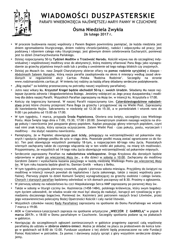 WIADOMOŚCI DUSZPASTERSKIE PARAFII WNIEBOWZIĘCIA NAJŚWIĘTSZEJ MARYI PANNY W CZUCHOWIE Ósma Niedziela Zwykła 26 lutego 2017 r. • W procesie budowania naszej wspólnoty z Panem Bogiem powinniśmy pamiętać, że każda niedziela jest dniem zgromadzenia liturgicznego, dniem rodziny chrześcijańskiej, radości i odpoczynku od pracy; jest podstawą i rdzeniem całego roku liturgicznego; jest głównym dniem celebrowania Eucharystii, ponieważ jest to dzień Zmartwychwstania Pańskiego. • Dzisiaj rozpoczynamy 50-ty Tydzień Modlitw o Trzeźwość Narodu. Kościół wzywa nas do szczególnej indywidualnej i wspólnotowej modlitwy oraz do abstynencji, którą możemy ofiarować Panu Bogu jako wynagrodzenie za grzechy pijaństwa innych osób lub z prośbą o uwolnienie od tego nałogu bliskich czy znajomych. • Dzisiaj po Mszach św. nasz Zespół Charytatywny zbierze ofiary na pomoc rodzinie syryjskiej z Aleppo Abdulmasih Saleem Hanashe, którą nasza parafia zaadoptowała na okres 6 miesięcy według zasad określonych w regulaminie akcji Caritas Polska "Rodzina Rodzinie". Szczegóły na stronie www.rodzinarodzinie.caritas.pl W imieniu tej rodziny za każdą ofiarę składamy serdeczne podziękowanie. • „Bóg zapłać” za kolektę przeznaczoną na potrzeby naszej wspólnoty parafialnej. • Jutro nasz wikary ks. Krzysztof Kregel będzie obchodził 50-tą r. swoich Urodzin. Składamy Mu nasze najlepsze życzenia zdrowia i błogosławieństwa Bożego. Jesteśmy wdzięczni za Jego pracę duszpasterską i modlitwę dla dobra naszej Parafii. Wszystkich Parafian zapraszamy na Mszę św. w intencji ks. Krzysztofa o 17:00. • Kończy się tegoroczny karnawał. W naszej Parafii rozpoczynamy tzw. Czterdziestogodzinne nabożeństwo przez które chcemy przeprosić Pana Boga za grzechy i przygotować się na Wielki Post. Zapraszamy do nawiedzenia Najśw. Sakramentu w niedzielę od 12:30 do 15:30, a w poniedziałek i wtorek rano do 9:00 i po południu od 15:00 do 17:00. • W tym tygodniu, 1 marca, przypada Środa Popielcowa. Otwiera ona święty, szczególny czas Wielkiego Postu. Msze Święte tego dnia o 7:00, 15:30, 17:00 i 20:00. Zewnętrznym znakiem naszego wejścia na drogę pokuty i nawrócenia jest posypanie głowy popiołem. Kapłan posypując głowy wiernych popiołem, czyni nad nimi znak krzyża, który oznacza oczyszczenie. Zatem Wielki Post – czas pokuty, postu, wyrzeczeń i modlitwy – ma służyć naszemu nawróceniu. • Pamiętajmy, że w Popielec obowiązuje post ścisły, polegający na wstrzemięźliwości od pokarmów mięsnych i spożyciu jednego posiłku do syta w ciągu dnia. Pozostałe posiłki muszą zostać ograniczone co do ilości. Ten post obowiązuje wszystkich pomiędzy 18-tym, a rozpoczęciem 60-tego roku życia. Pozostałych wiernych zachęcamy także do czynnego włączenia się w ten wielki akt pokutny, na miarę ich możliwości. Przypominamy, że wszystkich od 14-tego roku życia obowiązuje wstrzemięźliwość od pokarmów mięsnych. • Serdecznie zapraszamy Parafian na nabożeństwa wielkopostne. Droga Krzyżowa dla dorosłych będzie odprawiana w piątki po wieczornej Mszy św., a dla dzieci w sobotę o 10:00. Zachęcamy do modlitwy Gorzkimi Żalami i wysłuchania kazania pasyjnego w każdą niedzielę Wielkiego Postu po wieczornej Mszy św. W tym roku kazania będzie głosił ks. Damian Grelik - wikary z Bełku. • W tym tygodniu przypada pierwszy czwartek, piątek i pierwsza sobota miesiąca. Przyjdźmy do świątyni na modlitwę w intencji nowych powołań do kapłaństwa i życia zakonnego, także z naszej wspólnoty parafialnej. Pierwszy piątek to dzień Komunii Świętej wynagradzającej za grzechy osobiste i całego świata. Chorych i starszych parafian będziemy odwiedzać w ich domach począwszy od 8:30. Prosimy o zgłoszenia. • W pierwszą sobotę na nabożeństwo ku czci Niepokalanego Serca NMP zapraszamy po porannej Mszy św. • Także w sobotę w liturgii czcimy św. Kazimierza (1458-1484), polskiego królewicza, który swym bogobojnym życiem udowodnił, że władza wcale nie musi być okazją do nadużyć, korupcji ani rywalizacją w gromadzeniu doczesnego bogactwa. Ponieważ św. Kazimierz jest patronem naszych braci Litwinów, przez jego wstawiennictwo polecajmy Bożej Opatrzności Kościół i cały naród litewski. • Wszystkich członków naszej Rady Parafialnej zapraszamy na spotkanie do Domu Parafialnego we wtorek 7 marca o 19:00. • MOK w Czerwionce-Leszczynach zaprasza na spotkanie artystyczne „WIECZÓR Z GABRIELĄ” w piątek 3 marca 2017r. o 18:00 w Domu parafialnym w Czuchowie. Szczegóły spotkania podane są na plakatach w gablotce. • Nawiązując do szczegółowych ogłoszeń zamieszczonych w gablotce pragniemy zaprosić całą wspólnotę parafialną do udziału w zbiórce elektro-śmieci. Można je składać na placu za probostwem do końca lutego w godzinach od 8:00 do 12:00. Fundusze uzyskane z tej zbiórki będą przeznaczone na cele Fundacji Pomoc Kościołowi w potrzebie. Za pomoc i darowany zużyty sprzęt z góry wszystkim serdecznie dziękujemy.