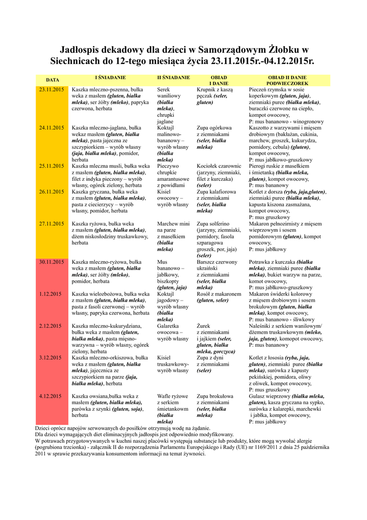 Jadłospis dekadowy dla dzieci w Samorządowym Żłobku w Siechnicach do 12-tego miesiąca życia 23.11.2015r.-04.12.2015r. DATA I ŚNIADANIE II ŚNIADANIE 23.11.2015 Kaszka mleczno-pszenna, bułka weka z masłem (gluten, białka mleka), ser żółty (mleko), papryka czerwona, herbata Krupnik z kaszą pęczak (seler, gluten) 24.11.2015 Kaszka mleczno-jaglana, bułka wekaz masłem (gluten, białka mleka), pasta jajeczna ze szczypiorkiem – wyrób własny (jaja, białka mleka), pomidor, herbata Kaszka mleczna musli, bułka weka z masłem (gluten, białka mleka), filet z indyka pieczony – wyrób własny, ogórek zielony, herbata Kaszka gryczana, bułka weka z masłem (gluten, białka mleka), pasta z ciecierzycy – wyrób własny, pomidor, herbata Serek waniliowy (białka mleka), chrupki jaglane Koktajl malinowobananowy – wyrób własny (białka mleka) Pieczywo chrupkie amarantusowe z powidłami Kisiel owocowy – wyrób własny Zupa solferino (jarzyny, ziemniaki, pomidory, fasola szparagowa groszek, por, jaja) (seler) Barszcz czerwony ukraiński z ziemniakami (seler, białka mleka) Rosół z makaronem (gluten, seler) 25.11.2015 26.11.2015 27.11.2015 Kaszka ryżowa, bułka weka z masłem (gluten, białka mleka), dżem niskosłodziny truskawkowy, herbata Marchew mini na parze z masełkiem (białka mleka) 30.11.2015 Kaszka mleczno-ryżowa, bułka weka z masłem (gluten, białka mleka), ser żółty (mleko), pomidor, herbata 1.12.2015 Kaszka wielozbożowa, bułka weka z masłem (gluten, białka mleka), pasta z fasoli czerwonej – wyrób własny, papryka czerwona, herbata 2.12.2015 Kaszka mleczno-kukurydziana, bułka weka z masłem (gluten, białka mleka), pasta mięsnowarzywna – wyrób własny, ogórek zielony, herbata Kaszka mleczno-orkiszowa, bułka weka z masłem (gluten, białka mleka), jajecznica ze szczypiorkiem na parze (jaja, białka mleka), herbata Mus bananowo – jabłkowy, biszkopty (gluten, jaja) Koktajl jagodowy – wyrób własny (białka mleka) Galaretka owocowa – wyrób własny 3.12.2015 4.12.2015 Kaszka owsiana,bułka weka z masłem (gluten, białka mleka), parówka z szynki (gluten, soja), herbata Kisiel truskawkowywyrób własny OBIAD I DANIE Zupa ogórkowa z ziemniakami (seler, białka mleka) Kociołek czarownic (jarzyny, ziemniaki, filet z kurczaka) (seler) Zupa kalafiorowa z ziemniakami (seler, białka mleka) Żurek z ziemniakami i jajkiem (seler, gluten, białka mleka, gorczyca) Zupa z dyni z ziemniakami (seler) OBIAD II DANIE PODWIECZOREK Pieczeń rzymska w sosie koperkowym (gluten, jaja), ziemniaki puree (białka mleka), buraczki czerwone na ciepło, kompot owocowy, P: mus bananowo - winogronowy Kaszotto z warzywami i mięsem drobiowym (bakłażan, cukinia, marchew, groszek, kukurydza, pomidory, cebula) (gluten), kompot owocowy, P: mus jabłkowo-gruszkowy Pierogi ruskie z masełkiem i śmietanką (białka mleka, gluten), kompot owocowy, P: mus bananowy Kotlet z dorsza (ryba, jaja,gluten), ziemniaki puree (białka mleka), kapusta kiszona zasmażana, kompot owocowy, P: mus gruszkowy Makaron pełnozirnisty z mięsem wieprzowym i sosem pomidorowym (gluten), kompot owocowy, P: mus jabłkowy Potrawka z kurczaka (białka mleka), ziemniaki puree (białka mleka), bukiet warzyw na parze, komot owocowy, P: mus jabłkowo-gruszkowy Makaron świderki kolorowy z mięsem drobiowym i sosem brokułowym (gluten, białka mleka), kompot owocowy, P: mus bananowo - śliwkowy Naleśniki z serkiem wanilowym/ dżemem truskawkowym (mleko, jaja, gluten), komopot owocowy, P: mus bananowy Kotlet z łososia (ryba, jaja, gluten), ziemniaki puree (białka mleka), surówka z kapusty pekińskiej, pomidora, oliwy z oliwek, kompot owocowy, P: mus gruszkowy Gulasz wieprzowy (białka mleka, gluten), kasza gryczana na sypko, surówka z kalarepki, marchewki i jabłka, kompot owocowy, P: mus jabłkowy Wafle ryżowe Zupa brokułowa z serkiem z ziemniakami śmietankowm (seler, białka (białka mleka) mleka) Dzieci oprócz napojów serwowanych do posiłków otrzymują wodę na żądanie. Dla dzieci wymagających diet eliminacyjnych jadłospis jest odpowiednio modyfikowany. W potrawach przygotowywanych w kuchni naszej placówki występują substancje lub produkty, które mogą wywołać alergie (pogrubiona trzcionka) - załącznik II do rozporządzenia Parlamentu Europejskiego i Rady (UE) nr 1169/2011 z dnia 25 października 2011 w sprawie przekazywania konsumentom informacji na temat żywności.