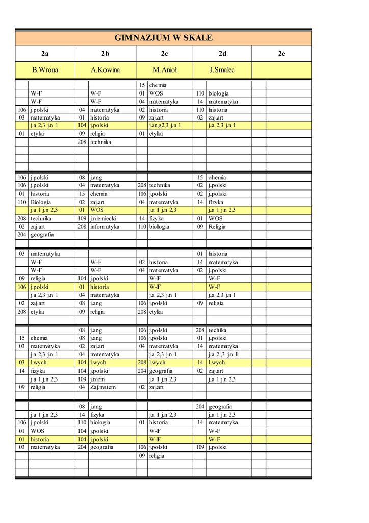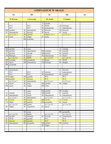 GIMNAZJUM W SKALE 2a 2b 2c 2d B.Wrona A.Kowina M.Anioł J.Smalec W-F W-F 106 j.polski 03 matematyka j.a 2,3 j.n 1 01 etyka 04 01 104 09 208 W-F W-F matematyka historia j.polski religia technika 08 04 15 02 01 109 208 j.ang matematyka chemia zaj.art WOS j.niemiecki informatyka 208 technika 106 j.polski 04 matematyka j.a 1 j.n 2,3 14 fizyka 110 biologia 03 matematyka W-F W-F 09 religia 106 j.polski j.a 2,3 j.n 1 02 zaj.art 208 etyka 104 01 04 08 09 W-F W-F j.polski historia matematyka j.ang religia 02 historia 04 matematyka W-F W-F j.a 2,3 j.n 1 106 j.polski 208 etyka 15 chemia 03 matematyka j.a 2,3 j.n 1 03 l.wych 14 fizyka j.a 1 j.n 2,3 09 religia 08 08 02 04 104 104 109 04 j.ang j.ang zaj.art matematyka l.wych j.polski j.niem Zaj.matem 106 j.polski 106 j.polski 04 matematyka j.a 2,3 j.n 1 208 l.wych 204 geografia j.a 1 j.n 2,3 02 zaj.art j.a 1 j.n 2,3 j.polski WOS historia matematyka 08 14 110 104 104 204 j.ang fizyka biologia j.polski j.polski geografia 106 106 01 110 j.polski j.polski historia Biologia j.a 1 j.n 2,3 208 technika 02 zaj.art 204 geografia 106 01 01 03 15 01 04 02 09 chemia WOS matematyka historia zaj.art j.ang2,3 j.n 1 01 etyka j.a 1 j.n 2,3 01 historia W-F W-F 106 j.polski 09 religia 110 14 110 02 biologia matematyka historia zaj.art j.a 2,3 j.n 1 15 02 02 14 chemia j.polski j.polski fizyka j.a 1 j.n 2,3 01 WOS 09 Religia 01 historia 14 matematyka 02 j.polski W-F W-F j.a 2,3 j.n 1 09 religia 208 techika 01 j.polski 14 matematyka j.a 2.,3 j.n 1 14 l.wych 02 zaj.art j.a 1 j.n 2,3 204 geografia j.a 1 j.n 2,3 14 matematyka W-F W-F 109 j.polski 2e