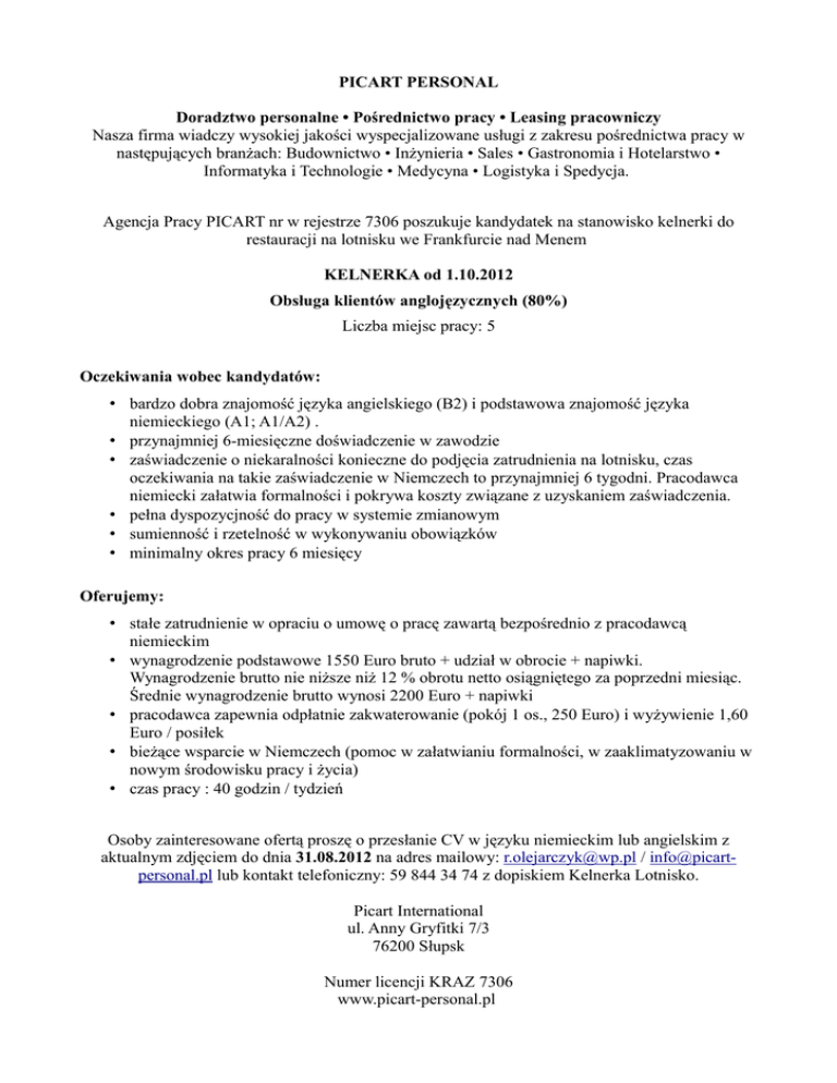 PICART PERSONAL Doradztwo personalne • Pośrednictwo pracy • Leasing pracowniczy Nasza firma wiadczy wysokiej jakości wyspecjalizowane usługi z zakresu pośrednictwa pracy w następujących branżach: Budownictwo • Inżynieria • Sales • Gastronomia i Hotelarstwo • Informatyka i Technologie • Medycyna • Logistyka i Spedycja. Agencja Pracy PICART nr w rejestrze 7306 poszukuje kandydatek na stanowisko kelnerki do restauracji na lotnisku we Frankfurcie nad Menem KELNERKA od 1.10.2012 Obsługa klientów anglojęzycznych (80%) Liczba miejsc pracy: 5 Oczekiwania wobec kandydatów: • bardzo dobra znajomość języka angielskiego (B2) i podstawowa znajomość języka niemieckiego (A1; A1/A2) . • przynajmniej 6-miesięczne doświadczenie w zawodzie • zaświadczenie o niekaralności konieczne do podjęcia zatrudnienia na lotnisku, czas oczekiwania na takie zaświadczenie w Niemczech to przynajmniej 6 tygodni. Pracodawca niemiecki załatwia formalności i pokrywa koszty związane z uzyskaniem zaświadczenia. • pełna dyspozycjność do pracy w systemie zmianowym • sumienność i rzetelność w wykonywaniu obowiązków • minimalny okres pracy 6 miesięcy Oferujemy: • stałe zatrudnienie w opraciu o umowę o pracę zawartą bezpośrednio z pracodawcą niemieckim • wynagrodzenie podstawowe 1550 Euro bruto + udział w obrocie + napiwki. Wynagrodzenie brutto nie niższe niż 12 % obrotu netto osiągniętego za poprzedni miesiąc. Średnie wynagrodzenie brutto wynosi 2200 Euro + napiwki • pracodawca zapewnia odpłatnie zakwaterowanie (pokój 1 os., 250 Euro) i wyżywienie 1,60 Euro / posiłek • bieżące wsparcie w Niemczech (pomoc w załatwianiu formalności, w zaaklimatyzowaniu w nowym środowisku pracy i życia) • czas pracy : 40 godzin / tydzień Osoby zainteresowane ofertą proszę o przesłanie CV w języku niemieckim lub angielskim z aktualnym zdjęciem do dnia 31.08.2012 na adres mailowy: [email protected] / [email protected] lub kontakt telefoniczny: 59 844 34 74 z dopiskiem Kelnerka Lotnisko. Picart International ul. Anny Gryfitki 7/3 76200 Słupsk Numer licencji KRAZ 7306 www.picart-personal.pl PICART PERSONAL Doradztwo personalne • Pośrednictwo pracy • Leasing pracowniczy Nasza firma wiadczy wysokiej jakości wyspecjalizowane usługi z zakresu pośrednictwa pracy w następujących branżach: Budownictwo • Inżynieria • Sales • Gastronomia i Hotelarstwo • Informatyka i Technologie • Medycyna • Logistyka i Spedycja. Agencja Pracy PICART nr w rejestrze 7306 poszukuje kandydów na stanowisko kucharz do restauracji na lotnisku we Frankfurcie nad Menem KUCHARZ od 1.10.2012 Liczba miejsc pracy: 5 Oczekiwania wobec kandydatów: • wykształcenie gastronomiczne • podstawowa komunikatywna znajomość języka niemieckiego • zaświadczenie o niekaralności konieczne do podjęcia zatrudnienia na lotnisku, czas oczekiwania na takie zaświadczenie w Niemczech to przynajmniej 6 tygodni. Pracodawca niemiecki załatwia formalności i pokrywa koszty związane z uzyskaniem zaświadczenia. • pełna dyspozycyjność do pracy w systemie zmianowym • sumienność i rzetelność w wykonywaniu obowiązków • minimalny okres pracy 6 miesięcy Oferujemy: • stałe zatrudnienie w opraciu o umowę o pracę zawartą bezpośrednio z pracodawcą niemieckim, możliwe zatrudnienie na okres 6 miesiecy • wynagrodzenie od 1800 – 2500 Euro brutto w zależności od doświadczenia • pracodawca zapewnia odpłatnie zakwaterowanie (pokój 1 os., 250 Euro) • bieżące wsparcie w Niemczech (pomoc w załatwianiu formalności, w zaaklimatyzowaniu w nowym środowisku pracy i życia) • czas pracy : 40 - 50 godzin (5 dni w tygodniu) • urlop 24 dni Zakres obowiązków: • smażenie mięsa (steki, sznycel), przygotowywanie sosów i prostych dodatków Osoby zainteresowane ofertą proszę o przesłanie CV w języku niemieckim z aktualnym zdjęciem do dnia 31.08.2012 na adres mailowy: [email protected] / [email protected] lub kontakt telefoniczny: 59 844 34 74 z dopiskiem Kucharz Lotnisko. Picart International ul. Anny Gryfitki 7/3 76200 Słupsk Numer licencji KRAZ 7306 www.picart-personal.pl PICART PERSONAL Doradztwo personalne • Pośrednictwo pracy • Leasing pracowniczy Nasza firma wiadczy wysokiej jakości wyspecjalizowane usługi z zakresu pośrednictwa pracy w następujących branżach: Budownictwo • Inżynieria • Sales • Gastronomia i Hotelarstwo • Informatyka i Technologie • Medycyna • Logistyka i Spedycja. Dla ekskluzywnego hotelu 5* we Frankfurcie nad Menem, poszukujemy kandydatów / kandydatki na stanowisko: Młodszy Kelner od 1.07.2012 Liczba miejsc pracy: 3 Oczekiwania wobec kandydatów: • • • • • wykształcenie kierunkowe lub 4-letnie doświadczenie w zawodzie przynajmniej rok doświadczenie na podobnym stanowisku dobra znajomość języka niemieckiego i angielskiego umożliwiająca swobodną komunikację pełna dyspozycyjność do pracy w systemie zmianowym sumienność i rzetelność w wykonywaniu obowiązków Oferujemy: • pracę w ekskluzywnym hotelu 5* w Hessen • stałe zatrudnienie w opraciu o umowę o pracę zawartą bezpośrednio z pracodawcą niemieckim • pracodawca zapewania zakwaterowanie (pokoje 1 os., 250 Euro) i wyżywienie (30 x 3 posiłki, 80 Euro) • wynagrodzenie brutto 1827 Euro + wysokie napiwki • bieżące wsparcie w Niemczech (pomoc w załatwianiu formalności, w zaaklimatyzowaniu w nowym środowisku pracy i życia) • czas pracy: 40 godzin / tydzień • urlop 25 dni Zakres obowiązków: • dbanie o czystość i estetykę w miejscy pracy wg ustalonych procedur • podawanie posiłków i napojów, rekomendajca dań z menu, przyjmowanie zamówień • obsługa bankietów, imprez okolicznościowych Osoby zainteresowane ofertą proszę o przesłanie CV w języku niemieckim na adres mailowy: [email protected] / [email protected] lub kontakt telefoniczny: 59 844 34 74 Picart Personal ul. Anny Gryfitki 7/