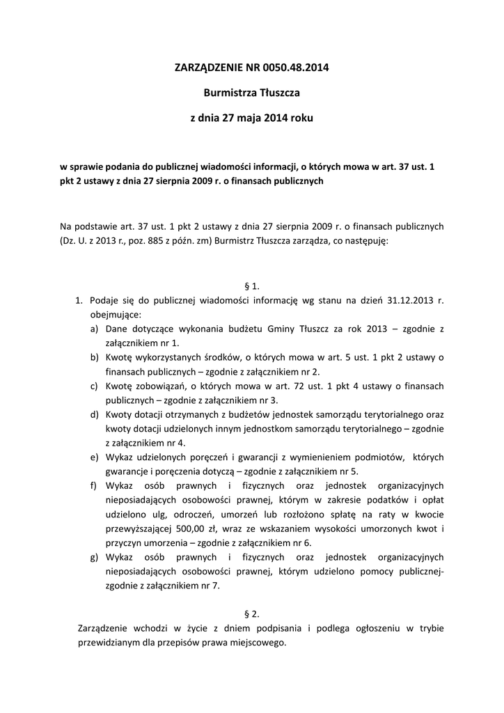 ZARZĄDZENIE NR 0050.48.2014 Burmistrza Tłuszcza z dnia 27 maja 2014 roku w sprawie podania do publicznej wiadomości informacji, o których mowa w art. 37 ust. 1 pkt 2 ustawy z dnia 27 sierpnia 2009 r. o finansach publicznych Na podstawie art. 37 ust. 1 pkt 2 ustawy z dnia 27 sierpnia 2009 r. o finansach publicznych (Dz. U. z 2013 r., poz. 885 z późn. zm) Burmistrz Tłuszcza zarządza, co następuję: § 1. 1. Podaje się do publicznej wiadomości informację wg stanu na dzień 31.12.2013 r. obejmujące: a) Dane dotyczące wykonania budżetu Gminy Tłuszcz za rok 2013 – zgodnie z załącznikiem nr 1. b) Kwotę wykorzystanych środków, o których mowa w art. 5 ust. 1 pkt 2 ustawy o finansach publicznych – zgodnie z załącznikiem nr 2. c) Kwotę zobowiązań, o których mowa w art. 72 ust. 1 pkt 4 ustawy o finansach publicznych – zgodnie z załącznikiem nr 3. d) Kwoty dotacji otrzymanych z budżetów jednostek samorządu terytorialnego oraz kwoty dotacji udzielonych innym jednostkom samorządu terytorialnego – zgodnie z załącznikiem nr 4. e) Wykaz udzielonych poręczeń i gwarancji z wymienieniem podmiotów, których gwarancje i poręczenia dotyczą – zgodnie z załącznikiem nr 5. f) Wykaz osób prawnych i fizycznych oraz jednostek organizacyjnych nieposiadających osobowości prawnej, którym w zakresie podatków i opłat udzielono ulg, odroczeń, umorzeń lub rozłożono spłatę na raty w kwocie przewyższającej 500,00 zł, wraz ze wskazaniem wysokości umorzonych kwot i przyczyn umorzenia – zgodnie z załącznikiem nr 6. g) Wykaz osób prawnych i fizycznych oraz jednostek organizacyjnych nieposiadających osobowości prawnej, którym udzielono pomocy publicznejzgodnie z załącznikiem nr 7. § 2. Zarządzenie wchodzi w życie z dniem podpisania i podlega ogłoszeniu w trybie przewidzianym dla przepisów prawa miejscowego. Załącznik nr 1 do Zarządzenia nr 0050.48.2014 Burmistrza Tłuszcza z dnia 27.05.2014r. DANE DOTYCZĄCE WYKONANIA BUDŻETU ZA 2013 ROK 1. Wykonane dochody budżetowe: 55 231 700,34 zł w tym: - dochody bieżące: 45 882 747,62 zł, - dochody majątkowe: 9 348 952,72 zł. 2. Wykonane wydatki budżetowe: 69 837 762,85 zł w tym: - wydatki bieżące: 41 639 020,93 zł, - wydatki majątkowe: 28 198 741,92 zł. 3. Deficyt: 14 606 062,51 zł 4. Przychody ogółem: 19 637 254,60 zł w tym: - kredyty i pożyczki: 13 671 590,82 zł 5. Rozchody ogółem: 1 952 068,37 zł (spłata kredytów i pożyczek) Załącznik nr 2 do Zarządzenia nr 0050.48.2014 Burmistrza Tłuszcza z dnia 27.05.2014r. KWOTA WYKORZYSTANYCH ŚRODKÓW, O KTÓRYCH MOWA W ART. 5 UST. 1 PKT 2 Kwota wykorzystanych środków, o których mowa w art. 5 ust. 1 pkt 2 wyniosła: 10 553 437,91 zł. Załącznik nr 3 do Zarządzenia nr 0050.48.2014 Burmistrza Tłuszcza z dnia 27.05.2014r. KWOTA ZOBOWIĄZAŃ, O KTÓRYCH MOWA W ART. 72 UST. 1 PKT 4 Zobowiązania, o których mowa w art. 72 ust. 1 pkt 4 w Gminie Tłuszcz nie wystąpiły w 2013 roku. Załącznik nr 4 do Zarządzenia nr 0050.48.2014 Burmistrza Tłuszcza z dnia 27.05.2014r. KWOTA DOTACJI OTRZYMANYCH Z BUDŻETÓW JST ORAZ KWOTA DOTACJI UDZIELONYCH INNYM JST 1. Kwota dotacji otrzymanych z budżetów jednostek samorządu terytorialnego wyniosła 625 648,00 zł, w tym: a) Dotacja otrzymana ze Starostwa Powiatu Wołomińskiego na utrzymanie zieleni przydrożnej oraz chodników w pasie dróg powiatowych w granicach administracyjnych Gminy Tłuszcz w kwocie 41 308,00 zł, b) Dotacja otrzymana z Gminy Wołomin na dowożenie osób niepełnosprawnych z terenu Gminy Wołomin do Powiatowego Środowiskowego Domu Samopomocy w Tłuszczu w kwocie 4 340,00 zł, c) Dotacja z Urzędu Marszałkowskiego Województwa Mazowieckiego na budowę drogi gminnej we wsi Jaźwie w kwocie 60 000,00 zł, d) Dotacja z Ministerstwa Sportu i Turystyki na budowę hali sportowej przy Szkole Podstawowej w Tłuszczu w kwocie 370 000,00 zł, e) Dotacja z Wojewódzkiego Funduszu Ochrony Środowiska i Gospodarki Wodnej w Warszawie na zakup samochodu dla OSP Tłuszcz w kwocie 150 000,00 zł. 2. Kwota dotacji udzielonych innym jednostkom samorządu terytorialnego wyniosła 282 637,13 zł, w tym: a) Dotacja przekazana do Województwa Mazowieckiego na realizację projektu Rozwój elektronicznej administracji w samorządach województwa mazowieckiego wspomagającej niwelowanie dwudzielności potencjału województwa w kwocie 7 999,11 zł, b) Dotacja przekazana do Starostwa Powiatu Wołomińskiego na pokrycie kosztów dowozu osób niepełnosprawnych do Powiatowego Środowiskowego Domu Pomocy Społecznej w kwocie 10 00,00 zł, c) Dotacja przekazana do Starostwa Powiatu Wołomińskiego na budowę nowego chodnika rondo Kury-Stryjki, gm. Tłuszcz w kwocie 100 000,00 zł, d) Dotacja przekazana do Starostwa Powiatu Wołomińskiego na budowę chodnika w Postoliskach w kwocie 55 762,92 zł. e) Dotacja przekazana do Starostwa Powiatu Wołomińskiego na budowę chodnika we wsi Dzięcioły w kwocie 108 875,10 zł. Załącznik nr 5 do Zarządzenia nr 0050.48.2014 Burmistrza Tłuszcza z dnia 27.05.2014 WYKAZ UDZIELONYCH PORĘCZEŃ I GWARANCJI Gmina Tłuszcz nie udzieliła poręczeń i gwarancji na rzecz innych podmiotów. Załącznik nr 6 do Zarządzenia nr 0050.48.2014 Burmistrza Tłuszcza z dnia 27.05.2014r. WYKAZ OSÓB PRAWNYCH I FIZYCZNYCH ORAZ JEDNOSTEK ORGANIZACYJNYCH NIEPOSIADAJĄCYCH OSOBOWOŚCI PRAWNEJ, KTÓRYM W ZAKRESIE PODATKÓW I OPŁAT UDZIELONO ULG, ODROCZEŃ, UMORZEŃ LUB ROZŁOŻONO SPŁATĘ NA RATY W 2013 ROKU Lp. 1 2 3 4 5 6 Imię i nazwisko Zakład Gospodarki Komunalnej i Mieszkaniowej Piotr Ołdak Tadeusz Białek Wiesława Giza Dariusz Antoni Woźniak Gryz Mirosław 7 8 Jan Borczyński 9 Zakład Gospodarki Komunalnej i Mieszkaniowej Marek Dzioban Zdzisław Dąbrowski Adam Lachowicz 10 11 12 Ryszard Getka Kwota 81 804,00 14 897,00 1 080,00 Rodzaj ulgi Umorzony podatek Umorzone odsetki Rozłożenie na raty Przyczyna umorzenia Trudna sytuacja finansowa Trudna sytuacja finansowa 5