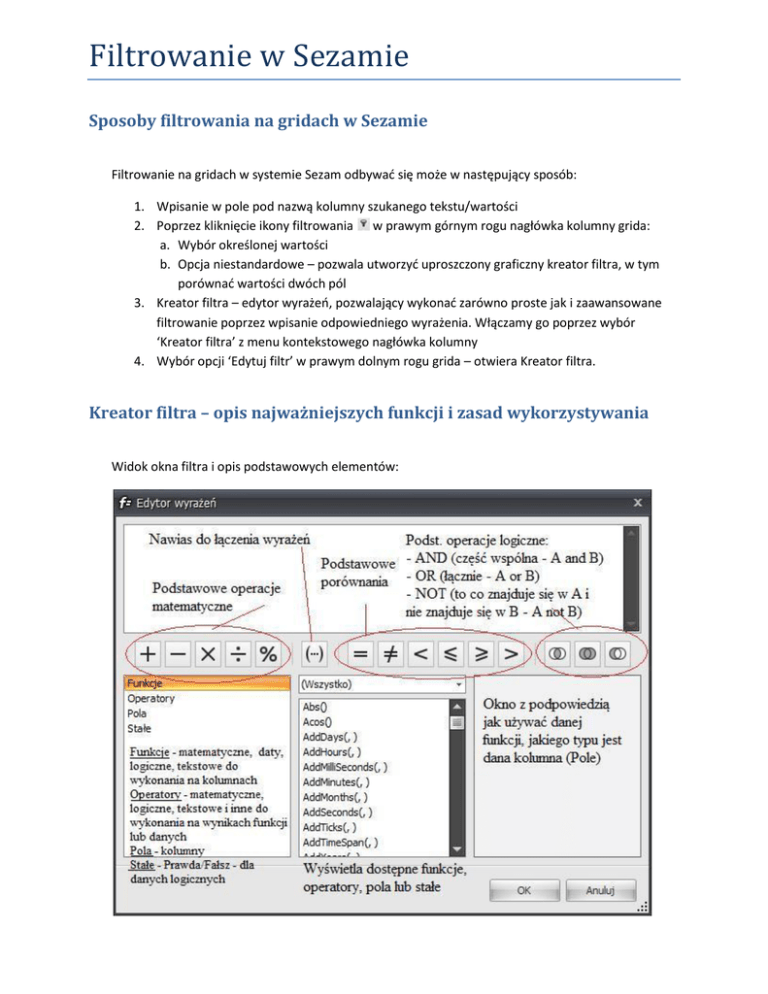 Filtrowanie w Sezamie Sposoby filtrowania na gridach w Sezamie Filtrowanie na gridach w systemie Sezam odbywad się może w następujący sposób: 1. Wpisanie w pole pod nazwą kolumny szukanego tekstu/wartości 2. Poprzez kliknięcie ikony filtrowania w prawym górnym rogu nagłówka kolumny grida: a. Wybór określonej wartości b. Opcja niestandardowe – pozwala utworzyd uproszczony graficzny kreator filtra, w tym porównad wartości dwóch pól 3. Kreator filtra – edytor wyrażeo, pozwalający wykonad zarówno proste jak i zaawansowane filtrowanie poprzez wpisanie odpowiedniego wyrażenia. Włączamy go poprzez wybór ‘Kreator filtra’ z menu kontekstowego nagłówka kolumny 4. Wybór opcji ‘Edytuj filtr’ w prawym dolnym rogu grida – otwiera Kreator filtra. Kreator filtra – opis najważniejszych funkcji i zasad wykorzystywania Widok okna filtra i opis podstawowych elementów: Edytor wyrażeo filtra pozwala na definiowanie zaawansowanych wyrażeo: 1. wyszukiwanie określonych wartości tekstowych, liczbowych, czasowych, logicznych (np. Bundle – tak/nie), 2. wykonywanie operacji tekstowych na tekście, matematycznych na liczbach, operacji na czasie i innych (np. wyszukaj wszystkie produkty, które w nazwie posiadają słowo warcraft i PC; pokaż produkty, których status zmienił się w ciągu ostatnich 30 dni) 3. porównywanie wyników operacji wykonanych na danych z jednej kolumny do wyników operacji wykonanych na innej kolumnie, bądź do stałej (np. pokaż wszystkie produkty, których cena bazowa * 1.03 > ceny internetowej) Wykorzystywanie kreatora filtra 1. Proste wyszukiwanie. Filtr można częściowo „napisad” przy pomocy myszki. Po upewnieniu się, że okno wyrażenia filtra jest puste wykonujemy: a. Wybór kolumny – z lewej listy wybieramy ‘Pola’ następnie odnajdujemy ze środkowej, uporządkowanej alfabetycznie interesującą nas kolumnę i potwierdzamy wybór dwukrotnym kliknięciem. b. Wybór wyrażenia, np. != oznacza, że będziemy poszukiwali wartości innych niż.. c. Wpisujemy wartośd, która będzie porównywana z wybraną kolumną d. Koocowy efekt może prezentowad się następująco: [Bundle] == True *Status produktu+ != 'Niedostępny (ND)' Wskazówka 1: wartości tekstowe należy traktowad w ‘specjalny’ sposób. Jak można zauważyd powyżej wpisujemy je w apostrofie. Jeżeli nie interesuje nas cała wartośd (np. nie pamiętamy jak jest wyświetlany status, ale wiemy że zawiera w sobie ND) możemy użyd zamiast symbolu == operator like, natomiast zamiast symbolu != operator not like: [Status produktu+ not like ‘%ND%’ Wyświetla wszystkie produkty nie zawierające w kolumnie Status produktu ciągu ND. Znak % oznacza ‘dowolny ciąg tekstu’. 2. Wykonywanie zaawansowanych operacji na danych: a. wyszukaj wszystkie produkty, które w nazwie posiadają słowo ‘wiedźmin’, a po nim ‘PC’ oraz ich cena detal brutto minus marża minus handling są większe od 100: *Nazwa+ like '%wiedźmin%PC%' and [Detal (brutto)] - *Marża+ - [Handling] > 100 Wskazówka 2: Niektóre nazwy pól są ciężkie do zapamiętania. Dlatego, aby nie popełnid błędu najlepiej odnaleźd ją na liście ‘Pola’. Wskazówka 3: Gdy szukamy określonego ciągu znaków możemy wykorzystad nieskooczenie wiele znaków ‘dowolny tekst’ - %, np.: wszystkie bundle 3-składnikowe: *Kod+ like ‘%:%:%’ b. Skomplikowane wyrażenia logiczne, np.: Odnajdź wszystkie dyski producentów Seagate lub WD, które są niedostępne lub posiadają status DW i ich stan na 3210 jest mniejszy od minimalnego stanu na magazynie. ([Producent] == 'WD' Or [Producent] == 'SEA') And ( [Status produktu] like '%ND%' Or ( [Status produktu] like '%DW%' And [3210] < [Min na mag.] ) ) Wskazówka 4: Warunek ten posiada wiele kryteriów połączonych słowami ‘i’ oraz ‘lub’. Aby byd pewnym poprawności napisania filtra należy stosowad nawiasy, które sprawią, że warunki będą bardziej przejrzyste. Wskazówka 5: Warunek zapisano w wielu linijkach odpowiadających ustawieniom nawiasów. Nic nie stoi jednak na przeszkodzie, aby zapisad go w jednej linijce. W przypadku braku nawiasu pojawi się komunikat, o nieprawidłowym znaku i przyniesie kursor w miejsce błędu: c. Filtrowanie dat, np.: pobierz wszystkie produkty, które w kolumnie Prawdopodobnie dostępny od posiadają podaną datę (czyli komórka nie jest pusta): Not IsNullOrEmpty(*Prawdopodobnie dostępny od+) Wskazówka 6: przy pisaniu takiego filtra należy wykorzystad operator Not oraz funkcję IsNullOrEmpty – zwraca wartośd ‘Prawda’ jeżeli dana komórka jest pusta. Wskazówka 7: W celu łatwiejszego i szybszego pisania filtrów należy zapoznad się z dostępnymi funkcjami i operatorami. 3. Porównywanie wyników różnych kolumn w połączeniu z operacjami, np. pokaż wszystkie produkty, których cena bazowa * 1.03 > ceny internetowej [Cena bazowa] * 1.03 > [Cena Internetowa (netto)]
