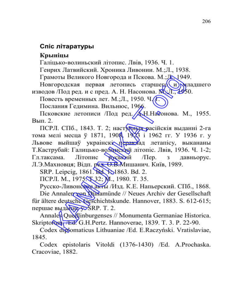 206 Спіс літаратуры Крыніцы Галіцько-волиньский літопис. Лвів, 1936. Ч. 1. Генрих Латвийский. Хроника Ливонии. М.;Л., 1938. Грамоты Великого Новгорода и Пскова. М.;Л., 1949. Новгородская первая летопись старшего и младшего изводов /Под ред. и с пред. А. Н. Насонова. М.;Л., 1950. Повесть временных лет. М.;Л., 1950. Ч. 1. Послания Гедимина. Вильнюс, 1966. Псковские летописи /Под ред. А.Н.Насонова. М., 1955. Вып. 2. ПСРЛ. СПб., 1843. Т. 2; наступныя расійскія выданні 2-га тома мелі месца ў 1871, 1908, 1923 і 1962 гг. У 1936 г. у Львове выйшаў украінскі пераклад летапісу, выкананы Т.Каструбай: Галицько-волинский літопіс. Лвів, 1936. Ч. 1-2; Гл.таксама. Літопис руський /Пер. з давньорус. Л.Э.Махновця; Відп. ред. О.В.Мишанич. Київ, 1989. SRP. Leipcig, 1861. Bd. 1; 1863. Bd. 2. ПСРЛ. М., 1975. Т.32; М., 1980. Т. 35. Русско-Ливонские акты /Изд. К.Е. Напьерский. СПб., 1868. Die Annalen von Dünamünde // Neues Archiv der Gesellschaft für ältere deutsche Geschichtskunde. Hannover, 1883. S. 612-615; першае выданне ў: SRP. T. 2. Annales Quedlinburgenses // Monumenta Germaniae Historica. Skriptorum. /Ed. G.H.Pertz. Hannoverae, 1839. T. 3. P. 22-90. Codex diplomaticus Lithuaniae /Ed. E.Raczyński. Vratislaviae, 1845. Codex epistolaris Vitoldi (1376-1430) /Ed. A.Prochaska. Cracoviae, 1882. 207 Die livländische Chronik Hermann’s von Wartberge, übersetzt von E.Strehlke. Berlin;Reval, 1864. Długosz Jan. Roczniki czyli kroniki sławnego Królestwa Polskiego. Warszawa, 1961. Ks. 1-2; Warszawa, 1974. Ks. 7-8. Dusburg: Petri de Dusburg. Chronicon terrae Prussiae // SRP. Leipcig, 1861. Bd. 1. S. 3-219. Herman de Wartberge // SRP. Bd. 2. Kronika wielkopolska // MPH /Wyd. B. Kürbis. Warszawa, 1970. Seria 2. T. 8; расійскае выданне: “Великая хроника” о Польше, Руси и их соседях 11-13 вв. М., 1987. Kronika Wiganda z Marburga. Poznań, 1842. Liv-, Est- und Curländisches Urkundenbuch, nebst Regesten /Ed. F.G.Bunge. Reval, 1853. Bd. 1 (1093-1300). Livländische Reimchronik /Her. von Leo Meyer. Padeborn, 1876. Paszkiewicz H. Regestra Lithuaniae. Varsoviae, 1930. T. 1. Preußisches Urkundenbuch /Ed. A. Seraphim. Königsberg, 1909. B. 1. Hälfte 2. Rocznik kapitulny krakowski // MPH. Warszawa, 1961. T. 2. S. 779-816. Rocznik kapituły poznańskiej. 965-1309 // MPH /Wyd. B.Kürbis. Warszawa, 1962. Seria 2. T. 6. S. 21-78. Rocznik Krasińskich // MPH. Lwów, 1873. T. 3. S. 127-133. Stryjkowski Macej. Kronika Polska, Litewska, Zmódzka i wszystkiej Rusi. Wyd. 3. Warszawa, 1846. T. 1. Stryjkowski Macej. O początkach, wywodach, dzielnościach, sprawach rycerskich i domowych sławnego narodu litewskiego, Ŝemojdzkiego i ruskiego. Warszawa, 1978. SRP. Leipcig, 1863. Bd. 2. Vetera monumenta Poloniae et Lithuaniae ex tabulis Vaticanis deprompta /Ed. A.Theiner. Romae, 1860. Т. I (1217-1409). 208 Vetera Monumenta Poloniae et Lithuaniae Gentiumque finitimarum Historiam illustrantia /Ed.A.Theiner. Romae, 1861. T. 2. Працы Алексеев Л.В. Полоцкая земля. М., 1966. Антонович В. Очерк истории Великого Княжества Литовского до половины 15 столетия. Киев, 1878. Антонович В. Монографии по истории Западной и ЮгоЗападной России. Киев, 1885. Археалогія і нумізматыка Беларусі: Энцыклапедыя. Мн., 1993. Батура Р.К., Пашуто В.Т. Культура Великого княжества Литовского // Вопросы истории. 1977. № 4. С. 94-117. Беларусь у Вялікім Княстве Літоўскім: Стэнаграма пасяджэнняў Міжнароднага круглага стала, якія адбыліся ў Мінску 6-7 красавіка 1992 г. Мн., 1992. С. 121-124. Белорусская археология: Достижения археологов за годы Советской власти. Мн., 1987. Беляев И. История Полоцка или Северо-Западной Руси от древнейших времен до Люблинской унии. М., 1872. С. 77-80. Бережков Н.Г. Хронология русского летописания. М., 1963. Бірыла М.В., Ванагас А.П. Літоўскія элементы ў беларускай анамастыцы. Мн., 1968. Боричевский И. О происхождении названия Литва и языке литовского народа // Журнал министерства народного просвещения. 1847. Декабрь. С. 272-314. Видугирис А.Ю., Климчук Ф.Д. Некоторые вопросы этноязыковых процессов на балто-восточнославянском пограничье // Этнолингвистические балто-славянские контакты в настоящем и прошлом: (Предварит. материалы конф. 11-15 декабря 1978 г.) М., 1978. 209 Волкайте-Куликаускиене Р.К. Образование литовской народности (по данным археологии) // Советская этнография. 1979. № 3. С. 31-46. Вольтер Э. Где искать землю Нальщанскую