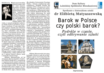 E l ż b i e t a M a t y a s z e w s k a, historyk sztuki, dok tor nauk humani stycznych. W latach 19851990 członkini ogólnopolskiego ze społu badawczego przy Instytucie Sztu ki PAN w Warszawie, prowadzącego bada nia nad polskim ży ciem artystycznym drugiej połowy XIX wieku, w ramach programu węzłowe go Polska kultura narodowa, jej per cepcje i tendencje. W 19911993 sekre tarz naukowy zespołu przy Instytucie Sztuki PAN, przygotowującego kata log dzieł malarskich Jana Matejki w związku z rocznicami 150lecia uro dzin i 100lecia śmierci artysty dwu tomowa publikacja, do której napisa ła też kilkadziesiąt haseł katalogowych, została wydana w 1993 roku pod tytu łem Matejko. Obrazy olejne. Katalog. W latach 19922001 współpracowała z redakcjami lubelskich i warszawskich periodyków (m.in. „Przegląd Akade micki”, „Dziennik Wschodni”, „Ak cent”, „Wnętrze Twojego Domu”, „Do bre Wnętrze”, „ZabytkiHeritage”), pu blikując relacje z wystaw sztuki dawnej i współczesnej, a także cykliczne tek sty z zakresu historii ubioru, mody i rzemiosła artystycznego. Elżbieta Matyaszewska od lat utrzymuje aktywny kontakt z Instytu tem Historii Sztuki KUL, uczestnicząc w organizowanych sesjach naukowych oraz działalności kulturalnonaukowej na rzecz miasta Lublin. W roku 2008 koordynowała prace mające na celu zorganizowanie przy Instytucie Histo rii Sztuki KUL zajęć z historii sztuki dla członków Uniwersytetu Trzeciego Wieku, z którym współpracuje jako wykładowca. Wykłada również dla członków UTW w Tomaszowie Lubel skim i Świdniku. Od roku 2011 prowa dzi współpracę z Filharmonią Lubel ską w ramach Akademii Muzyki i Pla styki (oferta skierowana do szkół ponadpodstawowych Lublina i regio nu), przygotowując prezentacje z za kresu sztuk plastycznych, wpisujące się w określone tematy muzyczne. Po nadto, w ramach działalności dydak tycznej, prowadziła zajęcia obejmują ce najważniejsze zjawiska z dziejów sztuki nowoczesnej i najnowszej, za równo polskiej, jak i powszechnej w Wyższej Szkole HumanistycznoPrzy rodniczej w Sandomierzu, wykłady o sztukach pięknych dla członków Uni wersytetu Otwartego KUL, a także za jęcia specjalizacyjne na Studiach Po dyplomowych przy Instytucie Historii Sztuki KUL. W ostatnich latach pra cowała w Instytucie Leksykografii KUL na stanowisku adiunkta, prowadząc dział sztuki religijnej i redagując hasła z tego zakresu tematycznego do Ency klopedii Katolickiej. Od stycznia 2014 roku jest wiceprezesem lubelskiego Oddziału Stowarzyszenia Historyków Sztuki. Dom Kultury Lubelskiej Spółdzielni Mieszkaniowej 40 lat Spotkanie z historykiem sztuki dr Elżbietą Matyaszewską Barok w Polsce czy polski barok? Podróże w czasie, czyli odkrywanie sztuki Elżbieta Matyaszewska jest autor ką książki „Wierzę w cuda nie od dziś”. Religia w życiu i twórczości Jana Ma tejki (Lublin 2007) oraz kilkudziesię ciu publikacji naukowych i popularno naukowych w zakresie ikonografii chrześcijańskiej i malarstwa polskie go, a także wielu haseł z dziedziny hi storii sztuki zamieszczonych w Ency klopedii Katolickiej. Zapraszamy BAROK W POLSCE CZY POLSKI BAROK? Podobnie jak w całej Europie, tak i w sztuce polskiej kolejnym, po renesan sie i manieryzmie, stylem był barok. U pro gu XVII wieku na ziemiach Rzeczypospo litej Obojga Narodów, w okresie panowa nia dynastii Wazów, ścierały się ze sobą dwa mocne prądy coraz bardziej upozo wany manieryzm i ugruntowujący się po woli nurt sztuki barokowej, która jednak na swoje pełne zwycięstwo musiała pocze kać jeszcze kilkadziesiąt lat. Przyjmuje się, że barok w Polsce w pełni zaczął panować tuż po połowie wieku XVII, a jego obecność objęła historię Rzeczypospolitej od okresu jej świetności aż po czasy przedrozbioro we. Ten złożony nurt dzielił się na trzy fa zy, pokrywające się z czasem panowania poszczególnych władców – wczesny, tzw. barok Wazów, dojrzały, czyli okres pano wania Jana III Sobieskiego oraz barok póź ny lub schyłkowy, inaczej zwany saskim, przechodzący w drugiej połowie wieku XVIII w rokoko. Zasadniczo polska sztuka barokowa wiąże się z okresem kontrreformacji i to właśnie jej założenia były najbardziej ją de terminujące. Podobnie jak w innych czę ściach Europy, prekursorami nowego sty lu byli artyści włoscy, zasadniczo wypełnia jący założenia Soboru Trydenckiego i wprowadzający je w swoich dziełach, za równo architektonicznych, jak i malarskich. Pracowali głównie na zlecenie dworu kró lewskiego, a także możnych przedstawicie li rodzin magnackich. Początkowo główny mi beneficjentami owych fundacji byli je zuici – to właśnie dla tego zakonu wzniesiono jedną z pierwszych świątyń barokowych w Polsce, czyli kościół Świętych Apostołów Piotra i Pawła w Krakowie (15971619), z fa sadą powielającą rzymski pierwowzór je zuickiego Il Gesu. Przy budowie krakow skiej świątyni zatrudnieni byli dwaj włoscy architekci – Giovanni Maria Bernardoni oraz Giovanni Trevano, autorzy wielu in nych wczesnobarokowych budowli, np. w Nieświeżu, Lublinie, Kaliszu czy Krako wie. Na uwagę zasługuje też ówczesna dzia łalność Macieja Trapoli, autora m.in. ko ścioła i klasztoru karmelitów w Nowym Wi śniczu (16181621). Najwybitniejszym architektem tzw. dojrzałego baroku był Tylman z Gameren, preferujący w swych projektach plan cen tralny, widoczny np. w kościele Sakramen tek w Warszawie (16881692). W począt kach XVIII wieku barokowe wnętrza po woli zaczynają ulegać większej teatralizacji, a elementy dekoracyjne są coraz bardziej dynamiczne, po połowie wieku przecho dząc w formy rokokowe. Takie efekty szcze gólnie widoczne są w architekturze Kresów PółnocnoWschodnich, z kościołami Wil na na czele. Wznoszono tam budowle o smu kłych proporcjach, z wysokimi wieżami i po strzępionymi fasadami. Wśród pracują cych wówczas architektów warto wymieni