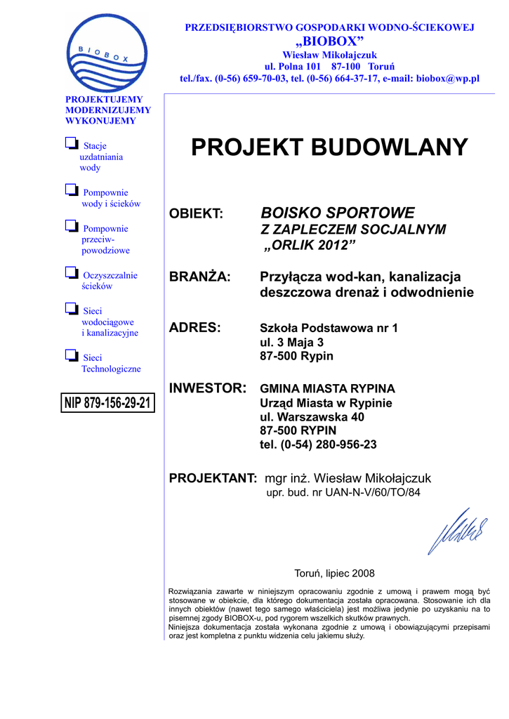 PRZEDSIĘBIORSTWO GOSPODARKI WODNO-ŚCIEKOWEJ „BIOBOX” Wiesław Mikołajczuk ul. Polna 101 87-100 Toruń tel./fax. (0-56) 659-70-03, tel. (0-56) 664-37-17, e-mail: [email protected] PROJEKTUJEMY MODERNIZUJEMY WYKONUJEMY Stacje uzdatniania wody Pompownie wody i ścieków PROJEKT BUDOWLANY OBIEKT: Z ZAPLECZEM SOCJALNYM „ORLIK 2012” Pompownie przeciwpowodziowe Oczyszczalnie ścieków Sieci wodociągowe i kanalizacyjne Sieci Technologiczne BOISKO SPORTOWE BRANŻA: Przyłącza wod-kan, kanalizacja deszczowa drenaż i odwodnienie ADRES: Szkoła Podstawowa nr 1 ul. 3 Maja 3 87-500 Rypin INWESTOR: GMINA MIASTA RYPINA NIP 879-156-29-21 Urząd Miasta w Rypinie ul. Warszawska 40 87-500 RYPIN tel. (0-54) 280-956-23 PROJEKTANT: mgr inż. Wiesław Mikołajczuk upr. bud. nr UAN-N-V/60/TO/84 Toruń, lipiec 2008 Rozwiązania zawarte w niniejszym opracowaniu zgodnie z umową i prawem mogą być stosowane w obiekcie, dla którego dokumentacja została opracowana. Stosowanie ich dla innych obiektów (nawet tego samego właściciela) jest możliwa jedynie po uzyskaniu na to pisemnej zgody BIOBOX-u, pod rygorem wszelkich skutków prawnych. Niniejsza dokumentacja została wykonana zgodnie z umową i obowiązującymi przepisami oraz jest kompletna z punktu widzenia celu jakiemu służy. 2 SPIS TREŚCI CZĘŚĆ OPISOWA 1. PODSTAWA I ZAKRES OPRACOWANIA.................................................................................. 4 2. WYKORZYSTANE MATERIAŁY ................................................................................................. 4 3. OPIS STANU ISTNIEJĄCEGO ................................................................................................... 4 4. OGÓLNY OPIS PRZYJETYCH ROZWIĄZAŃ ............................................................................. 5 5. PRZYŁĄCZE WODOCIĄGOWE ................................................................................................. 5 6. PRZYŁĄCZE KANALIZACJI SANITARNEJ ................................................................................. 6 7. PRZYŁĄCZE KANALIZACJI DESZCZOWEJ .............................................................................. 6 8. KANALIZACJA DESZCZOWA NA TERENIE BOISKA ................................................................. 6 9. ODPROWADZENIE WÓD POWIERZCHNIOWYCH Z BOISKA.................................................. 7 10. DRENAŻ BOISKA ..................................................................................................................... 7 11. WARUNKI GRUNTOWE, ROBOTY ZIEMNE ORAZ ROSADOWIENIE PROJEKTOWANYCH PRZYŁĄCZY I SIECI .................................................................................................................. 8 12. ZESTAWIENIE PROJEKTOWANYCH OBIEKTÓW .................................................................. 8 CZĘŚĆ FORMALNA Oświadczenie projektanta Uprawnienie projektanta Zaświadczenie o przynależności do Izby Inżynierów Warunki techniczne podłączenia do miejskiej sieci wodno – kanalizacyjnej Uzgodnienie ZUD Rypin Uzgodnienie przedsiębiorstwa komunalnego „KOMES” Rypin 3 SPIS RYSUNKÓW 1. Rys. nr 1. Plan sytuacyjno – wysokościowy projektowanych obiektów 1: 500 2. Rys. nr 2. Plan sytuacyjno – wysokościowy projektowanych obiektów 1: 250 3. Rys. nr3. Przekrój poprzeczny drenażu – odwodnienie liniowe 1: 10 4. Rys. nr 4. Profile podłużne Przyłącze i wewnętrzna sieć kanalizacji deszczowej Ø0,20m i Ø0,30mm Przyłącze kanalizacji sanitarnej Ø0,20mm Przyłącze wodociągowe PE Ø50MM 5. Rys. nr 5. Profil podłużny drenażu płytkiego 1Pł ÷D5; 2Pł ÷D5 1:100/250 6. Rys. nr 6. Profil podłużny drenażu głębokiego 1Gł÷D5; 2Gł÷D5 1:100/250 7. Rys. nr 7. Profil podłużny drenażu głębokiego 3Gł ÷ W3; 4Gł ÷ W3 1:100/250 8. Rys. nr 8. Profil podłużny drenażu głębokiego 5Gł ÷ W2; 6Gł ÷ W2 1:100/250 9. Rys. nr 9. Profil podłużny drenażu głębokiego 7Gł ÷ W1; 8Gł ÷ W1 1:100/250 10. Rys. nr10. Profil podłużny drenażu płytkiego 3Pł ÷D2; 4Pł ÷D2 1:100/250 11. Rys. nr 11. Profil podłużny drenażu głębokiego 9Gł ÷ D2; 10Gł ÷ W2 1:100/250 4 CZĘŚĆ OPISOWA 1. PODSTAWA I ZAKRES OPRACOWANIA Podstawą opracowania była umowa ZP 15/08 z dnia 9.06.2008 zawarta z Burmistrzem Miasta Rypina. Opracowanie zawiera projekty budowlane następujących obiektów liniowych: Przyłącza wodociągowego z sieci miejskiej do projektowanego budynku zaplecza Przyłącza kanalizacji sanitarnej z budynku j. w do miejskiej sieci kanalizacyjnej Przyłącza kanalizacji deszczowej z terenu boiska do miejskiej sieci kanalizacyjnej Sieci kanalizacji deszczowej na terenie boiska Odwodnienia liniowego i drenażu płytkiego mającego odprowadzić wody powierzchniowe Drenażu tzw. głębokiego boiska czyli drenażu zapewniającego obniżenie poziomu wody gruntowej 2. WYKORZYSTANE MATERIAŁY Projekt budowlany boisk sportowych ORLIK 2012, który miał być projektem typowym do adaptacji udostępniony dla inwestora przez Ministerstwo Sportu i Turystyki opracowany przez firmę Kulczyński Architekt Sp. z. o. o z Warszawy Projekty budowlane w pozostałych branżach Mapy syt-wys.– 1: 500 Informacje uzyskane w terenie i w trakcie uzgodnień Przepisy, normy, wytyczne i własne doświadczenia 3. OPIS STANU ISTNIEJĄCEGO Boisko będzie budowane na terenie, gdzie obecnie znajduje się również boisko sportowe z trawą naturalną i bieżnią żwirową. Istniejące boisko jest złej jakości i żaden z jego elementów nie będzie docelowo wykorzystywany. Do istniejącego boiska doprowadzona jest woda z sieci miejskiej z instalacji w sąsiednim budynku będącym kiedyś domem nauczyciela. Powyższe przewody wodociągowe są w złym stanie technicznym i od dłuższego czasu nieczynne. Przewiduje się trwale wyłączyć je z eksploatacji - istniejące studnie zdemontować, a przewody zaślepić na końcach i na granicy boiska. Innego uzbrojenia w branży wodno – kanalizacyjne