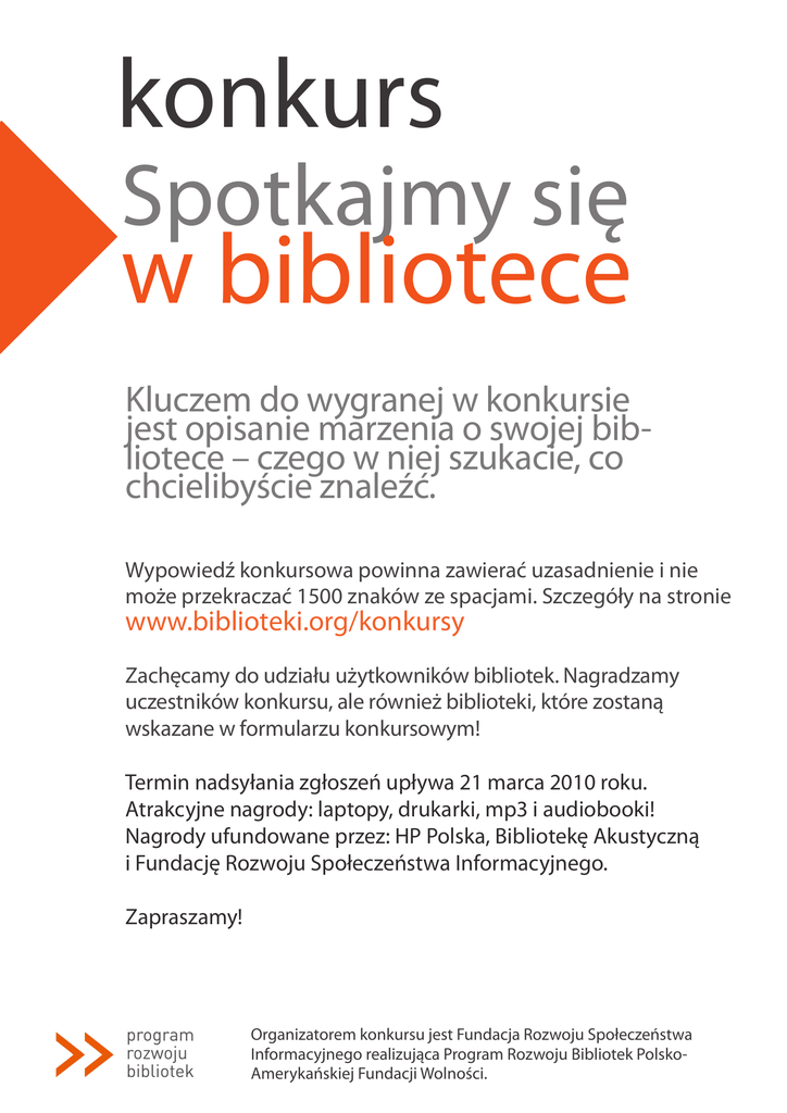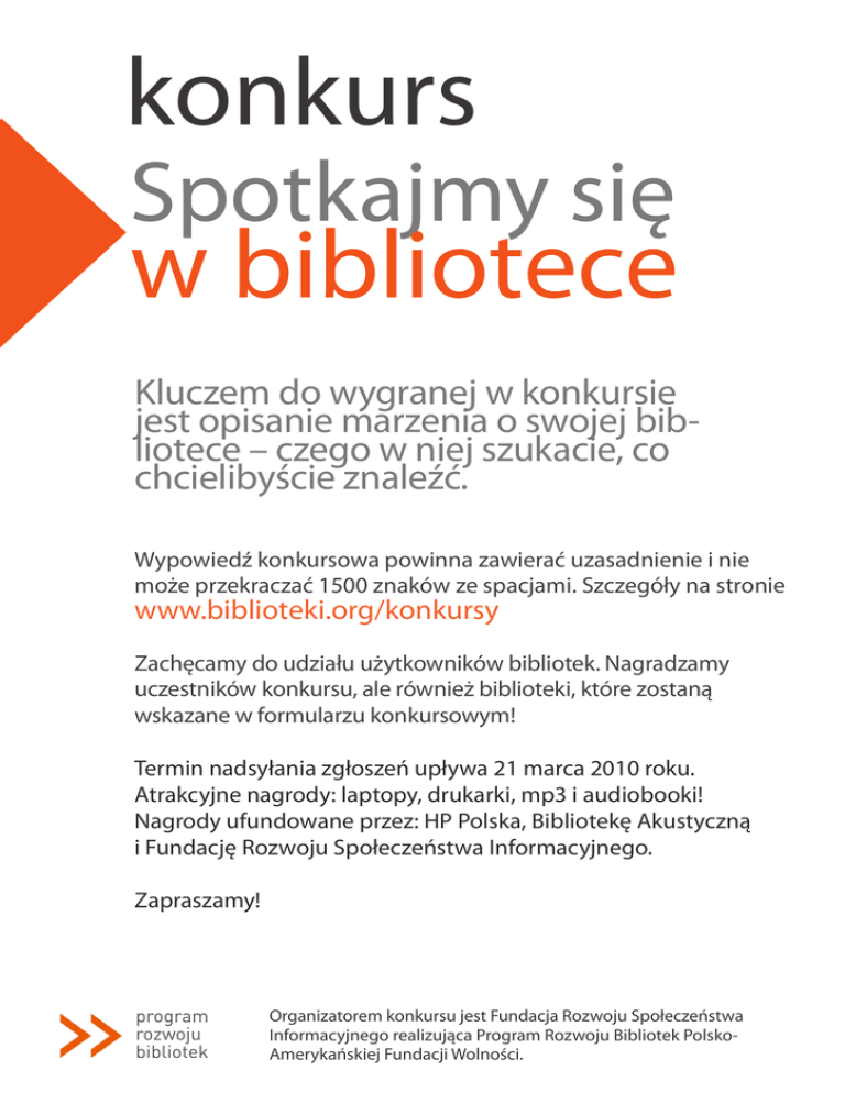 konkurs Spotkajmy się w bibliotece Kluczem do wygranej w konkursie jest opisanie marzenia o swojej bibliotece – czego w niej szukacie, co chcielibyście znaleźć. Wypowiedź konkursowa powinna zawierać uzasadnienie i nie może przekraczać 1500 znaków ze spacjami. Szczegóły na stronie www.biblioteki.org/konkursy Zachęcamy do udziału użytkowników bibliotek. Nagradzamy uczestników konkursu, ale również biblioteki, które zostaną wskazane w formularzu konkursowym! Termin nadsyłania zgłoszeń upływa 21 marca 2010 roku. Atrakcyjne nagrody: laptopy, drukarki, mp3 i audiobooki! Nagrody ufundowane przez: HP Polska, Bibliotekę Akustyczną i Fundację Rozwoju Społeczeństwa Informacyjnego. Zapraszamy! Organizatorem konkursu jest Fundacja Rozwoju Społeczeństwa Informacyjnego realizująca Program Rozwoju Bibliotek PolskoAmerykańskiej Fundacji Wolności.
