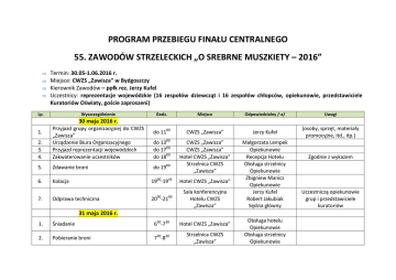 PROGRAM PRZEBIEGU FINAŁU CENTRALNEGO 55. ZAWODÓW STRZELECKICH „O SREBRNE MUSZKIETY – 2016” Termin: 30.05-1.06.2016 r. Miejsce: CWZS „Zawisza” w Bydgoszczy Kierownik Zawodów – ppłk rez. Jerzy Kufel Uczestnicy: reprezentacje wojewódzkie (16 zespołów dziewcząt i 16 zespołów chłopców, opiekunowie, przedstawiciele Kuratoriów Oświaty, goście zaproszeni) Lp. Wyszczególnienie Godz. Miejsce Odpowiedzialny /-a/ Uwagi do 1100 CWZS „Zawisza” Jerzy Kufel (osoby, sprzęt, materiały promocyjne, itd., itp.) 2. 3. 4. Przyjazd grupy organizacyjnej do CWZS „Zawisza” Urządzenie Biura Organizacyjnego Przyjazd reprezentacji wojewódzkich Zakwaterowanie uczestników do 1300 do 1700 do 1800 5. Zdawanie broni do 1900 CWZS „Zawisza” CWZS „Zawisza” Hotel CWZS „Zawisza” Strzelnica CWZS „Zawisza” 6. Kolacja 1900-1945 Hotel CWZS „Zawisza” 7. Odprawa techniczna 2000-2100 Sala konferencyjna Hotelu CWZS „Zawisza” Małgorzata Lempek Opiekunowie Recepcja Hotelu Obsługa strzelnicy Opiekunowie Zbigniew Manicz Opiekunowie Jerzy Kufel Robert Jakubiak Sędzia główny 30 maja 2016 r. 1. 31 maja 2016 r. 1. Śniadanie 630-730 Hotel CWZS „Zawisza” 2. Pobieranie broni 730-830 Strzelnica CWZS „Zawisza” Obsługa hotelu Opiekunowie Obsługa strzelnicy Opiekunowie Zgodnie z wykazem Uczestniczą opiekunowie grup i przedstawiciele kuratoriów Lp. Wyszczególnienie Godz. Miejsce Odpowiedzialny /-a/ Uwagi 900-915 Plac przed strzelnicą CWZS „Zawisza” Jerzy Kufel Opiekunowie Sędzia główny Obsługa strzelnicy Opiekunowie Opiekunowie Obsługa strzelnicy Opiekunowie Pracownicy Muzeum Robert Jakubiak Opiekunowie Opiekunowie Zbiórka zespołów (ustawienie) – 845 Wg kolejności przedstawionej podczas odprawy technicznej 3. Uroczyste otwarcie zawodów 4. Zawody strzeleckie 1000-1530 Strzelnica CWZS „Zawisza” 5. Obiad 1400-1530 6. Zdawanie broni Hotel CWZS „Zawisza” Strzelnica CWZS „Zawisza” 7. Zwiedzanie Muzeum Wojsk Lądowych 1600-1945 Muzeum Wojsk Lądowych 8. Kolacja 1945-2030 Hotel CWZS „Zawisza” 9. do 1600 Praca Biura Organizacyjnego 1600-2130 Sala konferencyjna Hotelu CWZS „Zawisza” Jerzy Kufel Sukcesywnie po zakończonym strzelaniu Opracowanie komunikatów, wypisanie dyplomów, rozdział nagród i upominków oraz scenariusza zakończenia zawodów 1 czerwca 2016 r. 1. Śniadanie 630-730 Hotel CWZS „Zawisza” 2. Pobieranie broni 730-830 3. Uroczyste zakończenie zawodów 900-945 Strzelnica CWZS „Zawisza” Plac przed strzelnicą CWZS „Zawisza” 4. Rozliczenie się z hotelem 5. Wyjazd uczestników zamieszkania do miejsc 1000-1045 Hotel CWZS „Zawisza” 1100 Bydgoszcz – Miejsca zamieszkania 2 Obsługa hotelu Opiekunowie Obsługa strzelnicy Opiekunowie Jerzy Kufel Opiekunowie Obsługa hotelu Opiekunowie Opiekunowie Zbiórka zespołów (ustawienie) – 845 Pobranie suchego prowiantu Reprezentacje wojewódzkie Lp. Wyszczególnienie 6. Rozliczenie się organizacyjnej z hotelem 7. Wyjazd grupy organizacyjnej Warszawy i Wałcza Godz. grupy do do 1200 12 15 Miejsce Odpowiedzialny /-a/ Uwagi CWZS „Zawisza” Jerzy Kufel Zbigniew Manicz Rozliczenie miejsca zakwaterowania. Złożenie sprzętu. Rozliczenie finansowe, itd., itp. Bydgoszcz – Warszawa Bydgoszcz - Wałcz Jerzy Kufel Robert Jakubiak WICEPREZES Wojskowego Stowarzyszenia „Sport-Turystyka-Obronność ppłk rez. Jerzy Kufel Wyk. Jerzy Kufel tel.: +48 604601379 Dnia 22 lutego 2016 r. D:\ZADANIA_PUBLICZNE_2016\MON\02_SM_2016\PROGRAM_ZAWODÓW_SM_2016.rtf 3