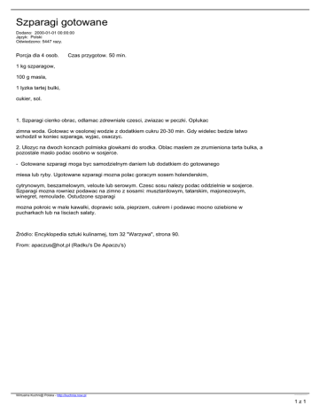 Szparagi gotowane Dodano: 2000-01-01 00:00:00 Język: Polski Odwiedzono: 5447 razy. Porcja dla 4 osob. Czas przygotow. 50 min. 1 kg szparagow, 100 g masla, 1 lyzka tartej bulki, cukier, sol. 1. Szparagi cienko obrac, odlamac zdrewniale czesci, zwiazac w peczki. Oplukac zimna woda. Gotowac w osolonej wodzie z dodatkiem cukru 20-30 min. Gdy widelec bedzie latwo wchodzil w koniec szparaga, wyjac, osaczyc. 2. Ulozyc na dwoch koncach polmiska glowkami do srodka. Oblac maslem ze zrumieniona tarta bulka, a pozostale maslo podac osobno w sosjerce. - Gotowane szparagi moga byc samodzielnym daniem lub dodatkiem do gotowanego miesa lub ryby. Ugotowane szparagi mozna polac goracym sosem holenderskim, cytrynowym, beszamelowym, veloute lub serowym. Czesc sosu nalezy podac oddzielnie w sosjerce. Szparagi mozna rowniez podawac na zimno z sosami: musztardowym, tatarskim, majonezowym, winegret, remoulade. Ostudzone szparagi mozna pokroic w male kawalki, doprawic sola, pieprzem, cukrem i podawac mocno oziebione w pucharkach lub na lisciach salaty. Źródło: Encyklopedia sztuki kulinarnej, tom 32 "Warzywa", strona 90. From: [email protected] (Radku's De Apaczu's) Wirtualna Kuchni@ Polska - http://kuchnia.now.pl przepis nr 5424, plik wygenerowano 2017.03.04 14:49 1z1