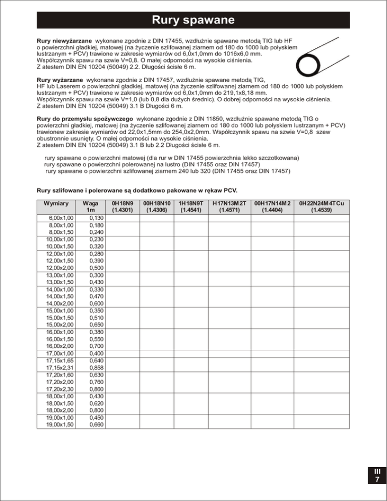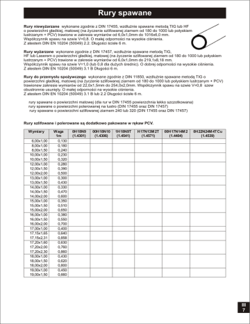 Rury spawane Rury niewy¿arzane wykonane zgodnie z DIN 17455, wzd³u¿nie spawane metod¹ TIG lub HF o powierzchni g³adkiej, matowej (na ¿yczenie szlifowanej ziarnem od 180 do 1000 lub po³yskiem lustrzanym + PCV) trawione w zakresie wymiarów od 6,0x1,0mm do 1016x6,0 mm. Wspó³czynnik spawu na szwie V=0,8. O ma³ej odpornoœci na wysokie ciœnienia. Z atestem DIN EN 10204 (50049) 2.2. D³ugoœci œcis³e 6 m. Rury wy¿arzane wykonane zgodnie z DIN 17457, wzd³u¿nie spawane metod¹ TIG, HF lub Laserem o powierzchni g³adkiej, matowej (na ¿yczenie szlifowanej ziarnem od 180 do 1000 lub po³yskiem lustrzanym + PCV) trawione w zakresie wymiarów od 6,0x1,0mm do 219,1x8,18 mm. Wspó³czynnik spawu na szwie V=1,0 (lub 0,8 dla du¿ych œrednic). O dobrej odpornoœci na wysokie ciœnienia. Z atestem DIN EN 10204 (50049) 3.1 B D³ugoœci 6 m. Rury do przemys³u spo¿ywczego wykonane zgodnie z DIN 11850, wzd³u¿nie spawane metod¹ TIG o powierzchni g³adkiej, matowej (na ¿yczenie szlifowanej ziarnem od 180 do 1000 lub po³yskiem lustrzanym + PCV) trawionew zakresie wymiarów od 22,0x1,5mm do 254,0x2,0mm. Wspó³czynnik spawu na szwie V=0,8 szew obustronnie usuniêty. O ma³ej odpornoœci na wysokie ciœnienia. Z atestem DIN EN 10204 (50049) 3.1 B lub 2.2 D³ugoœci œcis³e 6 m. a rury spawane o powierzchni matowej (dla rur w DIN 17455 powierzchnia lekko szczotkowana) m rury spawane o powierzchni polerowanej na lustro (DIN 17455 oraz DIN 17457) q rury spawane o powierzchni szlifowanej ziarnem 240 lub 320 (DIN 17455 oraz DIN 17457) Rury szlifowane i polerowane s¹ dodatkowo pakowane w rêkaw PCV. Wymiary 6,00x1,00 8,00x1,00 8,00x1,50 10,00x1,00 10,00x1,50 12,00x1,00 12,00x1,50 12,00x2,00 13,00x1,00 13,00x1,50 14,00x1,00 14,00x1,50 14,00x2,00 15,00x1,00 15,00x1,50 15,00x2,00 16,00x1,00 16,00x1,50 16,00x2,00 17,00x1,00 17,15x1,65 17,15x2,31 17,20x1,60 17,20x2,00 17,20x2,30 18,00x1,00 18,00x1,50 18,00x2,00 19,00x1,00 19,00x1,50 Waga 1m 0,130 0,180 0,240 0,230 0,320 0,280 0,390 0,500 0,300 0,430 0,330 0,470 0,600 0,350 0,510 0,650 0,380 0,550 0,700 0,400 0,640 0,858 0,630 0,760 0,860 0,430 0,620 0,800 0,450 0,660 0H18N9 (1.4301) a a a aq aq aq aq aq a a a aq aq aq m aq aq aq m aq m aq a 00H18N10 (1.4306) 1H18N9T (1.4541) a a H17N13M 2T (1.4571) a a a a a a a a a a a a a a a a a a a a a a a a a a a a a a a a a a aq a a m aq aq a a 00H17N14M 2 (1.4404) m a 0H22N24M 4TCu (1.4539) a a m a a a a a a a a a a a a a a a a a a a a a a III 7 Rury spawane Ci¹g dalszy z poprzedniej strony a rury spawane o powierzchni matowej (dla rur w DIN 17455 powierzchnia lekko szczotkowana) m rury spawane o powierzchni polerowanej na lustro (DIN 17455 oraz DIN 17457) q rury spawane o powierzchni szlifowanej ziarnem 240 lub 320 (DIN 17455 oraz DIN 17457) Wymiary 20,00x1,00 20,00x1,20 20,00x1,50 20,00x2,00 21,30x1,60 21,30x2,00 21,30x2,60 21,34x1,65 21,34x2,11 21,34x2,77 22,00x1,00 22,00x1,50 22,00x2,00 23,00x1,50 25,00x1,00 25,00x1,20 25,00x1,50 25,00x2,00 25,00x2,50 25,00x3,00 25,40x1,20 25,40x1,50 26,67x1,65 26,67x2,11 26,67x2,87 26,90x1,60 26,90x2,00 26,90x2,60 28,00x1,00 28,00x1,50 28,00x2,00 29,00x1,50 30,00x1,00 30,00x1,50 30,00x2,00 30,00x2,50 30,00x3,00 31,80x1,20 31,80x1,50 32,00x1,00 32,00x1,50 32,00x2,00 33,00x1,50 33,40x1,65 33,40x2,77 33,40x3,38 33,70x1,60 33,70x2,00 33,70x2,60 33,70x3,00 33,70x3,20 III 8 Waga 1m 0,480 0,570 0,700 0,900 0,790 0,970 1,220 0,820 1,014 1,285 0,530 0,770 1,000 0,810 0,600 0,715 0,890 1,160 1,410 1,650 0,730 0,900 1,035 1,299 1,713 1,020 1,250 1,590 0,670 0,990 1,310 1,030 0,730 1,070 1,400 1,720 2,210 0,920 1,140 0,780 1,150 1,500 1,180 1,330 2,125 2,541 1,290 1,590 2,030 2,250 2,450 0H18N9 (1.4301) a q a a q ma q a q a q a q 00H18N10 (1.4306) 1H18N9T (1.4541) a a a a a a H17N13M 2T (1.4571) a a a a a a 00H17N14M 2 (1.4404) m a a a a a ma q ma q a a q a q ma q ma q a a a ma m m m m m q q q q q q a a a a a a a a a a a a a a a a m m a a a a a a a a a a a a a a a a a a a q a a a a a a a q a a m q q q q a a a a a a a q m a q a m a a a a a ma a a a a a a a a q q q a a a a a a a a a a a a a a a a a a a a a a a a a a a a a q 0H22N24M 4TCu (1.4539) q a a a a a a a a a a a a a a a a a Ci¹g dalszy z poprzedniej strony Rury spawane a rury spawane o powierzchni matowej (dla rur w DIN 17455 powierzchnia lekko szczotkowana) m rury spawane o powierzchni polerowanej na lustro (DIN 17455 oraz DIN 17457) q rury spawane o powierzchni szlifowanej ziarnem 240 lub 320 (DIN 17455 oraz DIN 17457) Wymiary 34,00x1,00 34,00x1,50 34,00x2,00 35,00x1,50 35,00x2,00 35,00x2,50 36,00x2,00 38,00x1,50 38,00x2,00 38,00x2,50 38,00x3,00 38,10x1,20 38,10x1,50 40,00x1,00 40,00x1,50 40,00x2,00 40,00x3,00 40,00x4,00 41,00x1,50 42,16x1,65 42,16x2,77 42,16x3,56 42,40x1,60 42,40x2,00 42,40x2,60 42,40x3,00 42,40x3,20 42,40x3,60 42,40x4,00 43,00x1,50 44,50x1,50 44,50x2,00 44,50x2,60 44,50x2,90 45,00x2,00 48,26x1,65 48,26x2,77 48,26x3,68 48,30x1,60 48,30x2,00 48,30x2,60 48,30x3,00 48,30x3,20 48,30x3,60 48,30x4,00 50,00x1,00 50,00x1,50 50,00x2,00 50,00x3,00 50,00x4,00 50,80x1,25 50,80x1,50 50,80x2,00 Waga 1m 0,830 1,220 1,600 1,260 1,650 2,040 1,700 1,370 1,800 2,220 2,630 1,110 1,380 0,980 1,450 1,910 2,780 3,605 1,480 1,690 2,735 3,444 1,640 2,030 2,600 2,930 3,150 3,490 3,850 1,560 1,620 2,130 2,730 3,020 2,150 1,950 3,158 4,112 1,880 2,330 2,990 3,400 3,630 4,030 4,440 1,230 1,820 2,400 3,530 4,610 1,550 1,850 2,440 0H18N9 (1.4301) a a a aq aq a a m aq m aq a a a a a m aq m aq aq a a 00H18N10 (1.4306) 1H18N9T (1.4541) a a a a a a a a a a H17N13M 2T (1.4571) a a a a a a a a a a a a a q a a a a a m aq m aq aq aq a a a a aq a a a aq m aq m aq 0H22N24M 4TCu (1.4539) a q m a q m a a a a a a a a a a aq a a a a a a a a a a a a a a a a a a m aq m aq a aq a a a aq m aq a a 00H17N14M 2 (1.4404) m a a a a a a a a a a a a a a a q a a a a a a a a a a a m a a a a m a m a m a III 9 Rury spawane Ci¹g dalszy z poprzedniej strony a rury spawane o powierzchni matowej (dla rur w DIN 17455 powierzchnia lekko szczotkowana) m rury spawane o 