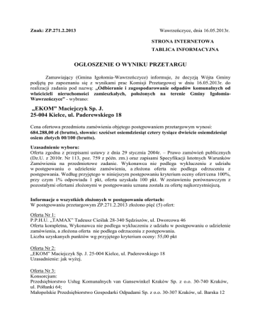 Znak: ZP.271.2.2013 Wawrzeńczyce, dnia 16.05.2013r. STRONA INTERNETOWA TABLICA INFORMACYJNA OGŁOSZENIE O WYNIKU PRZETARGU Zamawiający (Gmina Igołomia-Wawrzeńczyce) informuje, że decyzją Wójta Gminy podjętą po zapoznaniu się z wynikami prac Komisji Przetargowej w dniu 16.05.2013r. do realizacji zadania pod nazwą: „Odbieranie i zagospodarowanie odpadów komunalnych od właścicieli nieruchomości zamieszkałych, położonych na terenie Gminy IgołomiaWawrzeńczyce” - wybrano: „EKOM” Maciejczyk Sp. J. 25-004 Kielce, ul. Paderewskiego 18 Cena ofertowa przedmiotu zamówienia objętego postępowaniem przetargowym wynosi: 684.288,00 zł (brutto), słownie: sześćset osiemdziesiąt cztery tysiące dwieście osiemdziesiąt osiem złotych 00/100 (brutto). Uzasadnienie wyboru: Oferta zgodna z przepisami ustawy z dnia 29 stycznia 2004r. – Prawo zamówień publicznych (Dz.U. z 2010r. Nr 113, poz. 759 z późn. zm.) oraz zapisami Specyfikacji Istotnych Warunków Zamówienia na przedmiotowe zadanie. Wykonawca nie podlega wykluczeniu z udziału w postępowaniu o udzielenie zamówienia, a złożona oferta nie podlega odrzuceniu z postępowania. Według przyjętego w niniejszym postępowaniu kryterium oceny ofert/cena 100%, przy czym 1% odpowiada 1 pkt, oferta uzyskała 100 pkt. W zestawieniu porównawczym z pozostałymi ofertami złożonymi w postępowaniu uznana została za ofertę najkorzystniejszą. Informacje o wszystkich złożonych w postępowaniu ofertach: W postępowaniu przetargowym ZP.271.2.2013 złożono pięć (5) ofert: Oferta Nr 1: P.P.H.U. „TAMAX” Tadeusz Cieślak 28-340 Sędziszów, ul. Dworcowa 46 Oferta kompletna, Wykonawca nie podlega wykluczeniu z udziału w postępowaniu o udzielenie zamówienia, a złożona oferta nie podlega odrzuceniu z postępowania. Liczba uzyskanych punktów wg przyjętego kryterium oceny: 55,00 pkt Oferta Nr 2: „EKOM” Maciejczyk Sp. J. 25-004 Kielce, ul. Paderewskiego 18 Uzasadnienie: jak wyżej. Oferta Nr 3: Konsorcjum: Przedsiębiorstwo Usług Komunalnych van Gansewinkel Kraków Sp. z o.o. 30-740 Kraków, ul. Półłanki 64; Małopolskie Przedsiębiorstwo Gospodarki Odpadami Sp. z o.o. 30-307 Kraków, ul. Barska 12 Oferta kompletna, Wykonawca nie podlega wykluczeniu z udziału w postępowaniu o udzielenie zamówienia, a złożona oferta nie podlega odrzuceniu z postępowania. Liczba uzyskanych punktów wg przyjętego kryterium oceny: 63,14 pkt Oferta Nr 4: Przedsiębiorstwo Wielobranżowe MIKI Mieczysław Jakubowski, 30-841 Kraków, ul. Nad Drwiną 33 Oferta kompletna, Wykonawca nie podlega wykluczeniu z udziału w postępowaniu o udzielenie zamówienia, a złożona oferta nie podlega odrzuceniu z postępowania. Liczba uzyskanych punktów wg przyjętego kryterium oceny: 69,39 pkt Oferta Nr 5: SITA MAŁOPOLSKA Sp. z o.o. 30-731 Kraków, ul. Kosiarzy 5A Oferta kompletna, Wykonawca nie podlega wykluczeniu z udziału w postępowaniu o udzielenie zamówienia, a złożona oferta nie podlega odrzuceniu z postępowania. Liczba uzyskanych punktów wg przyjętego kryterium oceny: 57,60 pkt Termin zawarcia umowy: nie wcześniej niż 27.05.2013r.