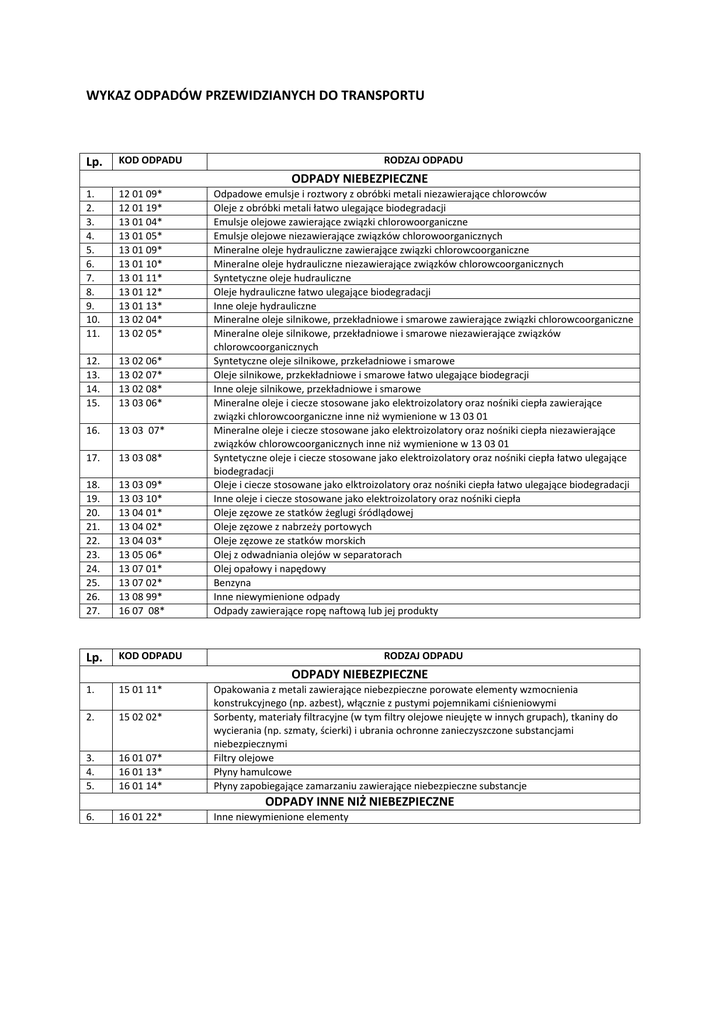 WYKAZ ODPADÓW PRZEWIDZIANYCH DO TRANSPORTU Lp. KOD ODPADU RODZAJ ODPADU 1. 2. 3. 4. 5. 6. 7. 8. 9. 10. 11. 12 01 09* 12 01 19* 13 01 04* 13 01 05* 13 01 09* 13 01 10* 13 01 11* 13 01 12* 13 01 13* 13 02 04* 13 02 05* 12. 13. 14. 15. 13 02 06* 13 02 07* 13 02 08* 13 03 06* 16. 13 03 07* 17. 13 03 08* 18. 19. 20. 21. 22. 23. 24. 25. 26. 27. 13 03 09* 13 03 10* 13 04 01* 13 04 02* 13 04 03* 13 05 06* 13 07 01* 13 07 02* 13 08 99* 16 07 08* Lp. KOD ODPADU 1. 15 01 11* 2. 15 02 02* 3. 4. 5. 16 01 07* 16 01 13* 16 01 14* Opakowania z metali zawierające niebezpieczne porowate elementy wzmocnienia konstrukcyjnego (np. azbest), włącznie z pustymi pojemnikami ciśnieniowymi Sorbenty, materiały filtracyjne (w tym filtry olejowe nieujęte w innych grupach), tkaniny do wycierania (np. szmaty, ścierki) i ubrania ochronne zanieczyszczone substancjami niebezpiecznymi Filtry olejowe Płyny hamulcowe Płyny zapobiegające zamarzaniu zawierające niebezpieczne substancje 6. 16 01 22* Inne niewymienione elementy ODPADY NIEBEZPIECZNE Odpadowe emulsje i roztwory z obróbki metali niezawierające chlorowców Oleje z obróbki metali łatwo ulegające biodegradacji Emulsje olejowe zawierające związki chlorowoorganiczne Emulsje olejowe niezawierające związków chlorowoorganicznych Mineralne oleje hydrauliczne zawierające związki chlorowcoorganiczne Mineralne oleje hydrauliczne niezawierające związków chlorowcoorganicznych Syntetyczne oleje hudrauliczne Oleje hydrauliczne łatwo ulegające biodegradacji Inne oleje hydrauliczne Mineralne oleje silnikowe, przekładniowe i smarowe zawierające związki chlorowcoorganiczne Mineralne oleje silnikowe, przekładniowe i smarowe niezawierające związków chlorowcoorganicznych Syntetyczne oleje silnikowe, przkeładniowe i smarowe Oleje silnikowe, przkekładniowe i smarowe łatwo ulegające biodegracji Inne oleje silnikowe, przekładniowe i smarowe Mineralne oleje i ciecze stosowane jako elektroizolatory oraz nośniki ciepła zawierające związki chlorowcoorganiczne inne niż wymienione w 13 03 01 Mineralne oleje i ciecze stosowane jako elektroizolatory oraz nośniki ciepła niezawierające związków chlorowcoorganicznych inne niż wymienione w 13 03 01 Syntetyczne oleje i ciecze stosowane jako elektroizolatory oraz nośniki ciepła łatwo ulegające biodegradacji Oleje i ciecze stosowane jako elktroizolatory oraz nośniki ciepła łatwo ulegające biodegradacji Inne oleje i ciecze stosowane jako elektroizolatory oraz nośniki ciepła Oleje zęzowe ze statków żeglugi śródlądowej Oleje zęzowe z nabrzeży portowych Oleje zęzowe ze statków morskich Olej z odwadniania olejów w separatorach Olej opałowy i napędowy Benzyna Inne niewymienione odpady Odpady zawierające ropę naftową lub jej produkty RODZAJ ODPADU ODPADY NIEBEZPIECZNE ODPADY INNE NIŻ NIEBEZPIECZNE
