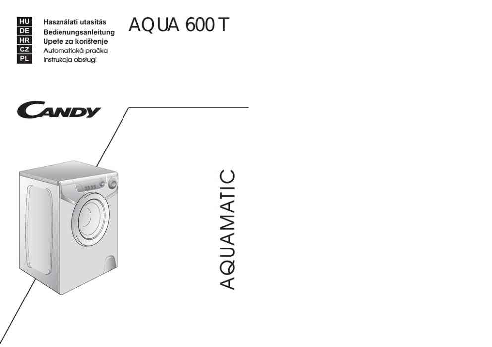 HU DE HR CZ PL Használati utasítás Bedienungsanleitung Upete za kori‰tenje Automatická praöka Instrukcja obsäugi AQUA 600 T HU 2 DE KÖSZÖNETNYILVÁNÍTÁS HERZLICHEN GLÜCKWUNSCH! Ennek a Candy háztartási készüléknek a megvásárlásával Ön megmutatta, hogy nem fogadja el a kompromisszumokat: csakis a legjobbat akarja. A Candy örömmel mutatja be Önnek új mosógépét, amely több éves kutatás és a vevŒkkel fennálló közvetlen kapcsolat révén szerzett piaci tapasztalat eredménye. Ön a mosógép által nyújtott minŒség, tartósság és kiváló teljesítmény mellett döntött. A Candy sokféle más háztartási gépet is kínál: mosógépeket, mosogatógépeket, mosószárítógépeket, tızhelyeket, mikrohullámú sütŒket. Hagyományos sütŒket és tızhelylapokat, valamint hıtŒ- és fagyasztógépeket. A Candy termékek teljes katalógusát kérje helyi kiskereskedŒjétŒl. Kérjük, hogy figyelmesen olvassa el ezt a füzetet, mert fontos útmutatásokkal szolgál a készülék biztonságos telepítésével, használatával és karbantartásával kapcsolatban, továbbá hasznos tanácsokat ad a legkedvezŒbb eredmények eléréséhez a mosógép használata során. Kérjük, tartsa ezt a tájékoztató füzetet biztonságos helyen, hogy a késŒbbiek során is bármikor belelapozhasson. A Candy vagy a VevŒszolgálat felkeresésekor mindig adja meg a típust, a típusszámot és a G-számot (ha alkalmazható, lásd a készülék adatlapját). Mit dem Kauf dieses Candy Elektrogerätes haben Sie bewiesen, daß Sie stets nur das Beste wählen - ohne Kompromisse. Candy freut sich, Ihnen diese neue Waschmaschine anbieten zu können. Sie ist das Ergebnis jahrelanger Forschung und einer Markterfahrung, die im ständigen direkten Kontakt mit dem Verbraucher gereift ist. Sie haben mit diesem Gerät Qualität, lange Lebensdauer und einen hohen Leistungsstandard gewählt. Candy bietet Ihnen darüber hinaus eine breite Palette weiterer elektrischer Haushaltsgeräte: Waschmaschinen, Geschirrspüler, Wäschetrockner, Elektroherde, Mikrowellenherde, Backöfen und Kochfelder, Kühl - und Gefrierschränke. Fragen Sie Ihren Fachhändlernach dem kompletten Candy Katalog. Lesen Sie bitte aufmerksam die Anweisungen, die Sie in diesem Heft finden. Sie finden dort wichtige Hinweise zur sicheren Installation, zur Bedienung, zur Pflege und zur optimalen Verwendung der Waschmaschine. Bewahren Sie das Heft für eine spätere Nutzung gut auf. Geben Sie bitte in allen Mitteilungen an Candy oder an Ihre zuständige Kundendienststelle stets das Modell, die Nummer und die G-Nummer (falls vorhanden),- also praktisch alle Angaben des Typenschildes -, an. CZ HR âESTITAMO! Kupnjom ovog Candy proizvoda pokazali ste da ne Ïelite prihvatiti sporazumno rje‰enje, veç Ïelite najbolje. Candy ima zadovoljstvo da Vam moÏe ponuditi ovu novu perilicu rublja, koja je rezultat vi‰egodi‰njeg istraÏivanja i iskustva na trÏi‰tu, u neposrednom dodiru sa potro‰aãima. Izabrali ste kvalitetu, trajnost i osebujne znaãajke koje ovaj uredjaj nudi. Osim perilice rublja koju ste izabrali, Candy se ponosi ‰irokim izborom uredjaja za domaçinstvo: perilicama sudja, perilicama za pranje i su‰enje rublja, ‰tednjacima, mikrovalnim peçnicama, tradicionalnim peçnicama, grijaãim ploãama, hladnjacima i ledenicama. PL ÚVOD GRATULACJE VáÏen˘ zákazníku, Kupujåc sprzët AGD firmy Candy dowiodäeé, ãe nie akceptujesz kompromisów i chcesz mieç to co najlepsze. Dûkujeme Vám, Ïe jste si zakoupil v˘robek spoleãnosti CANDY âR s.r.o. Pfied prvním pouÏitím v˘robku si pozornû pfieãtûte pfiiloÏen˘ ãesk˘ návod , kter˘ firma CANDY âR s.r.o. dodává, a dÛslednû se jím fiiìte. Návod, kter˘ jste k v˘robku obdrÏel, vychází z v‰eobecné v˘robkové fiady a z tohoto dÛvodu mÛÏe dojít k situaci, Ïe nûkteré funkce, ovládací prvky a pfiíslu‰enství nejsou urãeny pro Vበv˘robek. Dûkujeme za pochopení. Firma Candy ma przyjemnoéç przedstawiç nowå pralkë automatycznå, która jest rezultatem lat poszukiwañ i doéwiadczeñ nabytych w bezpoérednim kontakcie z konsumentem. Wybraäeé jakoéç, trwaäoéç i wysokå sprawnoéç - cechy charakteryzujåce pralkë Candy. Firma Candy oferuje takãe szeroki asortyment innych urzådzeñ AGD, takich jak: zmywarki do naczyñ, pralkosuszarki, kuchenki, kuchenki mikrofalowe, tradycyjne piecyki i kuchenki, a takãe lodówki i zamraãarki. TraÏite od svog prodavaãa najnoviji katalog Candy proizvoda. Poproé Twojego sprzedawcë o kompletny katalog produktów firmy Candy. Upotreba ove nove perilice je jednostavna, ali Vas molimo da paÏljivo proãitate UPUTE ZA KORI·TENJE sadrÏane u ovoj knjiÏici i da ih u potpunosti po‰tujete. One Vam daju vaÏne podatke u svezi sigurnog postavljanja, kori‰tenja i odrÏavanja perilice, te korisne savjete za postizanje najboljih rezultata pranja. Przeczytaj uwaãnie niniejszå instrukcjë, gdyã zawiera ona wskazówki dotyczåce bezpiecznej instalacji, uãytkowania i konserwacji, oraz kilka praktycznych porad pozwalajåcych zoptymalizowaç sposób uãytkowania pralki. âuvajte paÏljivo ovu knjiÏicu, jer bi Vam ubuduçe jo‰ mogla zatrebati. Kada bi u sluãaju kvara perilice, morali pozvati jednog od na‰ih servisera, obavezno mu recite oznaku modela, broj perilice i broj G, ako je naveden na ploãici s tehniãkim podacima, koja je priãvr‰çena na perilici. Zachowaj niniejszå instrukcjë w celu póãniejszej konsultacji. Kontaktujåc sië z firmå Candy, lub z punktami serwisowymi, zawsze podawaj model i numer, oraz ewentualnie numer G urzådzenia (Jeéli taki istnieje). Praktycznie wszystkie informacje så obwiedzione ramkå narysunku obok. 3 HU 4 HR DE TARTALOMJEGYZÉK INHALT Bevezetés Einleitung Általános szállítási tájékoztató Allgemeine Hinweise zur Lieferung Garancia FEJEZET KAPITEL POGLAVLJE KAPITOLA ROZDZIA Ä PL CZ SADRÎAJ OBSAH : SPIS TREÉCI Uvod