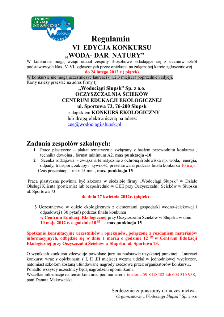 Regulamin VI EDYCJA KONKURSU „WODA- DAR NATURY” W konkursie mogą wziąć udział zespoły 3-osobowe składające się z uczniów szkół podstawowych klas IV-VI, zgłoszonych przez opiekuna na załączonej karcie zgłoszeniowej do 24 lutego 2012 r.( piątek) W konkursie nie mogą uczestniczyć laureaci ( 1,2,3 miejsce) poprzednich edycji. Karty należy przesłać na adres firmy tj. „Wodociągi Słupsk” Sp. z o.o. OCZYSZCZALNIA ŚCIEKÓW CENTRUM EDUKACJI EKOLOGICZNEJ ul. Sportowa 73, 76-200 Słupsk z dopiskiem KONKURS EKOLOGICZNY lub drogą elektroniczną na adres: [email protected] Zadania zespołów szkolnych: Prace plastyczne – plakat tematycznie związany z hasłem przewodnim konkursu , technika dowolna , format minimum A2. max punktacja -10 2 Scenka rodzajowa - związana tematycznie z ochroną środowiska np. woda, energia, odpady, transport, zakupy i żywność, prezentowana podczas finału konkursu 10 maja Czas prezentacji – max 15 min , max. punktacja 15 1 Praca plastyczna powinna być złożona w siedzibie firmy „Wodociągi Słupsk” w Dziale Obsługi Klienta (portiernia) lub bezpośrednio w CEE przy Oczyszczalni Ścieków w Słupsku ul. Sportowa 73 do dnia 27 kwietnia 2012r. (piątek) 3 Uczestnictwo w quizie ekologicznym z elementami gospodarki wodno-ściekowej i odpadowej ( 30 pytań) podczas finału konkursu w Centrum Edukacji Ekologicznej przy Oczyszczalni Ścieków w Słupsku w dniu 10 maja 2012 r. o godzinie 10 00 - max punktacja 15 Spotkanie konsultacyjne uczestników i opiekunów, połączone z rozdaniem materiałów informacyjnych, odbędzie się w dniu 1 marca o godzinie 12 00 w Centrum Edukacji Ekologicznej przy Oczyszczalni Ścieków w Słupsku ul. Sportowa 73. O wynikach konkursu zdecyduje powołane jury na podstawie uzyskanej punktacji .Laureaci konkursu wraz z opiekunami ( I, II ,III miejsce) wezmą udział w jednodniowej wycieczce, natomiast szkołom zostaną ufundowane nagrody rzeczowe przez organizatorów konkursu.. Ponadto wszyscy uczestnicy będą nagrodzeni upominkami. Wszelkie informacje na temat konkursu pod numerem telefonu 59 8418482 lub 603 315 938, pani Danuta Makowelska Serdecznie zapraszamy do uczestnictwa. Organizatorzy „Wodociągi Słupsk” Sp. z o.o KARTA ZGŁOSZENIOWA DO KONKURSU EKOLOGICZNEGO „WODA-DAR NATURY” Pełna nazwa szkoły z adresem: ………………………………………………………………………………………………… ………………………………………………………………………………………………… ………………………………………………………………………………………………… Telefon/fax: ………………………………………………………………………………………………… Dane opiekuna zgłoszonej grupy Imię i nazwisko:……………………………………………………………………………. Telefon kontaktowy: ………………………………………………………………………. Skład zespołu szkolnego ( prosimy o wpisy czytelnie drukowanymi literami): 1) ………………………………………………………... 2) ………………………………………………………... 3) …………………………………………………........... Oświadczamy, że zapoznaliśmy się z regulaminem konkursu oraz, że akceptujemy jego warunki. …………………… data i podpis ……………………….. pieczęć szkoły