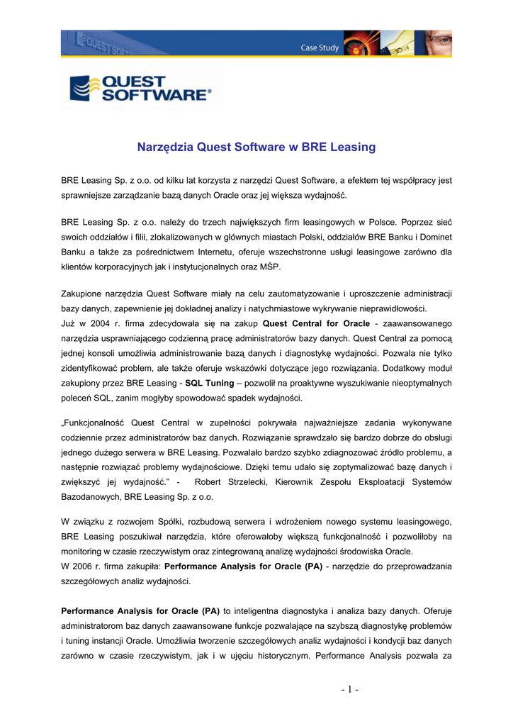 Narzędzia Quest Software w BRE Leasing BRE Leasing Sp. z o.o. od kilku lat korzysta z narzędzi Quest Software, a efektem tej współpracy jest sprawniejsze zarządzanie bazą danych Oracle oraz jej większa wydajność. BRE Leasing Sp. z o.o. należy do trzech największych firm leasingowych w Polsce. Poprzez sieć swoich oddziałów i filii, zlokalizowanych w głównych miastach Polski, oddziałów BRE Banku i Dominet Banku a także za pośrednictwem Internetu, oferuje wszechstronne usługi leasingowe zarówno dla klientów korporacyjnych jak i instytucjonalnych oraz MŚP. Zakupione narzędzia Quest Software miały na celu zautomatyzowanie i uproszczenie administracji bazy danych, zapewnienie jej dokładnej analizy i natychmiastowe wykrywanie nieprawidłowości. Już w 2004 r. firma zdecydowała się na zakup Quest Central for Oracle - zaawansowanego narzędzia usprawniającego codzienną pracę administratorów bazy danych. Quest Central za pomocą jednej konsoli umożliwia administrowanie bazą danych i diagnostykę wydajności. Pozwala nie tylko zidentyfikować problem, ale także oferuje wskazówki dotyczące jego rozwiązania. Dodatkowy moduł zakupiony przez BRE Leasing - SQL Tuning – pozwolił na proaktywne wyszukiwanie nieoptymalnych poleceń SQL, zanim mogłyby spowodować spadek wydajności. „Funkcjonalność Quest Central w zupełności pokrywała najważniejsze zadania wykonywane codziennie przez administratorów baz danych. Rozwiązanie sprawdzało się bardzo dobrze do obsługi jednego dużego serwera w BRE Leasing. Pozwalało bardzo szybko zdiagnozować źródło problemu, a następnie rozwiązać problemy wydajnościowe. Dzięki temu udało się zoptymalizować bazę danych i zwiększyć jej wydajność.” - Robert Strzelecki, Kierownik Zespołu Eksploatacji Systemów Bazodanowych, BRE Leasing Sp. z o.o. W związku z rozwojem Spółki, rozbudową serwera i wdrożeniem nowego systemu leasingowego, BRE Leasing poszukiwał narzędzia, które oferowałoby większą funkcjonalność i pozwoliłoby na monitoring w czasie rzeczywistym oraz zintegrowaną analizę wydajności środowiska Oracle. W 2006 r. firma zakupiła: Performance Analysis for Oracle (PA) - narzędzie do przeprowadzania szczegółowych analiz wydajności. Performance Analysis for Oracle (PA) to inteligentna diagnostyka i analiza bazy danych. Oferuje administratorom baz danych zaawansowane funkcje pozwalające na szybszą diagnostykę problemów i tuning instancji Oracle. Umożliwia tworzenie szczegółowych analiz wydajności i kondycji baz danych zarówno w czasie rzeczywistym, jak i w ujęciu historycznym. Performance Analysis pozwala za -1- pomocą technologii IntelliProfile na inteligentne ustalenie linii bazowej wydajności. Po jej przekroczeniu, PA pokazuje analizę problemów i rekomendowane działania w celu natychmiastowej poprawy wydajności bazy danych. Wiele problemów wydajnościowych baz danych jest spowodowanych przez wprowadzane zmiany, PA automatycznie śledzi wszystkie zmiany i ustala ich wpływ na wydajność. Dzięki stałemu monitoringowi 24x7 analizowane są informacje dotyczące wydajności środowiska bazodanowego, co pozwala natychmiast wykryć nieprawidłowości i anomalie. Dzięki przejrzystemu graficznemu interfejsowi zarządzanie bazą danych i jej tuning za pomocą PA stały się proste i intuicyjne. „Performance Analysis znacznie przyspiesza i ułatwia tuning bazy danych. Część porad w przypadku wykrycia spadku wydajności, można wykorzystać automatycznie i z natychmiastowym efektem. Dodatkowo bez potrzeby zagłębiania się w przyczyny problemów, ponieważ PA robi to za administratora. Kiedy wdrażaliśmy nowy system leasingowy, pojawiły się problemy z zapytaniami SQL. Performance Analysis pokazał jasno i przejrzyście, które zapytania powodowały błędy na bazie danych.” - Robert Strzelecki, Kierownik Zespołu Eksploatacji Systemów Bazodanowych, BRE Leasing Sp. z o.o. Konsola Performance Analysis Dodatkowymi narzędziami Quest Software zakupionymi w 2006 r. przez BRE Leasing Sp. z o.o. były rozwiązania do poprawy zarządzania aplikacjami windowsowymi, a w szczególności wspomagające pracę systemu poczty e-mail, który jest ważnym kanałem komunikacji wewnętrznej i zewnętrznej Firmy. Są to Quest MessageStats (450 licencji) oraz Quest Group Policy Extensions for Desktops (360 licencji). Quest MessageStats dostarcza kompletnych informacji na temat całego środowiska Microsoft Exchange. Pomaga administratorom lepiej zarządzać systemem pocztowym, wykorzystaniem zasobów serwera i wydajnością. MessageStats mierzy ruch wiadomości e-mail w sieci, odstępstwa od polityki bezpieczeństwa, sprawdza także poziom usług SLA. Zarówno z perspektywy biznesowej, jak i technicznej, MessageStats wpływa na usprawnienie systemu pocztowego. Raporty, analizy i statystyki tworzone za pomocą MessageStats wspomagają pracę kadry zarządzającej i administratorów IT oraz pomagają w zapewnieniu zgodności pracy środowiska z wewnętrznymi i zewnętrznymi regulacjami. Drugie narzędzie: Quest Group Policy Extensions for Desktops pomaga administratorom efektywnie zarządzać obiektami GPO i automatyzuje zarządzanie stacjami roboczymi. Pozwala użytkownikom na szybkie zmiany hasła, łatwiejsze zarządzanie i upgrade profili w MS Outlook. -2- Administratorzy mogą zarządzać profilami użytkowników i ustawieniami konfiguracyjnymi (umożliwia dowolne zmiany ustawień m.in. konfigurację aplikacji MS, np. Outlook, Word czy Excel) bez konieczności wprowadzania zmian na każdym komputerze użytkownika. W maju 2007 r. BRE Leasing zakupił kolejne narzędzie Quest Software: Spotlight on Active Directory, umożliwiające szczegółową analizę procesów zachodzących w środowisku AD. Narzędzie to będzie wykorzystywane przez administratorów do przeprowadzania w czasie rzeczywistym pełnej diagnostyki oraz wykrywania i rozwiązywania problemów wydajnościowych zw