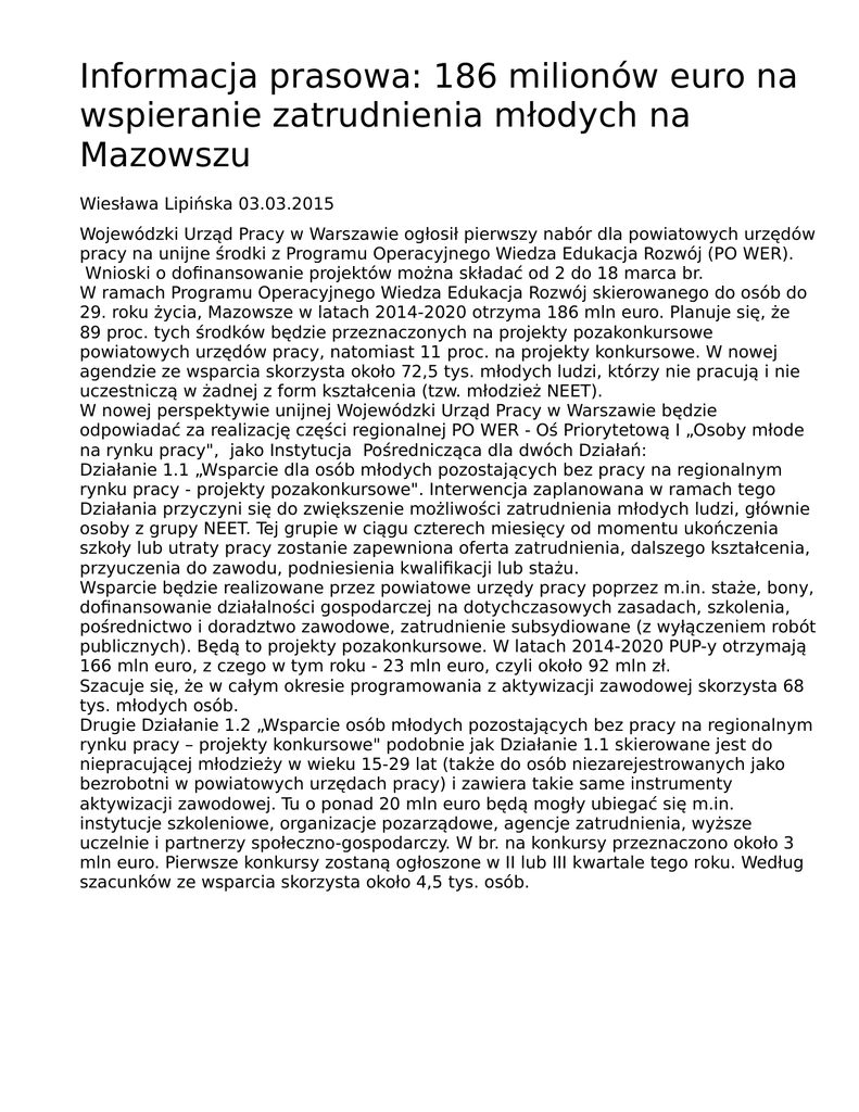 Informacja prasowa: 186 milionów euro na wspieranie zatrudnienia młodych na Mazowszu Wiesława Lipińska 03.03.2015 Wojewódzki Urząd Pracy w Warszawie ogłosił pierwszy nabór dla powiatowych urzędów pracy na unijne środki z Programu Operacyjnego Wiedza Edukacja Rozwój (PO WER). Wnioski o dofinansowanie projektów można składać od 2 do 18 marca br. W ramach Programu Operacyjnego Wiedza Edukacja Rozwój skierowanego do osób do 29. roku życia, Mazowsze w latach 2014-2020 otrzyma 186 mln euro. Planuje się, że 89 proc. tych środków będzie przeznaczonych na projekty pozakonkursowe powiatowych urzędów pracy, natomiast 11 proc. na projekty konkursowe. W nowej agendzie ze wsparcia skorzysta około 72,5 tys. młodych ludzi, którzy nie pracują i nie uczestniczą w żadnej z form kształcenia (tzw. młodzież NEET). W nowej perspektywie unijnej Wojewódzki Urząd Pracy w Warszawie będzie odpowiadać za realizację części regionalnej PO WER - Oś Priorytetową I „Osoby młode na rynku pracy", jako Instytucja Pośrednicząca dla dwóch Działań: Działanie 1.1 „Wsparcie dla osób młodych pozostających bez pracy na regionalnym rynku pracy - projekty pozakonkursowe". Interwencja zaplanowana w ramach tego Działania przyczyni się do zwiększenie możliwości zatrudnienia młodych ludzi, głównie osoby z grupy NEET. Tej grupie w ciągu czterech miesięcy od momentu ukończenia szkoły lub utraty pracy zostanie zapewniona oferta zatrudnienia, dalszego kształcenia, przyuczenia do zawodu, podniesienia kwalifikacji lub stażu. Wsparcie będzie realizowane przez powiatowe urzędy pracy poprzez m.in. staże, bony, dofinansowanie działalności gospodarczej na dotychczasowych zasadach, szkolenia, pośrednictwo i doradztwo zawodowe, zatrudnienie subsydiowane (z wyłączeniem robót publicznych). Będą to projekty pozakonkursowe. W latach 2014-2020 PUP-y otrzymają 166 mln euro, z czego w tym roku - 23 mln euro, czyli około 92 mln zł. Szacuje się, że w całym okresie programowania z aktywizacji zawodowej skorzysta 68 tys. młodych osób. Drugie Działanie 1.2 „Wsparcie osób młodych pozostających bez pracy na regionalnym rynku pracy – projekty konkursowe" podobnie jak Działanie 1.1 skierowane jest do niepracującej młodzieży w wieku 15-29 lat (także do osób niezarejestrowanych jako bezrobotni w powiatowych urzędach pracy) i zawiera takie same instrumenty aktywizacji zawodowej. Tu o ponad 20 mln euro będą mogły ubiegać się m.in. instytucje szkoleniowe, organizacje pozarządowe, agencje zatrudnienia, wyższe uczelnie i partnerzy społeczno-gospodarczy. W br. na konkursy przeznaczono około 3 mln euro. Pierwsze konkursy zostaną ogłoszone w II lub III kwartale tego roku. Według szacunków ze wsparcia skorzysta około 4,5 tys. osób.