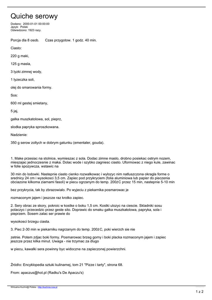 Quiche serowy Dodano: 2000-01-01 00:00:00 Język: Polski Odwiedzono: 1923 razy. Porcja dla 8 osob. Czas przygotow. 1 godz. 40 min. Ciasto: 220 g maki, 125 g masla, 3 lyzki zimnej wody, 1 lyzeczka soli, olej do smarowania formy. Sos: 600 ml gestej smietany, 5 jaj, galka muszkatolowa, sol, pieprz, slodka papryka sproszkowana. Nadzienie: 350 g serow zoltych w dobrym gatunku (ementaler, gouda). 1. Make przesiac na stolnice, wymieszac z sola. Dodac zimne maslo, drobno posiekac ostrym nozem, mieszajac jednoczesnie z maka. Dolac wode i szybko zagniesc ciasto. Uformowac z niego kule, zawinac w folie spozywcza, wstawic na 30 min do lodowki. Nastepnie ciasto cienko rozwalkowac i wylozyc nim natluszczona okragla forme o srednicy 24 cm i wysokosci 3,5 cm. Zapiec pod przykryciem (folia aluminiowa lub papier do pieczenia obciazone kilkoma ziarnami fasoli) w piecu ogrzanym do temp. 200żC przez 15 min, nastepnie 5-10 min bez przykrycia, tak by zbrazowialo. Po wyjeciu z piekarnika posmarowac je rozmaconym jajem i jeszcze raz krotko zapiec. 2. Sery obrac ze skory, pokroic w kostke o boku 1,5 cm. Kostki ulozyc na ciescie. Skladniki sosu polaczyc i przecedzic przez geste sito. Doprawic do smaku galka muszkatolowa, papryka, sola i pieprzem. Sosem zalac ser prawie do wysokosci brzegu ciasta. 3. Piec 2-30 min w piekarniku nagrzanym do temp. 200żC, poki wierzch sie nie zetnie. Potem zdjac boki formy. Posmarowac brzeg gorny i boki placka rozmaconym jajem i zapiec jeszcze przez kilka minut. Uwaga - nie trzymac za dlugo w piecu, kawalki sera powinny byc widoczne na zapieczonej powierzchni. Źródło: Encyklopedia sztuki kulinarnej, tom 21 "Pizze i tarty", strona 68. From: [email protected] (Radku's De Apaczu's) Wirtualna Kuchni@ Polska - http://kuchnia.now.pl przepis nr 5591, plik wygenerowano 2017.03.04 14:49 1z2 Wirtualna Kuchni@ Polska - http://kuchnia.now.pl przepis nr 5591, plik wygenerowano 2017.03.04 14:49 2z2