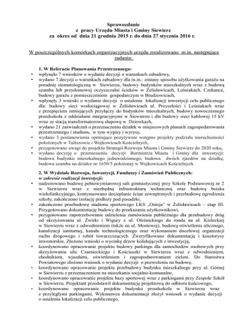 Sprawozdanie z pracy Urzędu Miasta i Gminy Siewierz za okres od dnia 21 grudnia 2015 r. do dnia 27 stycznia 2016 r. W poszczególnych komórkach organizacyjnych urzędu zrealizowano m.in. następujące zadania: • • • • • • • • • • • • • • 1. W Referacie Planowania Przestrzennego: wpłynęło 7 wniosków o wydanie decyzji o warunkach zabudowy, wydano 7 decyzji o warunkach zabudowy dla m.in.: zmiany sposobu użytkowania garażu na poradnię stomatologiczną w Siewierzu, budowy budynków mieszkalnych wraz z budową szamba lub przydomowej oczyszczalni ścieków w Żelisławicach, Leśniakach, Czekance, budowy garażu z pomieszczeniem gospodarczym w Brudzowicach, wpłynęły 3 wnioski o wydanie decyzji o ustaleniu lokalizacji inwestycji celu publicznego dla: budowy sieci wodociągowej w Żelisławicach ul. Przyszłości i Leśniakach wraz z przepięciem istniejących przyłączy do budynków mieszkalnych, budowy nowoczesnego przedszkola z oddziałami integracyjnymi w Siewierzu i dla budowy sieci kablowej 15 kV wraz ze stacją transformatorową słupową w Dziewkach, wydano 21 zaświadczeń o przeznaczeniu działek w miejscowych planach zagospodarowania przestrzennego i studium, w tym wypisy i wyrysy, wydano 3 postanowienia opiniujące pozytywnie wstępne projekty podziału nieruchomości położonych w Tuliszowie i Wojkowicach Kościelnych, przygotowano uwagi do projektu Strategii Rozwoju Miasta i Gminy Siewierz do 2020 roku, wydano decyzję o przeniesieniu decyzji Burmistrza Miasta i Gminy dla inwestycji: budowa budynku mieszkalnego jednorodzinnego, budowa dwóch zjazdów na działkę, budowa szamba na działce nr 1650/5 położonej w Wojkowicach Kościelnych. 2. W Wydziale Rozwoju, Inwestycji, Funduszy i Zamówień Publicznych: w zakresie realizacji inwestycji: nadzorowano budowę pełnowymiarowej sali gimnastycznej przy Szkole Podstawowej nr 2 w Siewierzu wraz z niezbędną infrastrukturą techniczną oraz budową boiska wielofunkcyjnego, kontynuowano docieplanie ścian zewnętrznych i przebudowę ogrodzenia szkoły, zakończono izolację podłoży pod posadzki, zakończono przebudowę stadionu sportowego LKS „Ostoja” w Żelisławicach – etap III. Przygotowano dokumentację budowy do przekazania użytkownikowi, przygotowano zapotrzebowanie udzielenia zamówienia publicznego dla przebudowy dróg od skrzyżowania ul. Żwirki i Wigury z ul. Oleśnickiego do ronda na ul. Kieleckiej w Siewierzu wraz z odwodnieniem (także na ul. Mostowej), budową oświetlenia ulicznego, kanalizacji sanitarnej, kanału technologicznego oraz wykonaniem docelowej organizacji ruchu drogowego i robót towarzyszących. Zweryfikowano dokumentację i kosztorysy inwestorskie. Złożono wnioski o wycinkę drzew kolidujących z inwestycją, koordynowano opracowanie projektu budowy parkingu dla samochodów osobowych przy skrzyżowaniu ulic Czarnieckiego i Kościuszki w Siewierzu wraz z odwodnieniem, chodnikiem, wjazdami, oświetleniem i zagospodarowaniem zieleni. Do Starostwa Powiatowego złożono wniosek o wydanie decyzji o pozwoleniu na budowę, koordynowano opracowanie projektu przebudowy budynku mieszkalnego przy ul. Górnej w Siewierzu z przeznaczeniem na mieszkania socjalno-komunalne, koordynowano opracowanie projektu bazy sportowej wraz z parkingami przy Zespole Szkół w Siewierzu. Projektant przedstawił dokumentację projektową do odbioru końcowego, koordynowano opracowanie projektu budynku przedszkola w Siewierzu wraz z przyległymi parkingami. Wykonawca dokumentacji złożył wniosek o wydanie decyzji o ustaleniu lokalizacji celu publicznego, • • • • • • • • • • • • • koordynowano opracowanie dokumentacji projektowej dla zadania: „Zagłębiowski Park Linearny – rewitalizacja obszaru funkcjonalnego doliny rzek Przemszy i Brynicy – Gmina Siewierz”, sporządzono sprawozdanie finansowe z realizacji zadań Wydziału Rozwoju, Inwestycji, Funduszy i Zamówień Publicznych za 2015 r. W ramach kompetencji wydziału w roku 2015 wydatkowano kwotę: 9.270.187,14 zł, a po stronie dochodów do budżetu gminy pozyskano kwotę: 3.564.024,78 zł. W zakresie pozyskiwania środków zewnętrznych: złożono wniosek o płatność i sprawozdanie z realizacji zadania Przebudowa dróg gminnych w ciągu ulic Oleśnickiego, Kopernika i Bytomskiej w Siewierzu, złożono wniosek o dofinansowanie zadania Budowa drogi gminnej w Kuźnicy Podleśnej w ramach PROW na lata 2014 – 2020, koordynowano prace związane z opracowaniem Strategii Rozwoju Gminy oraz Lokalnego Programu Rewitalizacji, złożono wniosek o dofinansowanie zadania Poprawa infrastruktury drogowej łączącej miejscowości Żelisławice i Leśniaki celem polepszenia warunków dynamicznego, zrównoważonego rozwoju społeczno-gospodarczego w Gminie Siewierz w ramach PROW na lata 2014 - 2020 z wnioskowaną kwotą dofinansowania 1.054.527,00 zł. Całkowity koszt zadania: 1.803.976,93 zł, do Urzędu Marszałkowskiego złożono poprawiony wniosek o dofinansowanie zadania Ochrona wód powierzchniowych Ziemi Siewierskiej – kompleksu Zalewu Przeczycko Siewierskiego poprzez budowę kanalizacji sanitarnej na Osiedlu Jezioro z wnioskowaną kwotą refundacji 508.704,97 zł oraz wniosek o dofinansowanie zadania Budowa kanalizacji sanitarnej dla miasta Siewierz – etap II (strona zachodnia), z wnioskowaną kwotą refundacji 2.911.427,60 zł. Wnioski będą rozpatrywane przez Instytucję Zarządzającą RPO WSL 2007 - 2013 do dofinansowania z listy rezerwowej, jako zadania zrealizowane w poprzedniej perspektywie finansowania UE, podpisano aneks nr 1 do umowy o dofinansowanie realizacji projektu Budowa drogi gminnej dla obsługi dzielnicy Siewierz Jeziorna w Siewierzu ze środków EFRR w ramach RPO WSL 2007 - 2013. Opracowano i złożono wniosek o płatność końcową zadania z wnioskowaną kwotą refundacji 501.516,50 zł, przygotowywano wniosek o dofinansowanie projektu Promowanie niskoemisyjnego transportu publ