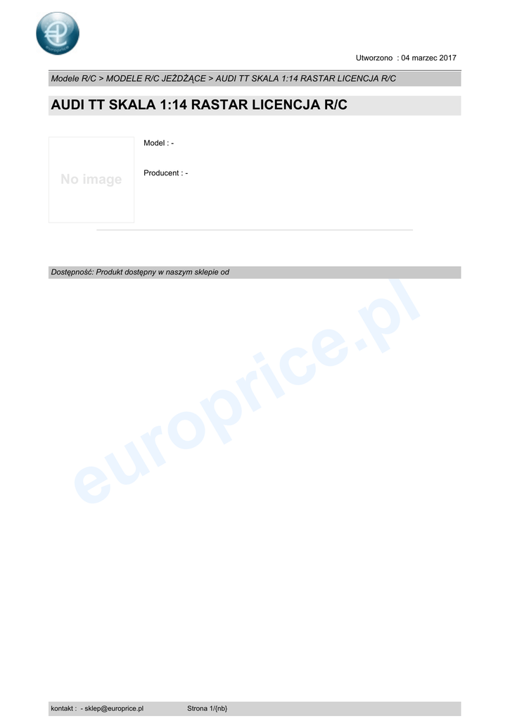 Utworzono : 04 marzec 2017 Modele R/C > MODELE R/C JEŻDŻĄCE > AUDI TT SKALA 1:14 RASTAR LICENCJA R/C AUDI TT SKALA 1:14 RASTAR LICENCJA R/C Model : - No image Producent : - l .p Dostępność: Produkt dostępny w naszym sklepie od o r u e kontakt : - [email protected] r p e ic Strona 1/{nb}